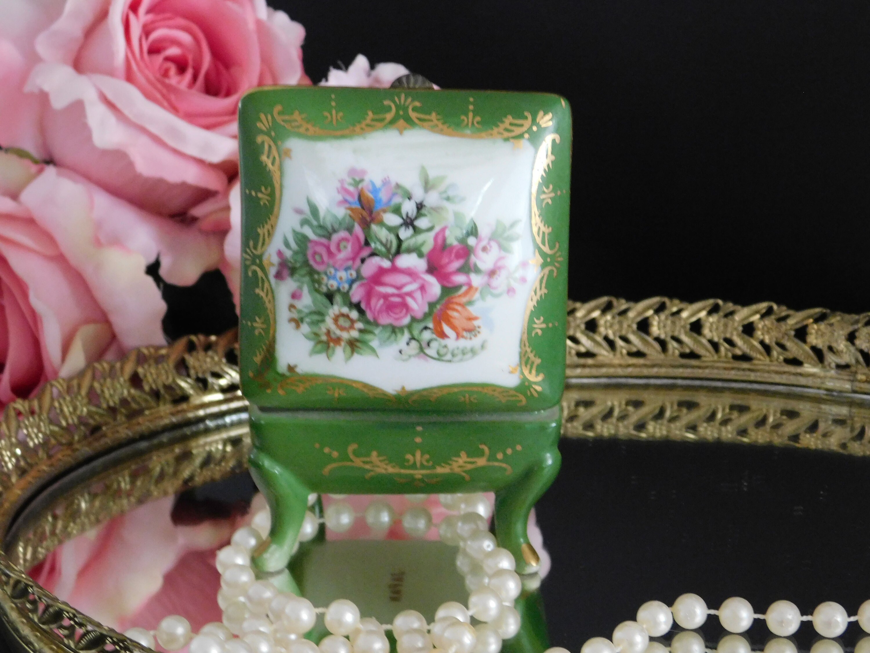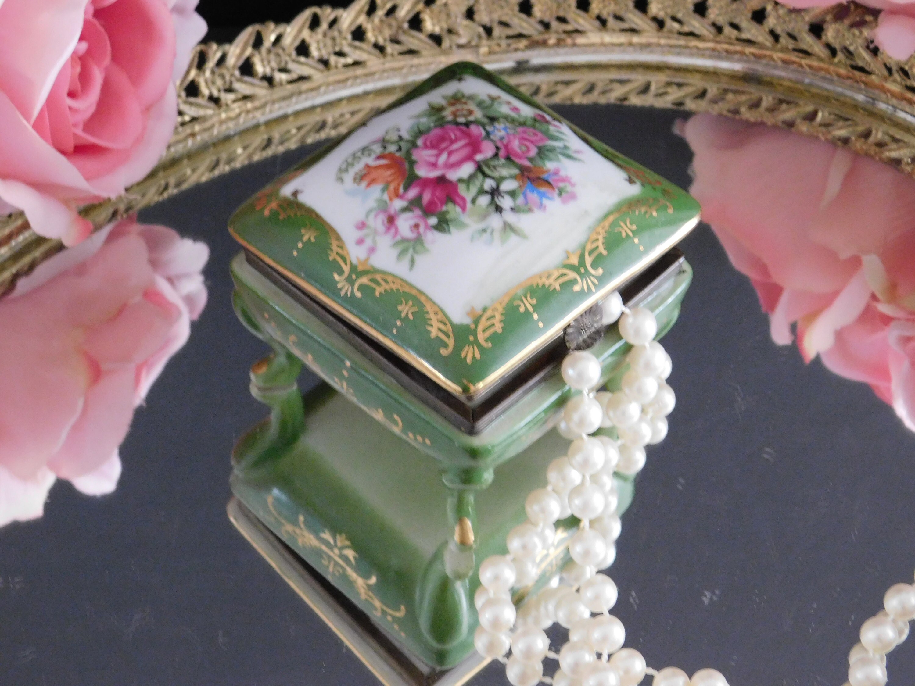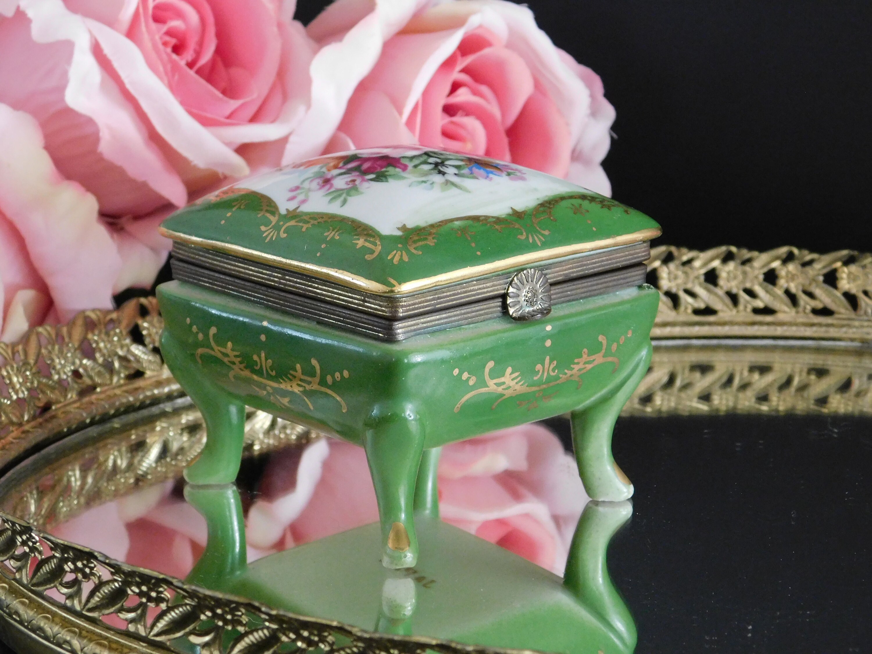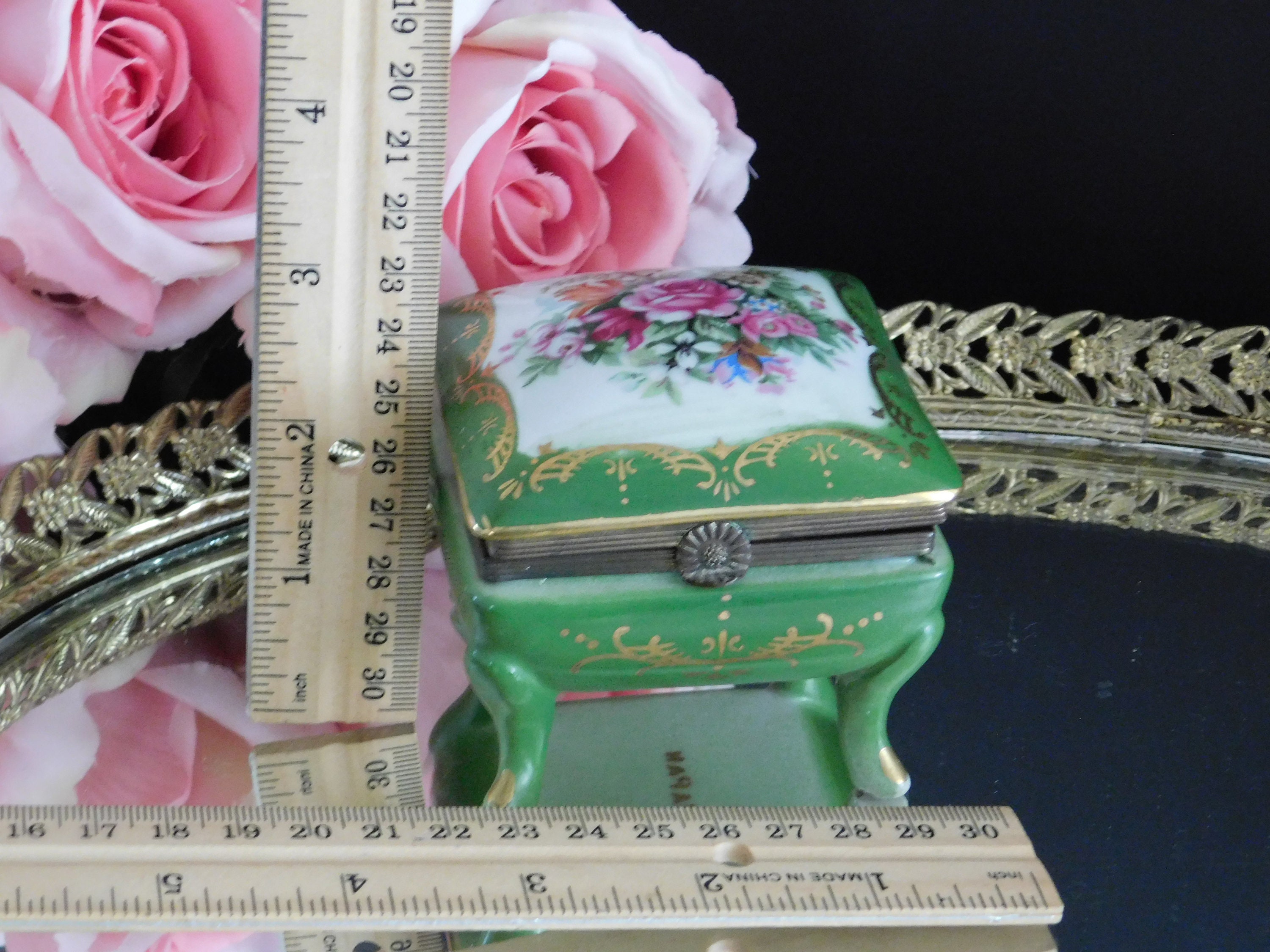 Porcelain jewelry box with hand painted pink roses, orange, white and pink flowers, all with green leaves. Whimsical gold lines on the lid, encircling the floral design. Jewelry box sits upon 4 legs with gold gilded splashes on the feet.
