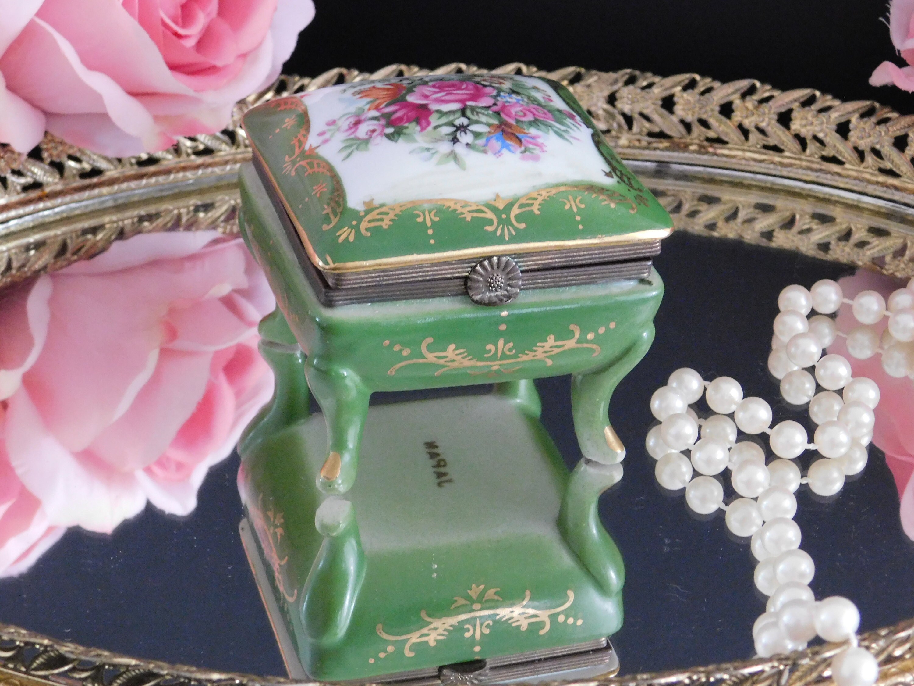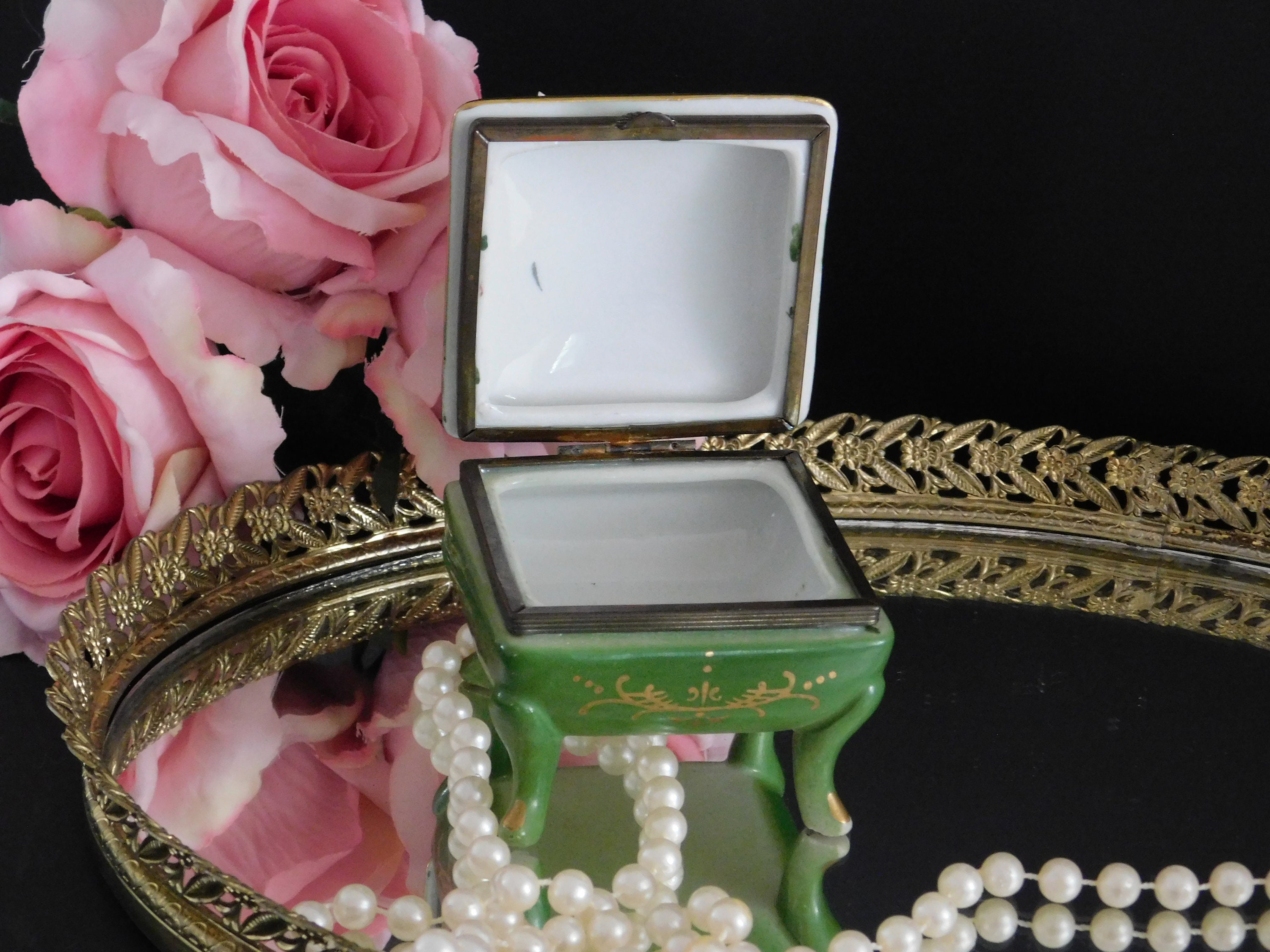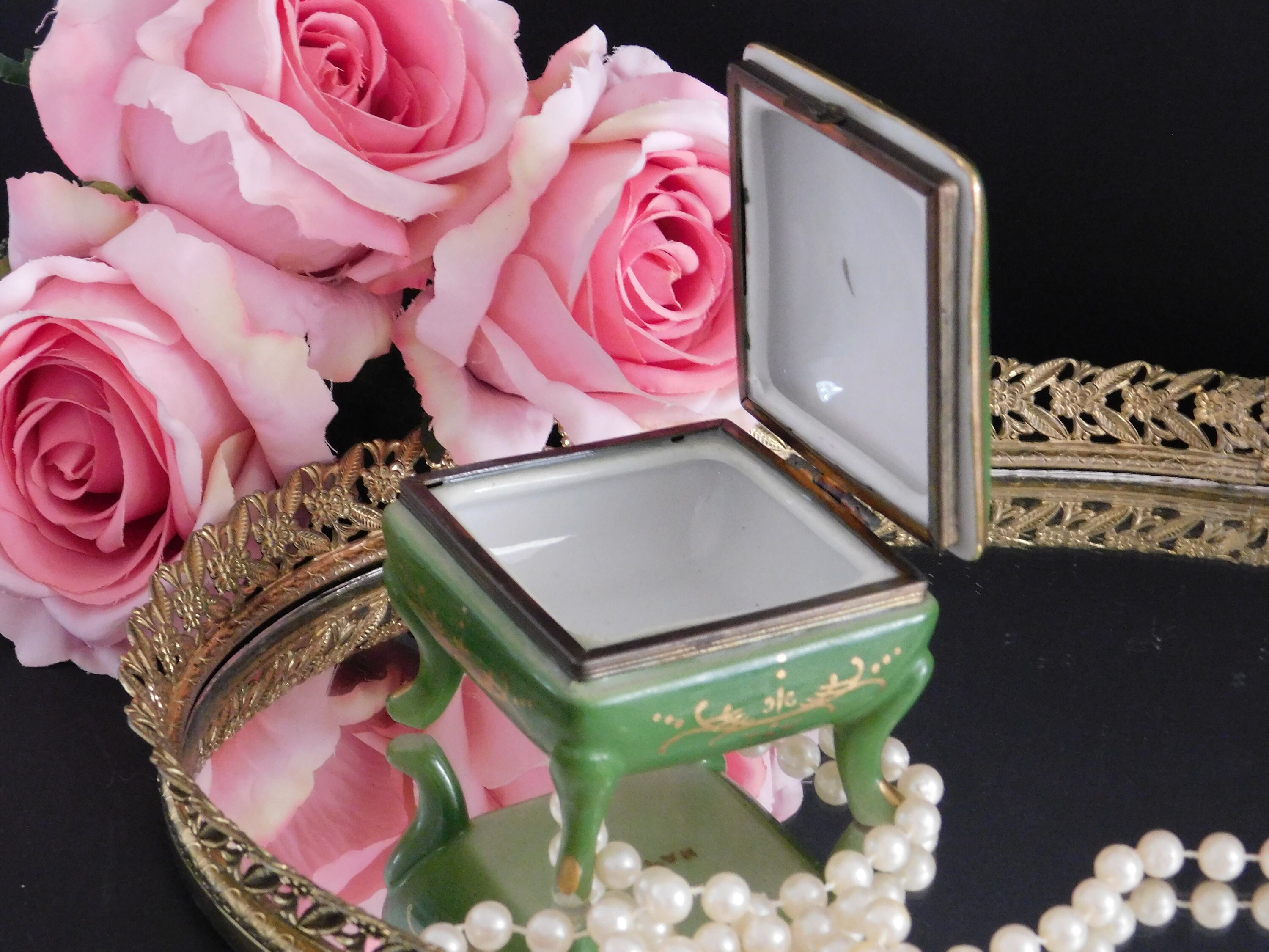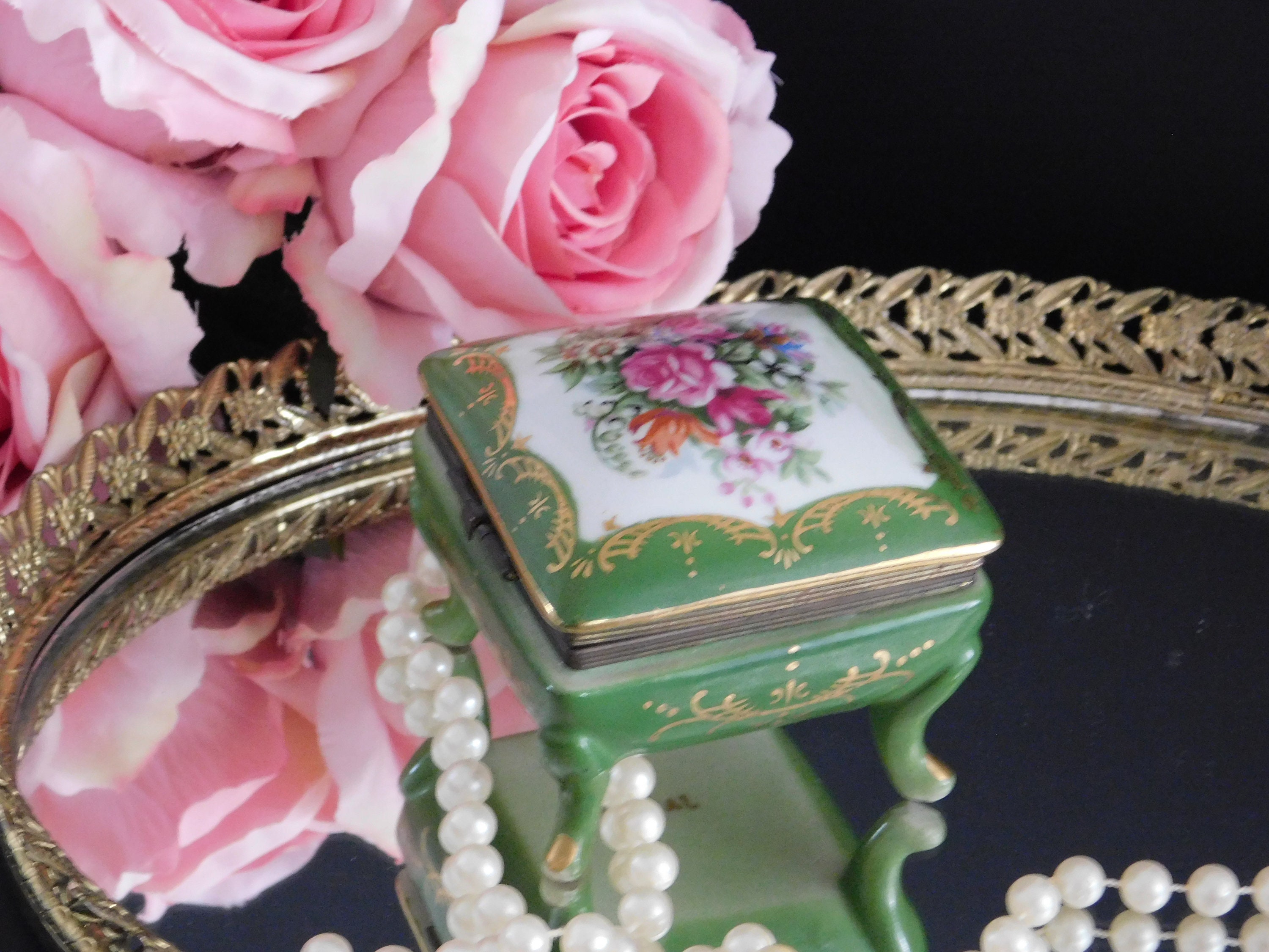 Porcelain jewelry box with hand painted pink roses, orange, white and pink flowers, all with green leaves. Whimsical gold lines on the lid, encircling the floral design. Jewelry box sits upon 4 legs with gold gilded splashes on the feet.