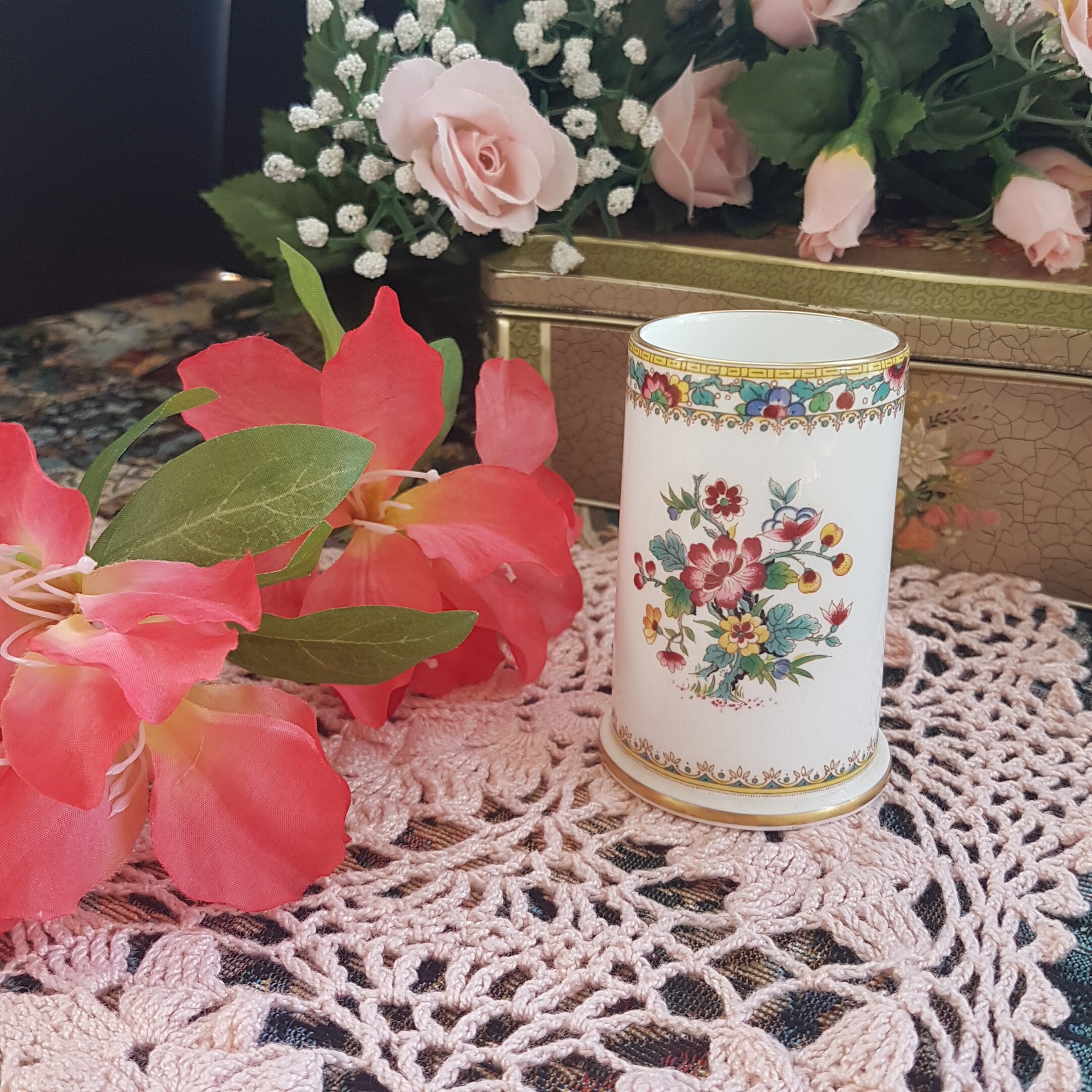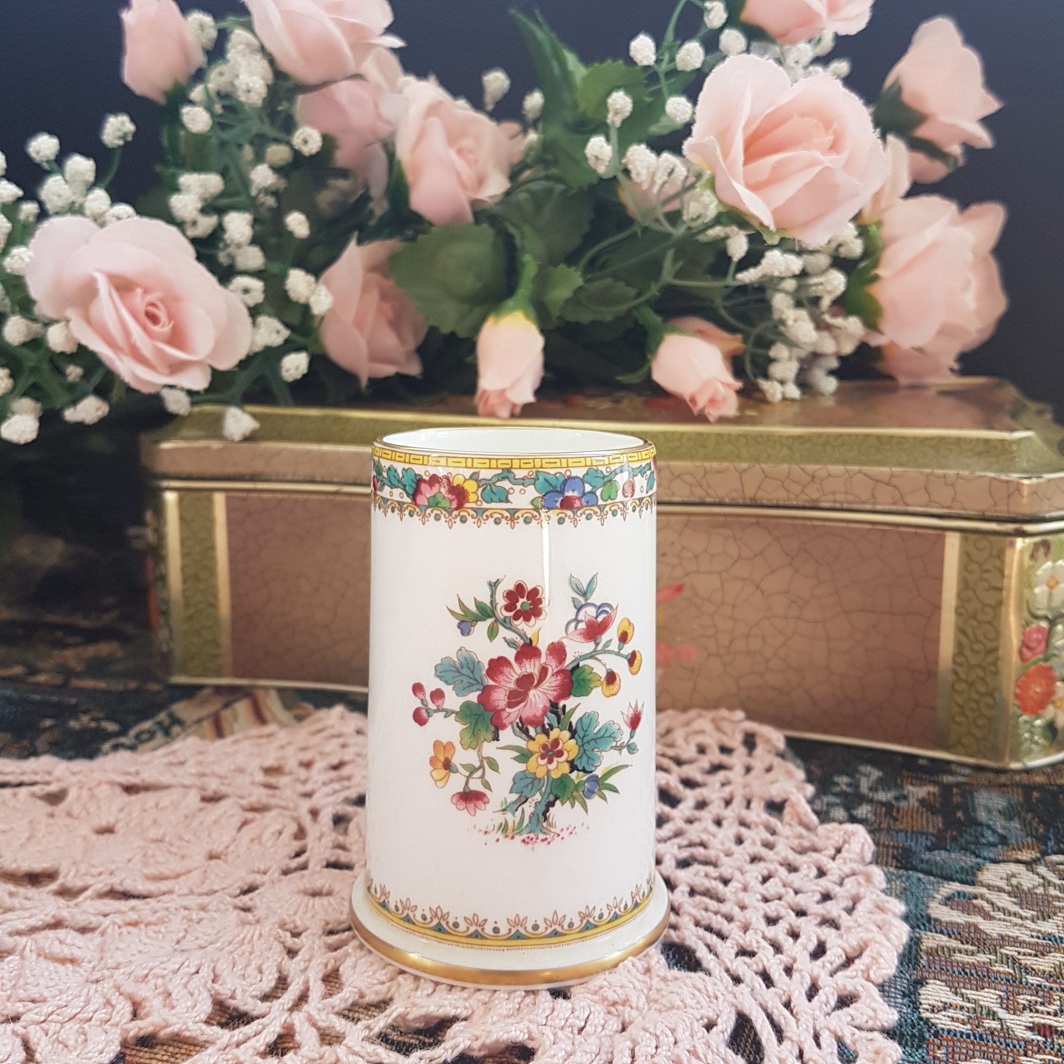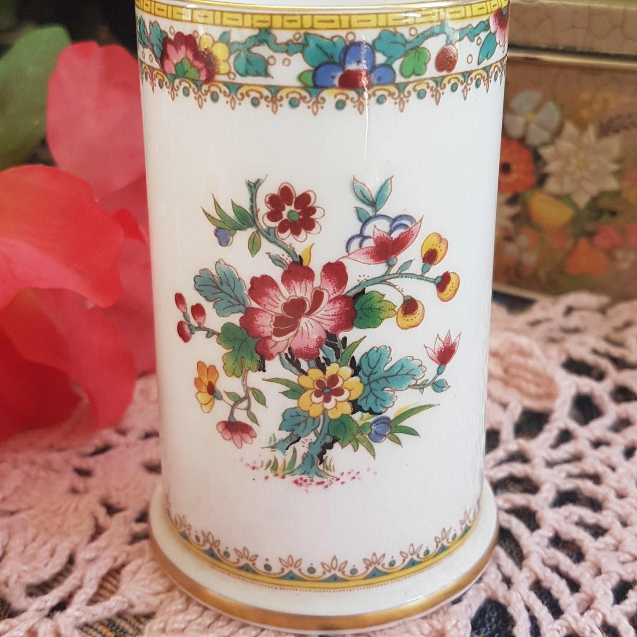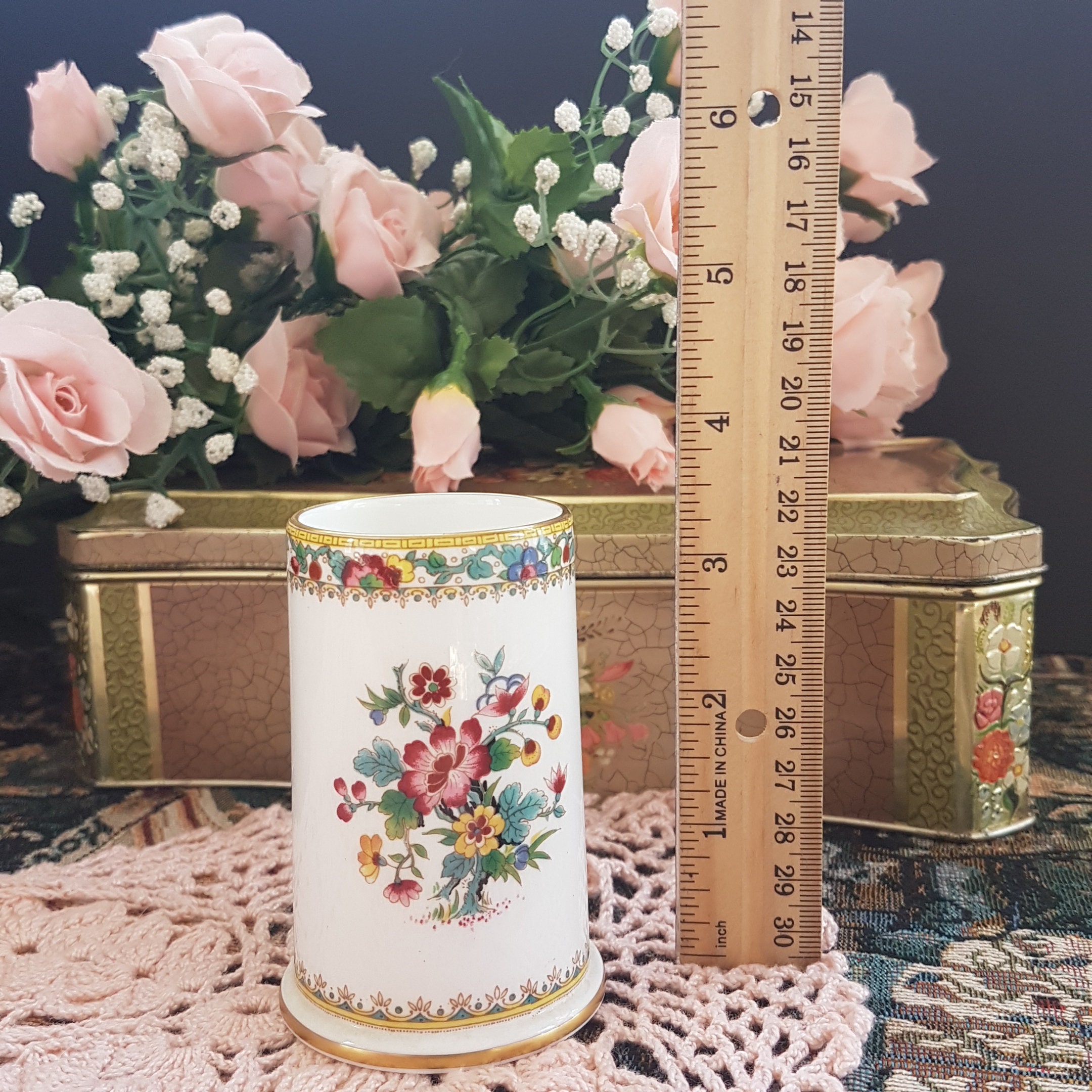 Lovely florals in Coalport's MING ROSE, with red, yellow and blue flowers. Small English bone china posy vase. Perfect size for a few stems of your favorite flowers.