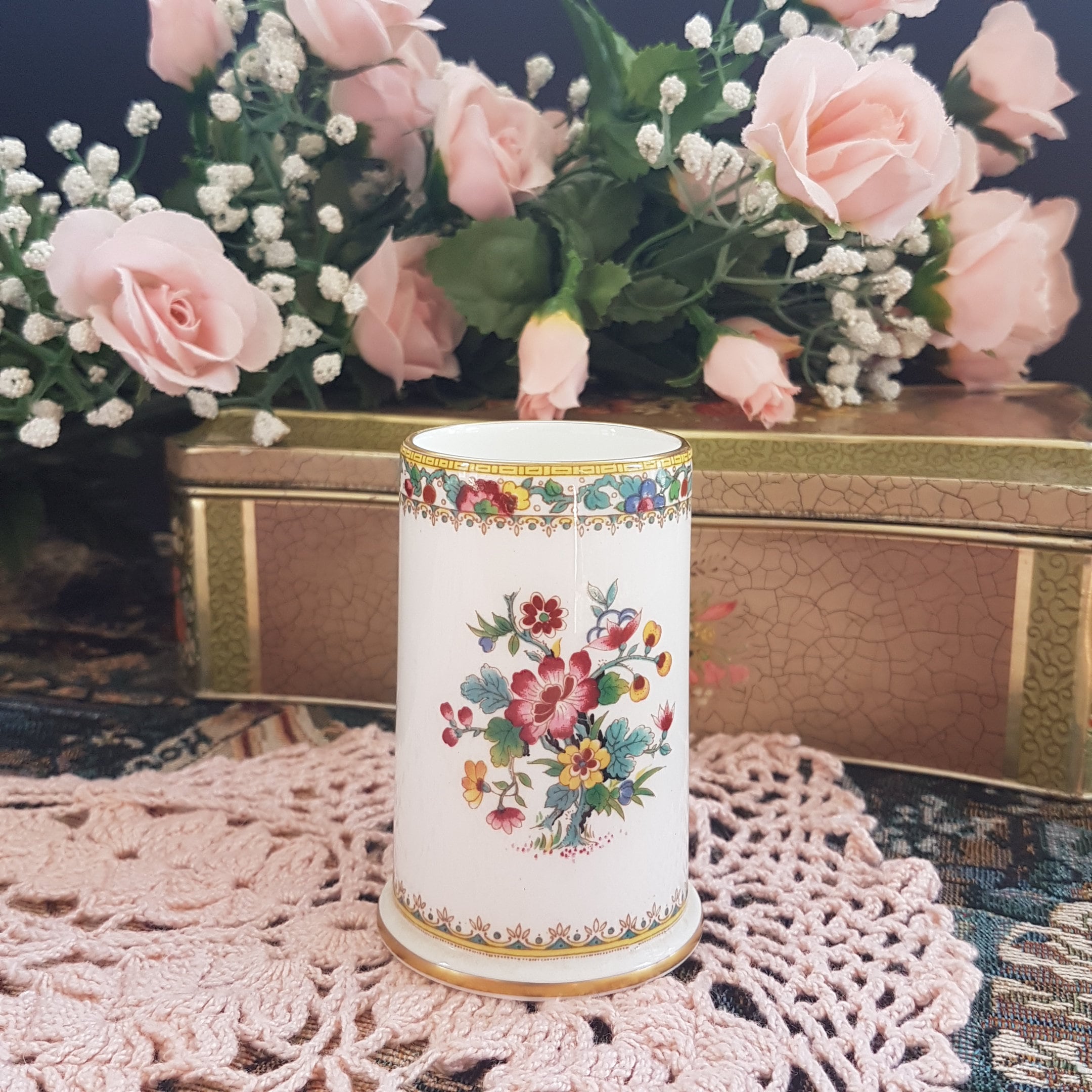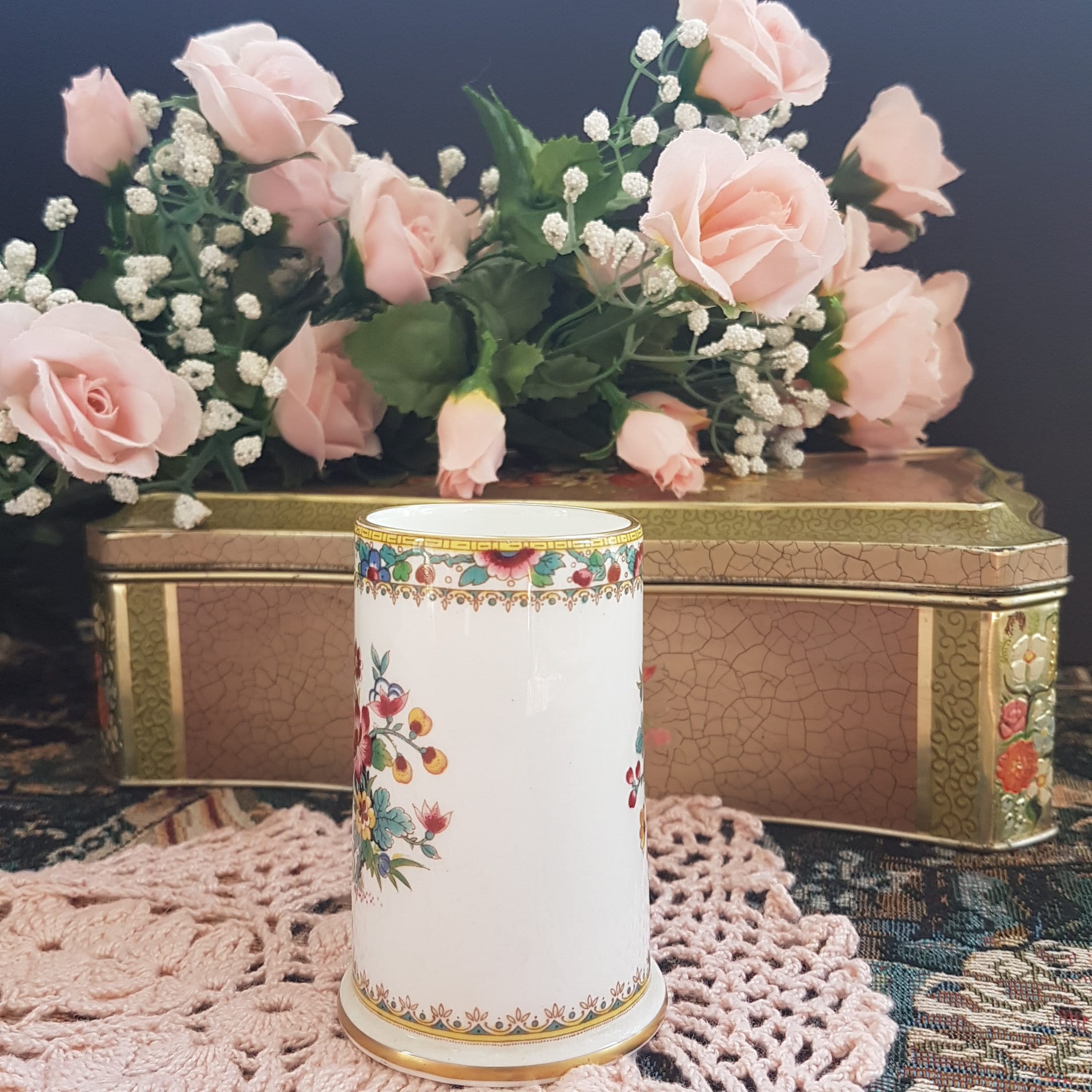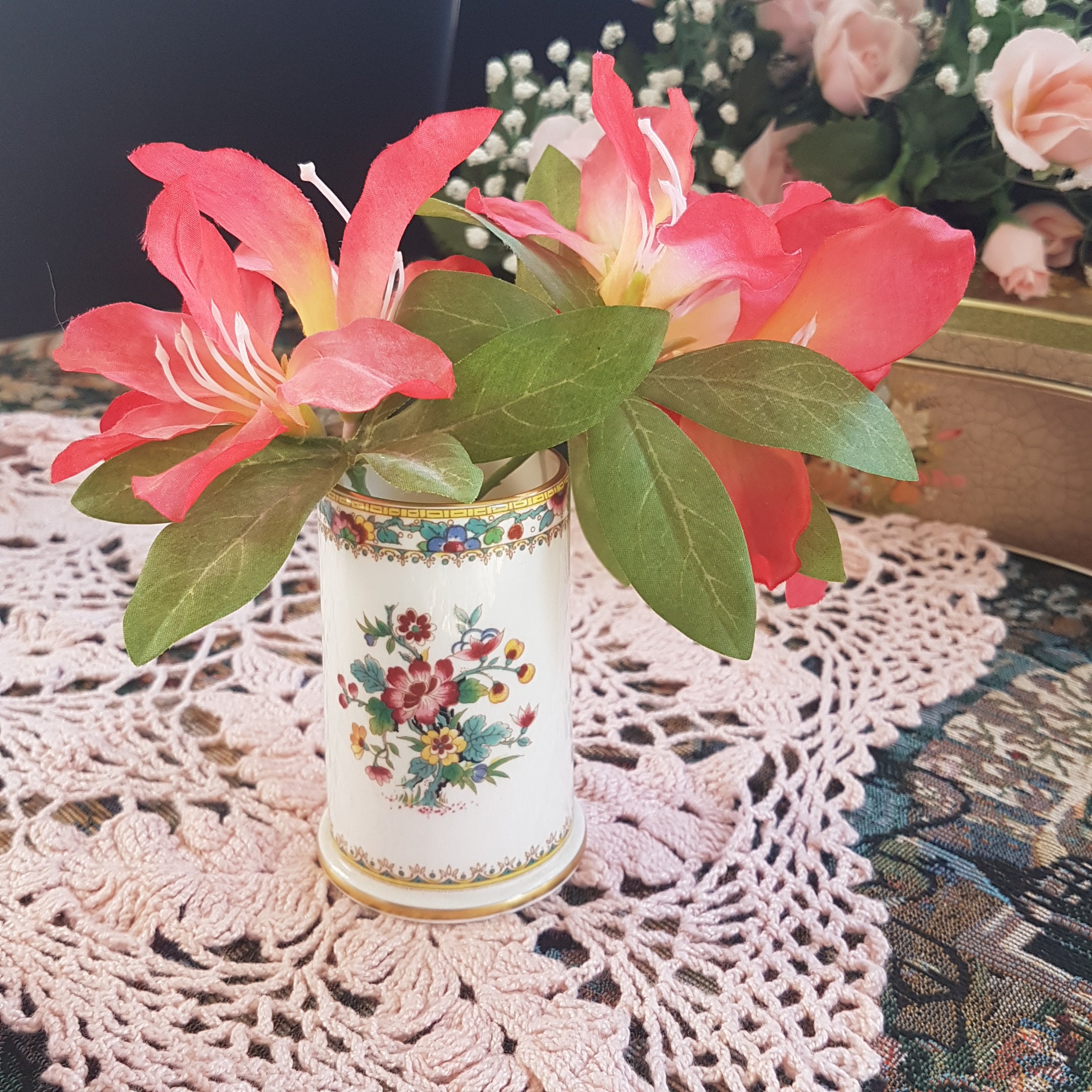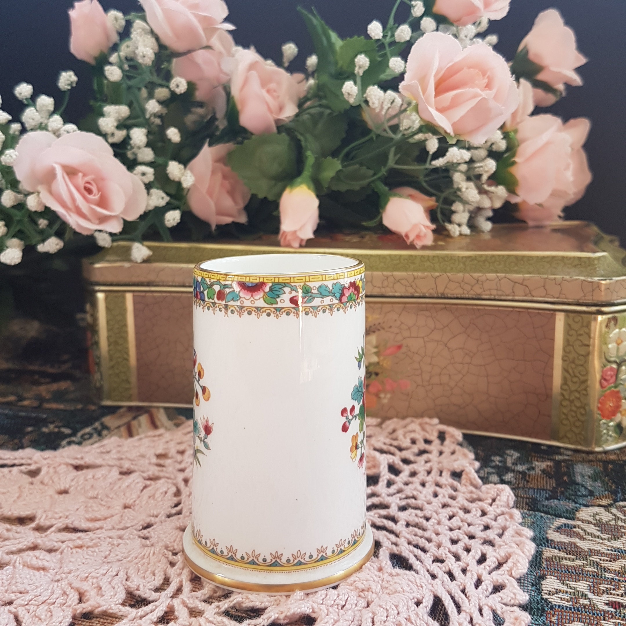 Lovely florals in Coalport's MING ROSE, with red, yellow and blue flowers. Small English bone china posy vase. Perfect size for a few stems of your favorite flowers.