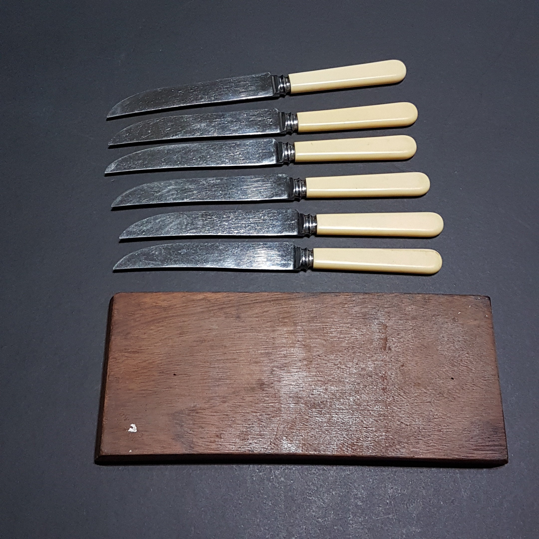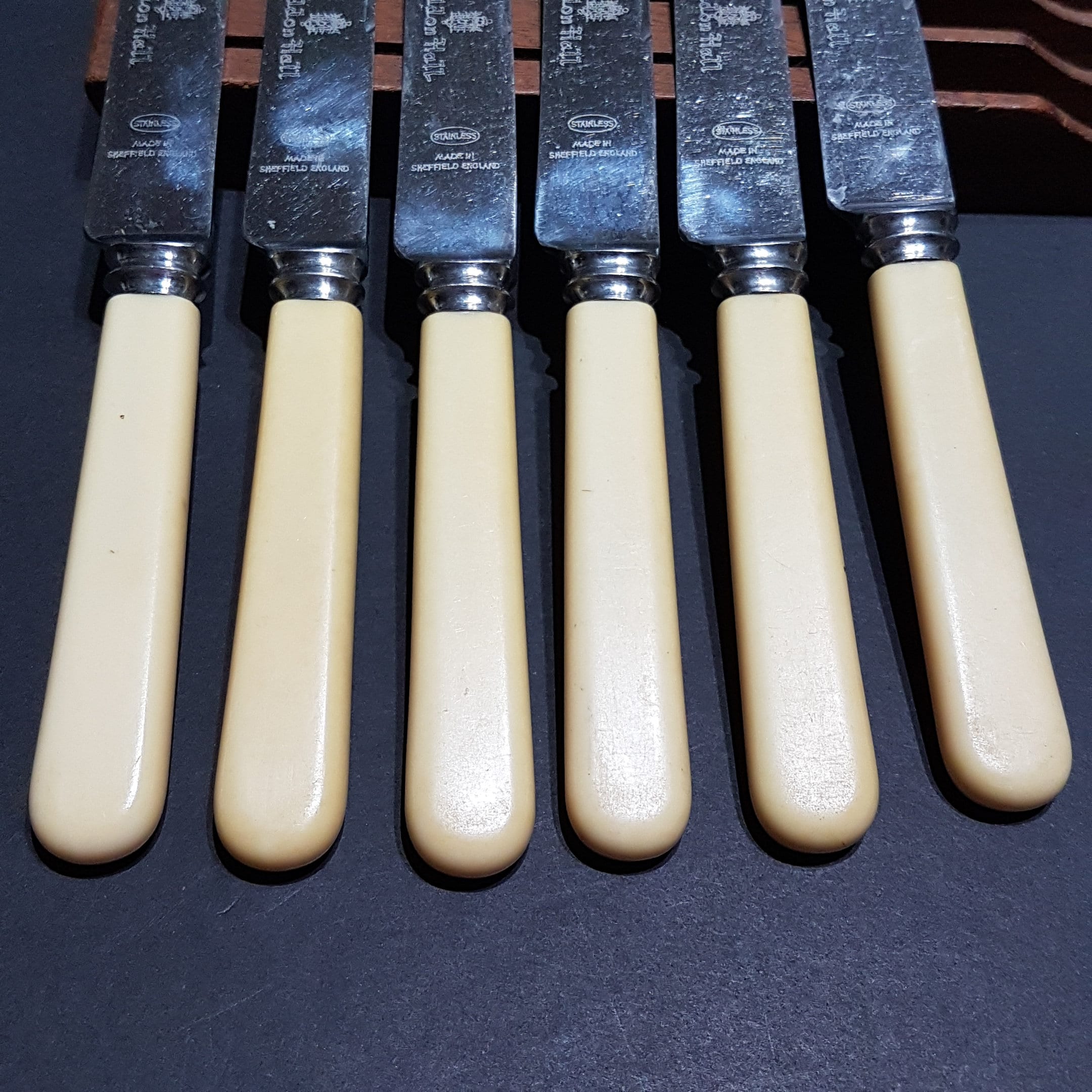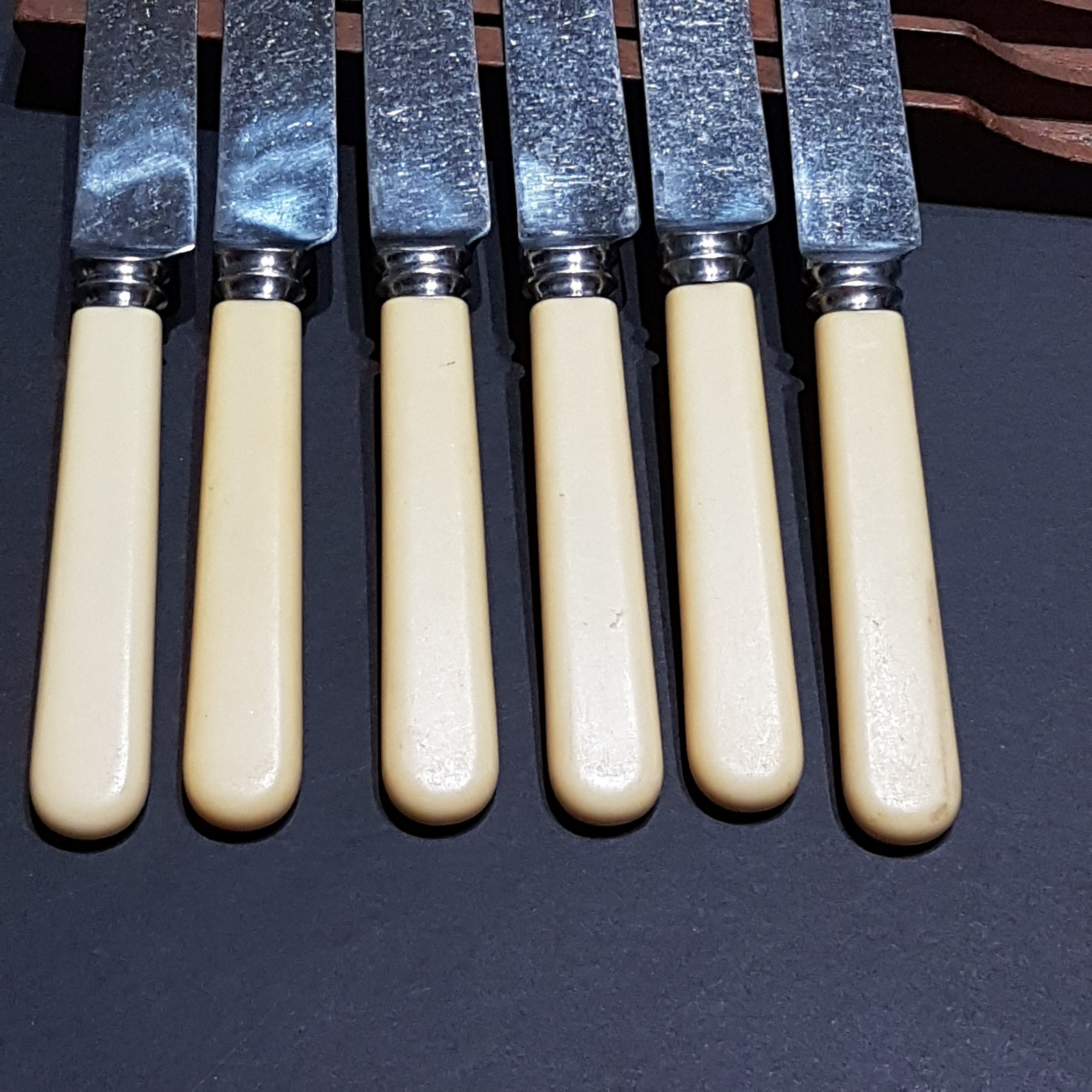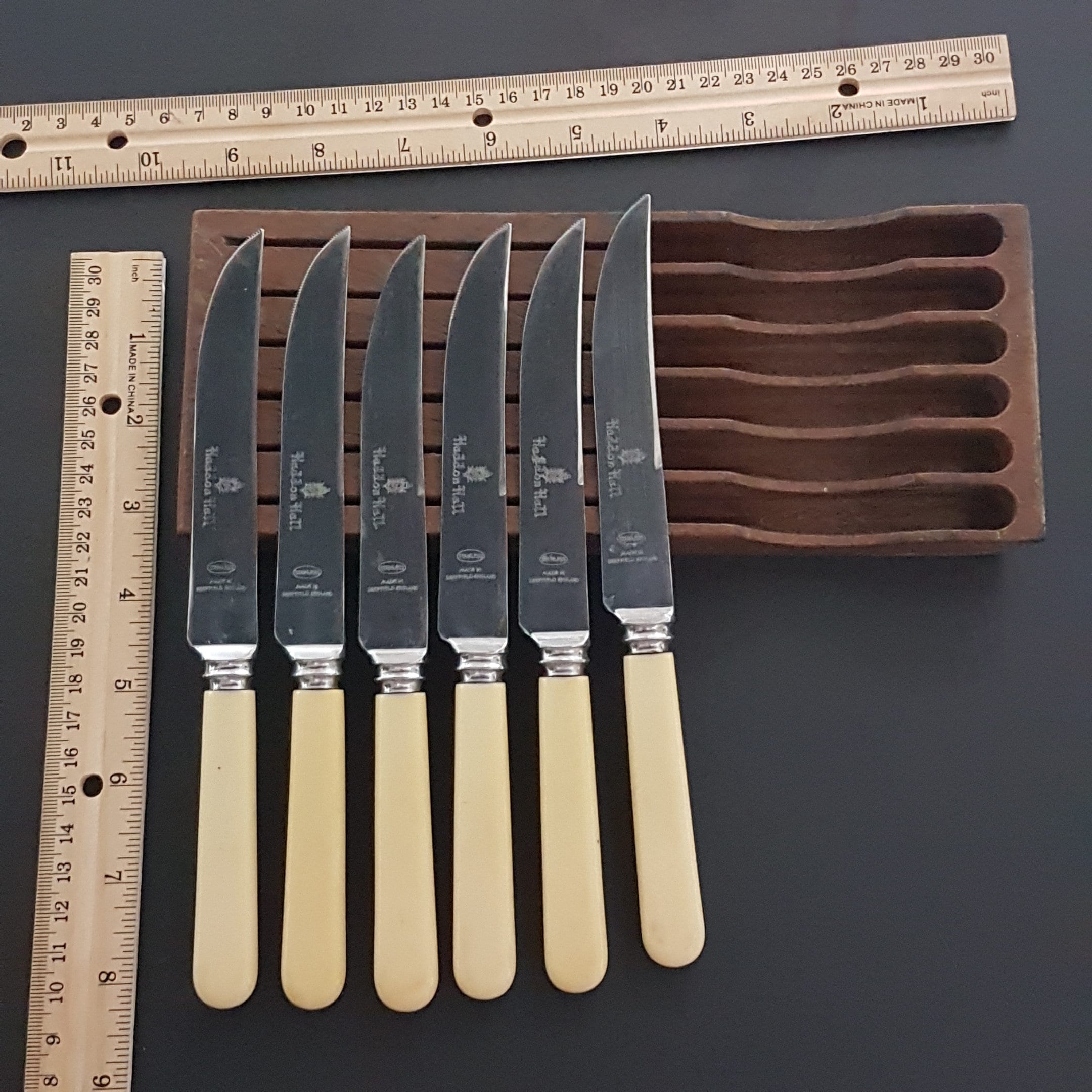 Set of 6 steak knives with faux bone, butterscotch color bakelite handles. Finely serrated near tip of knives. Keep the knives close at hand or stored safely in their own handy wooden storage box! (included)