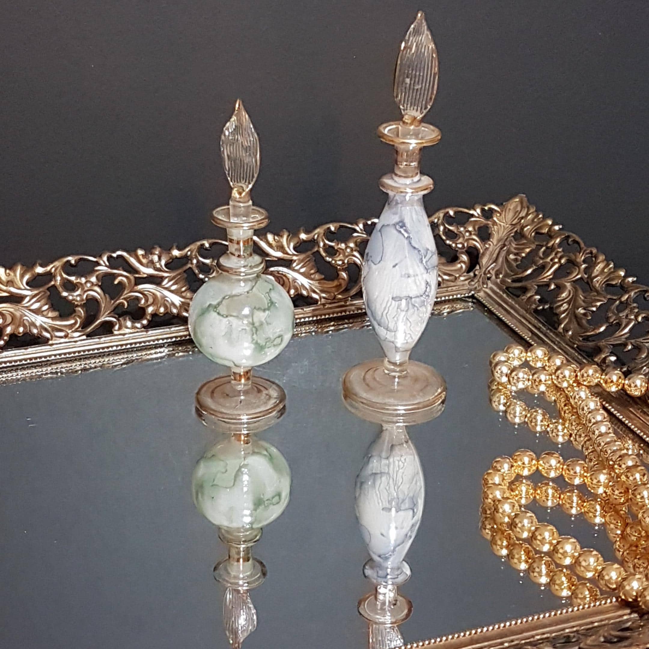 Set of 2 glass perfume bottles. Blown glass is delicate, thin and fragile. These perfume bottles have a marbled body with clear glass and gold trim. Beautiful for Edwardian or Victorian dressing table! Tear drop shaped glass stoppers, are one solid piece of glass. Each bottle is unique and together make a pretty set!
