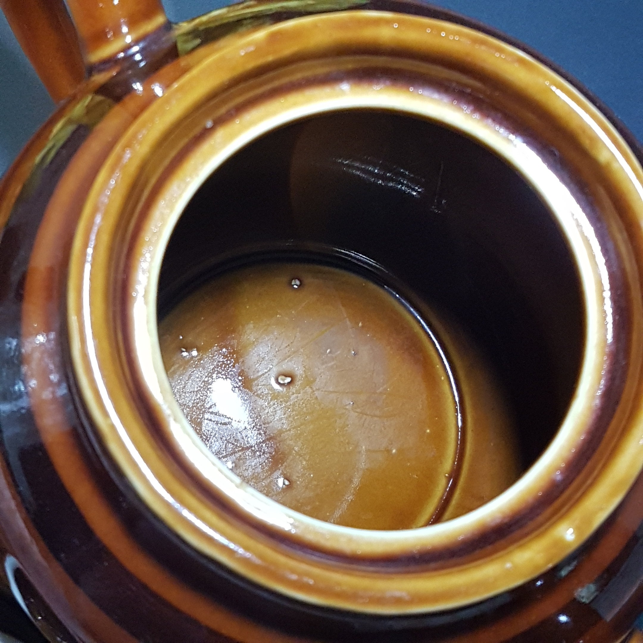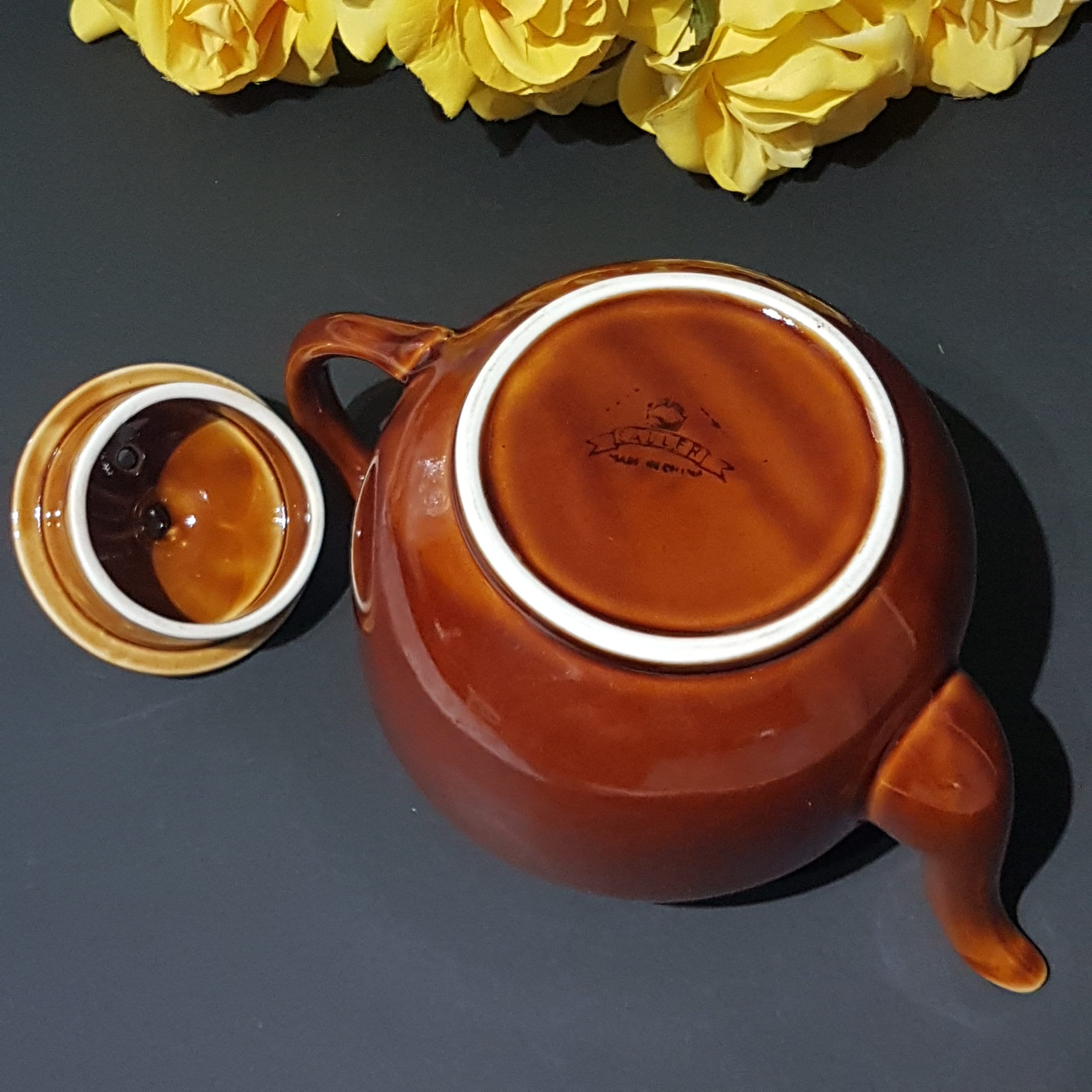 Full size (7 cup) James Sadler Brown Betty Teapot, with darker brown bands around teapot body.