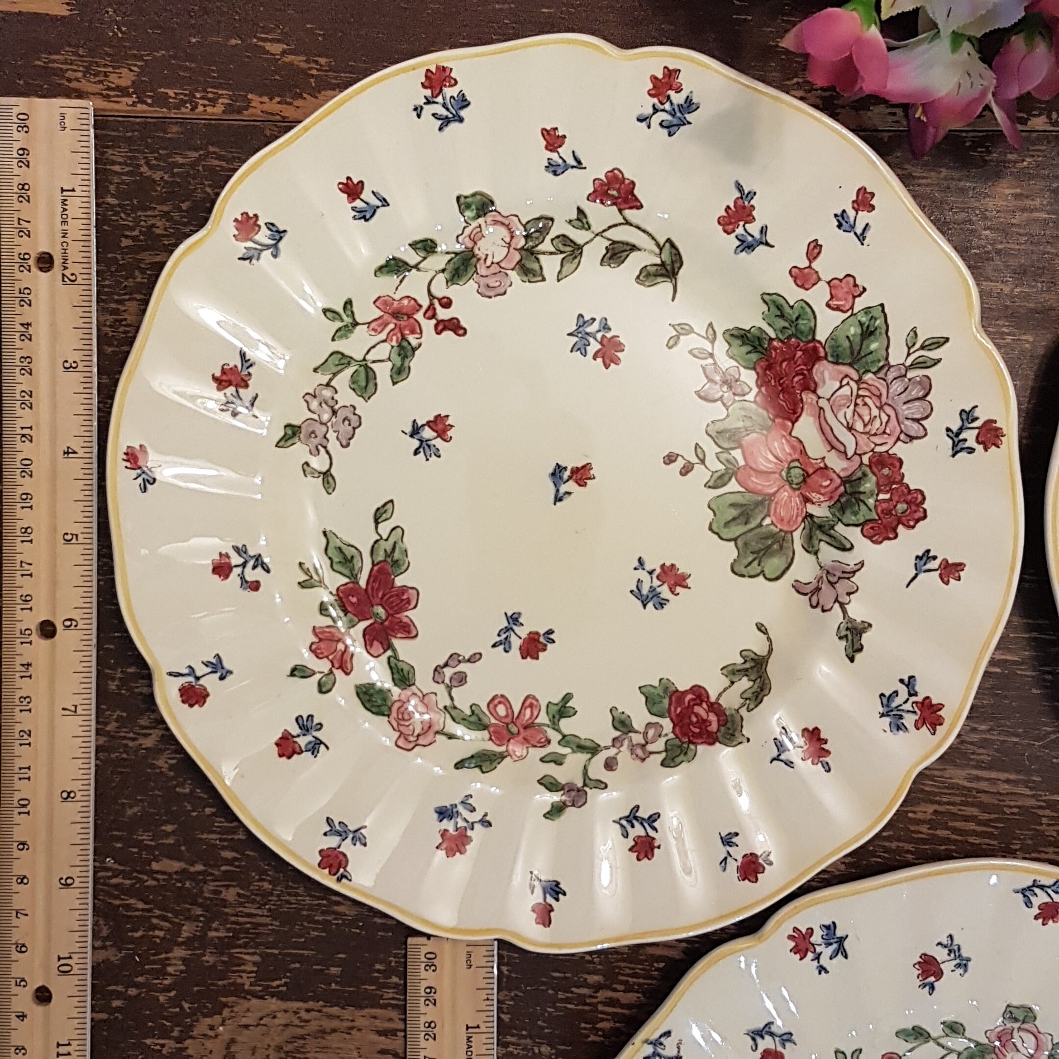 Royal Doulton WILDFLOWER hand decorated with pink, red and purple flowers and a yellow ring on the inner brim. Fluted edge. Set of 3 dinner plates
