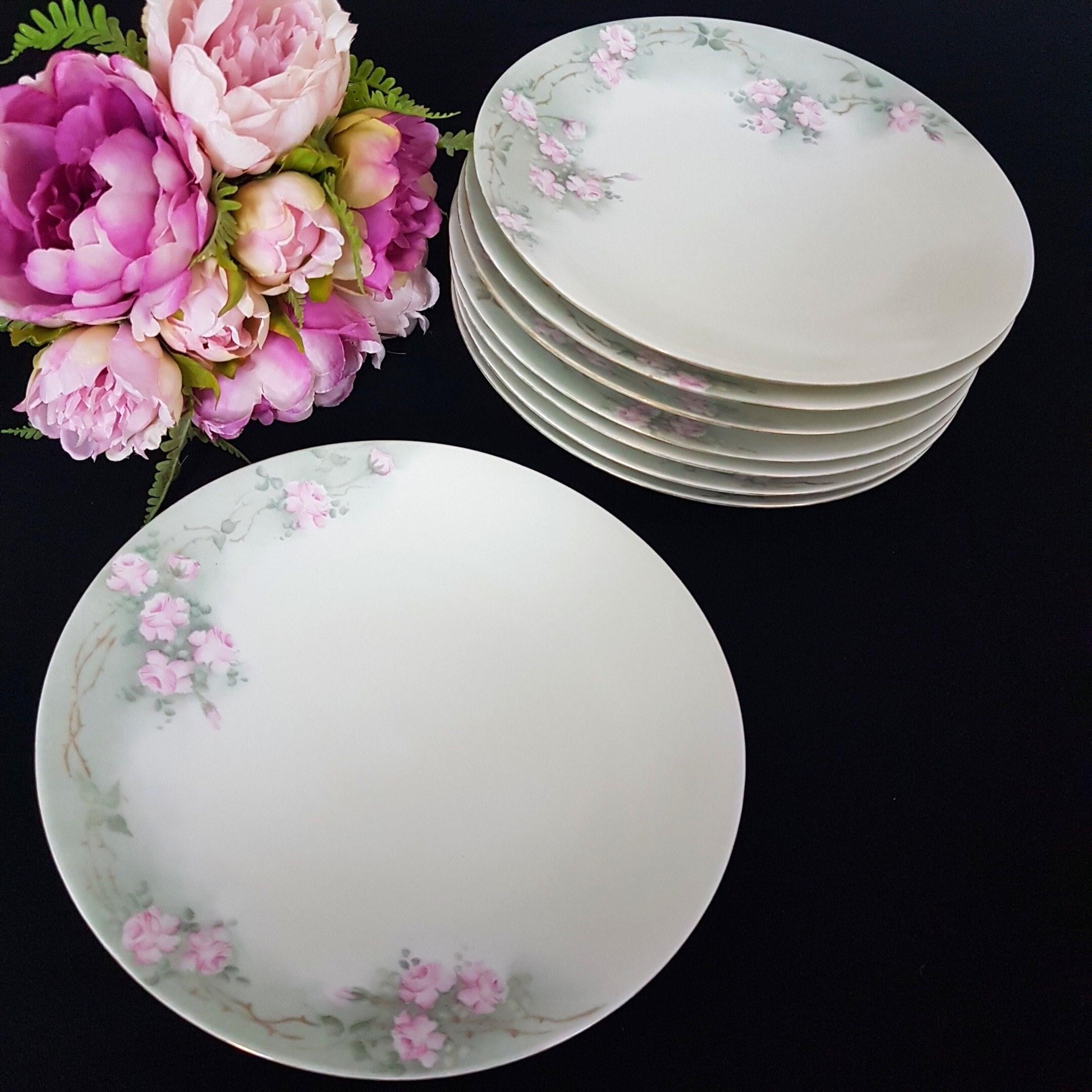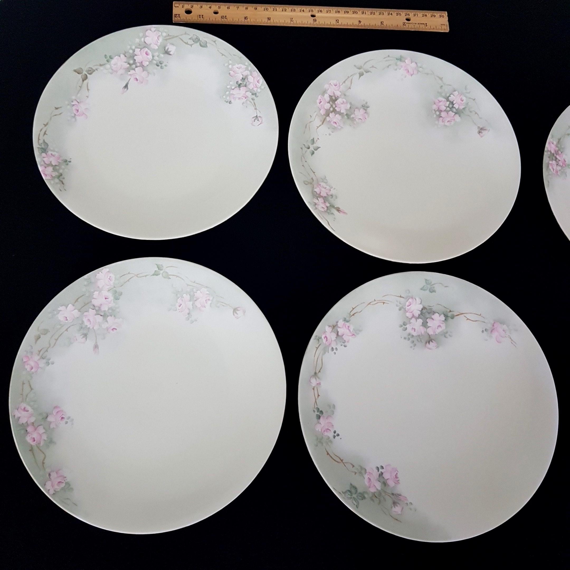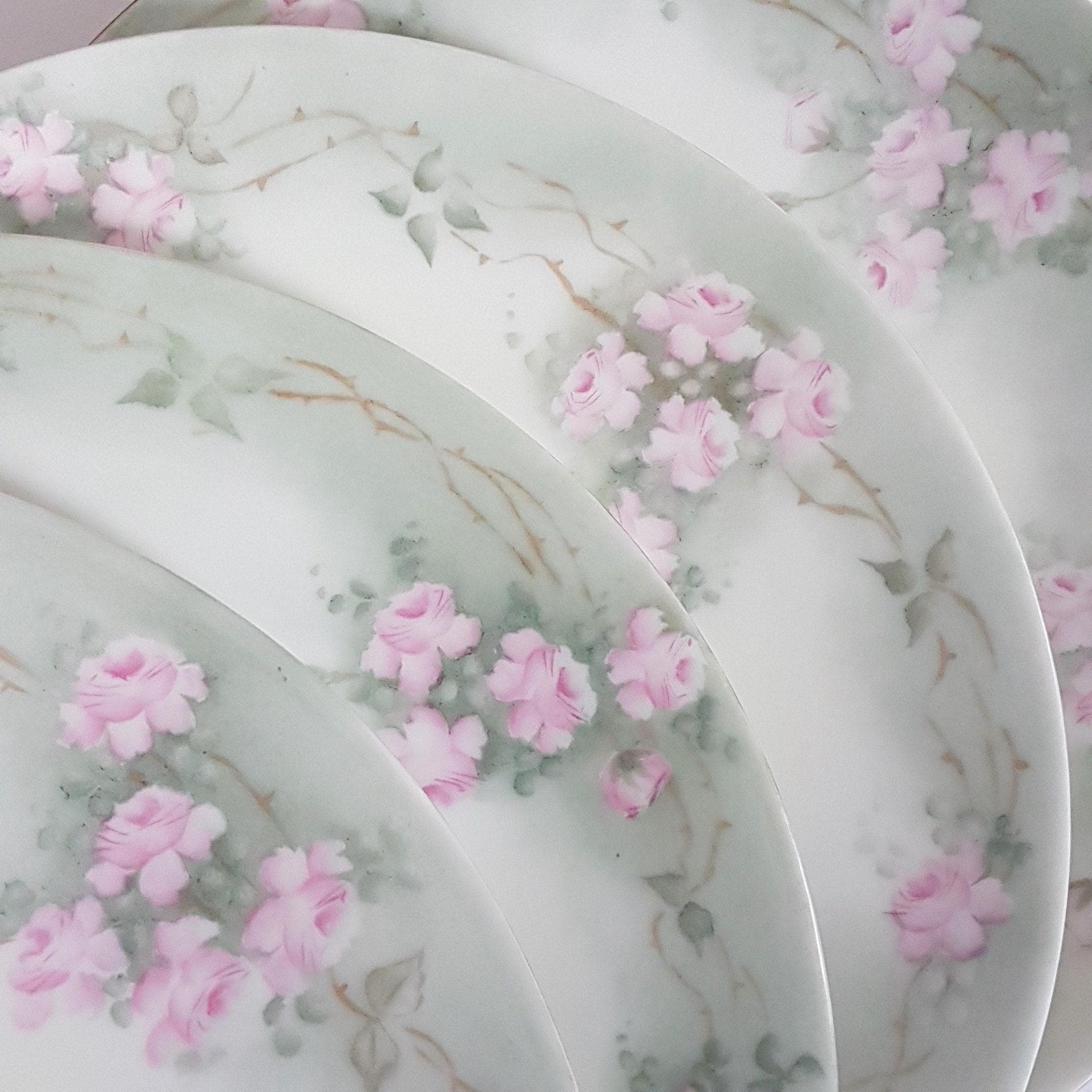 Vintage Limoges hand painted dinner plates. Light pink cabbage roses, brown thorny rose branches and darker green rose leaves on a pastel green. Gold edge.