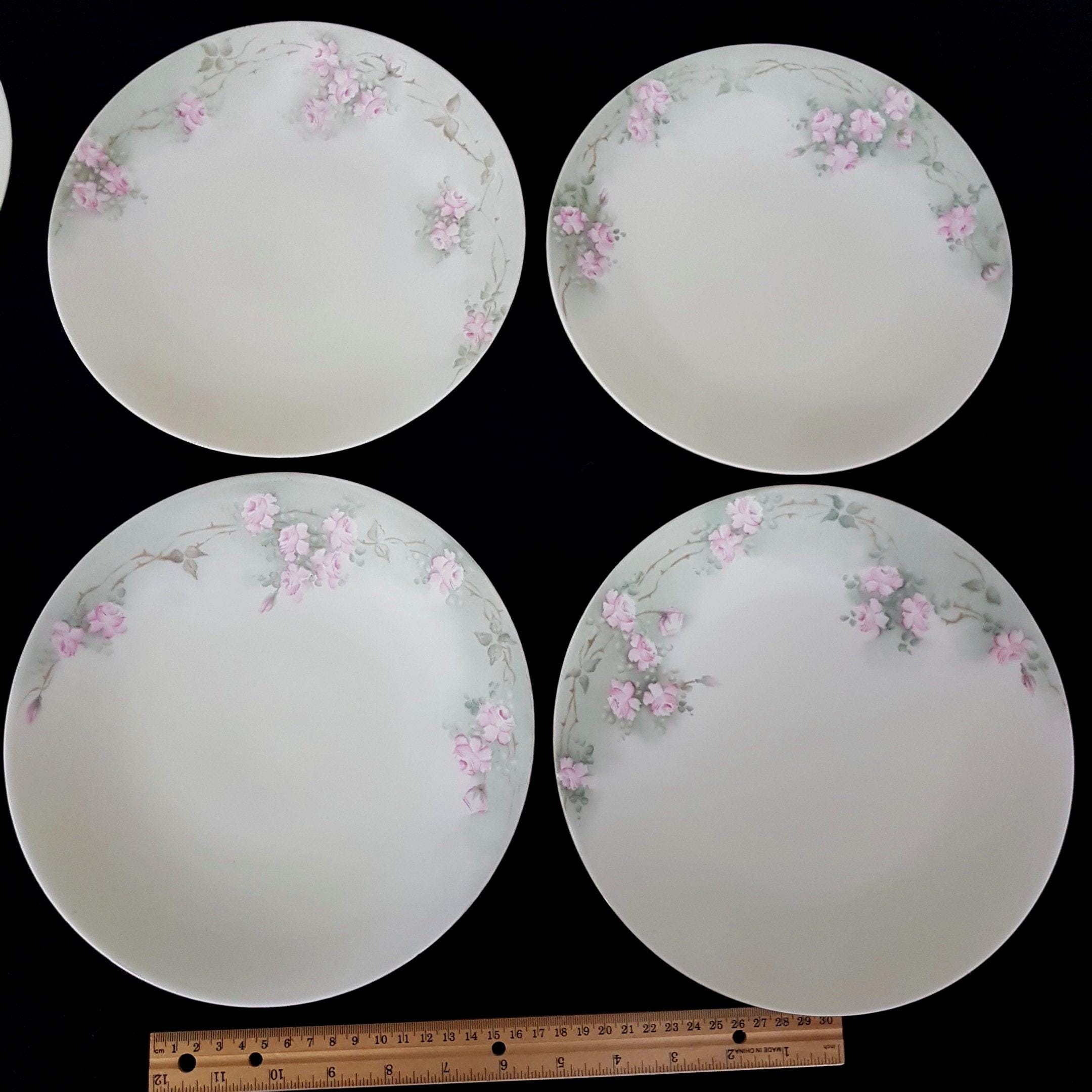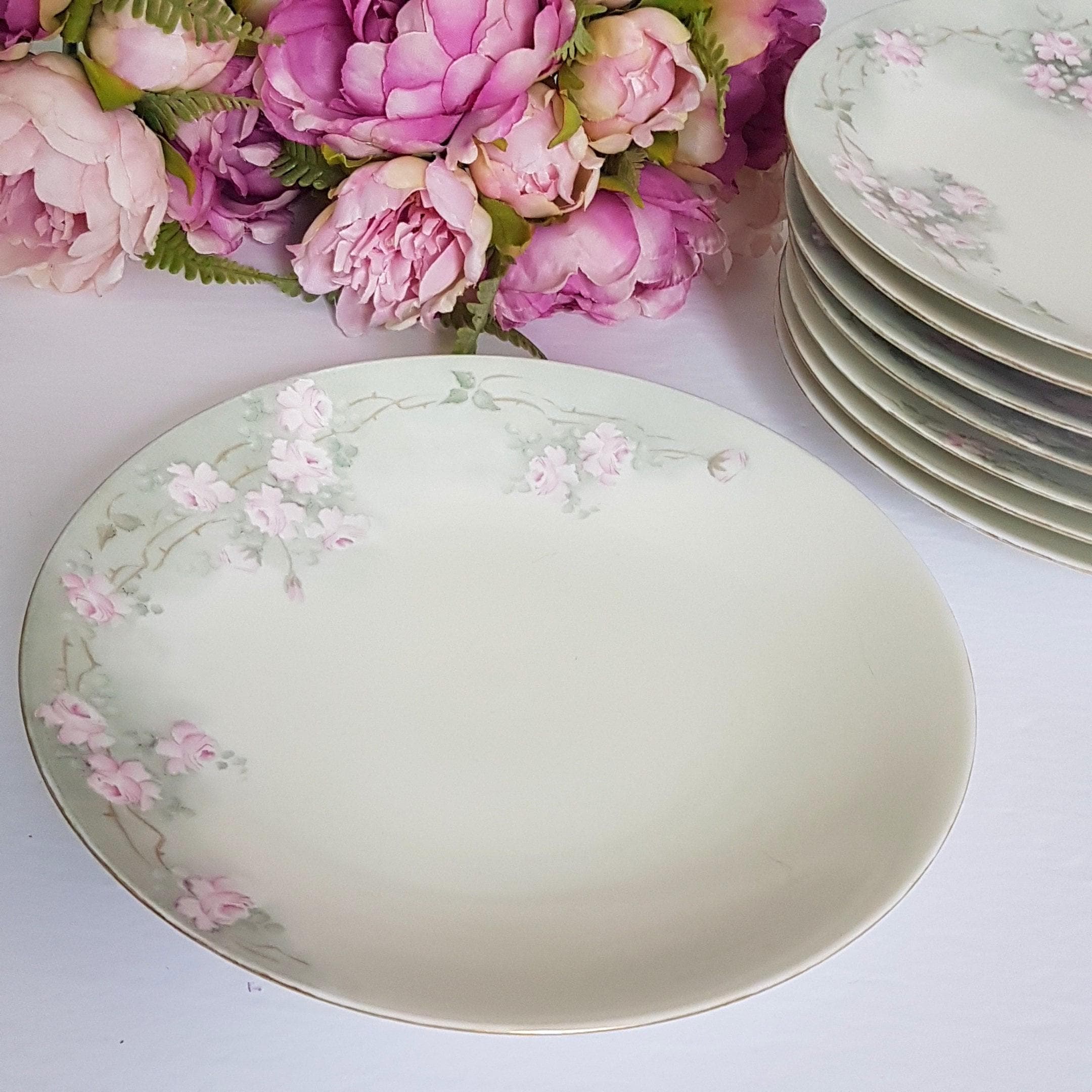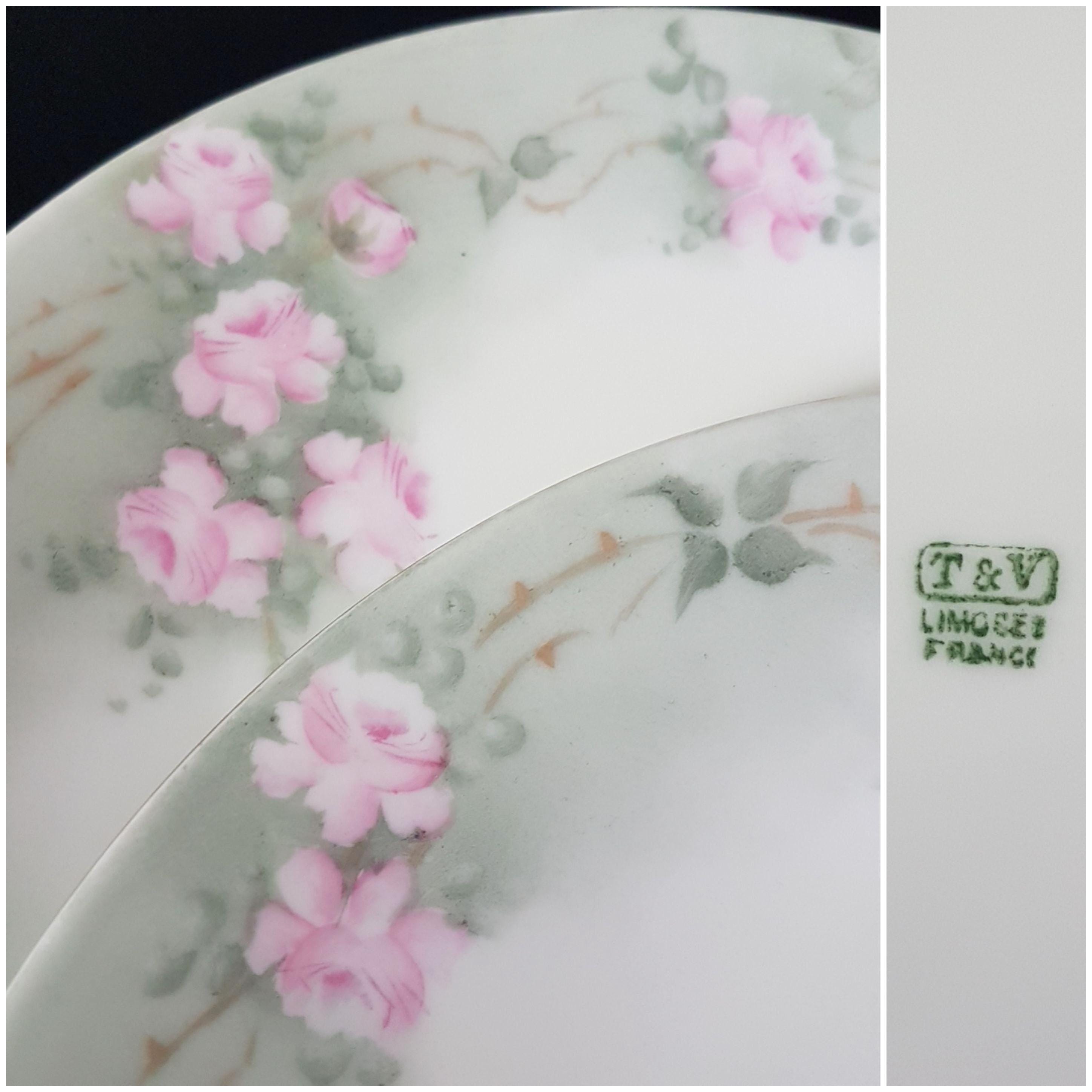 Vintage Limoges hand painted dinner plates. Light pink cabbage roses, brown thorny rose branches and darker green rose leaves on a pastel green. Gold edge.