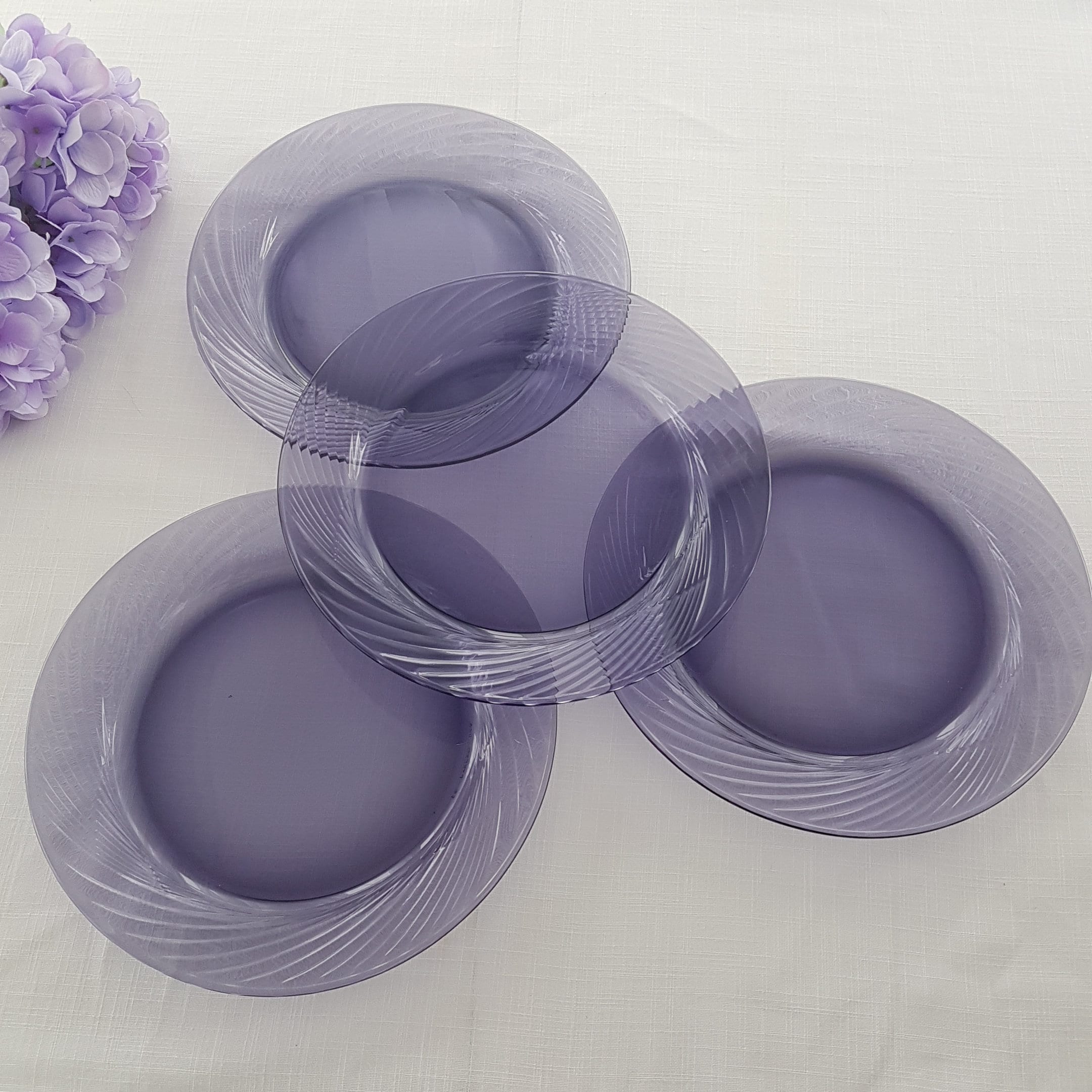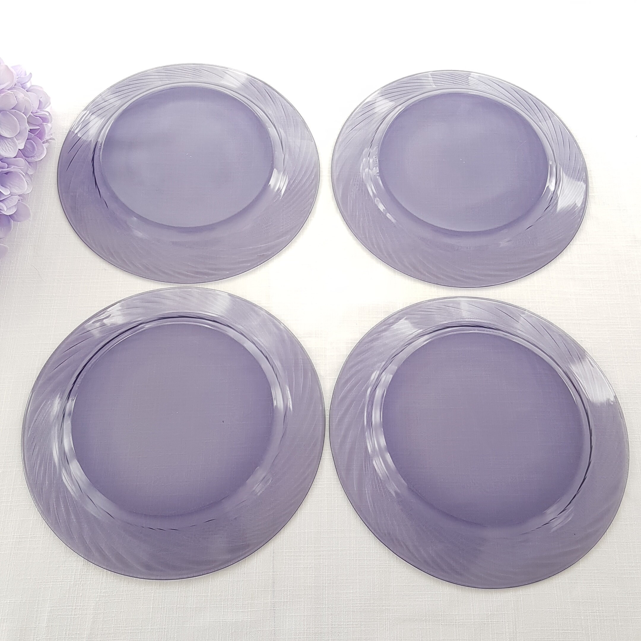 Amethyst purple Pyrex / Corelle dinner plates in Festiva pattern with all purple glass and swirl rim.