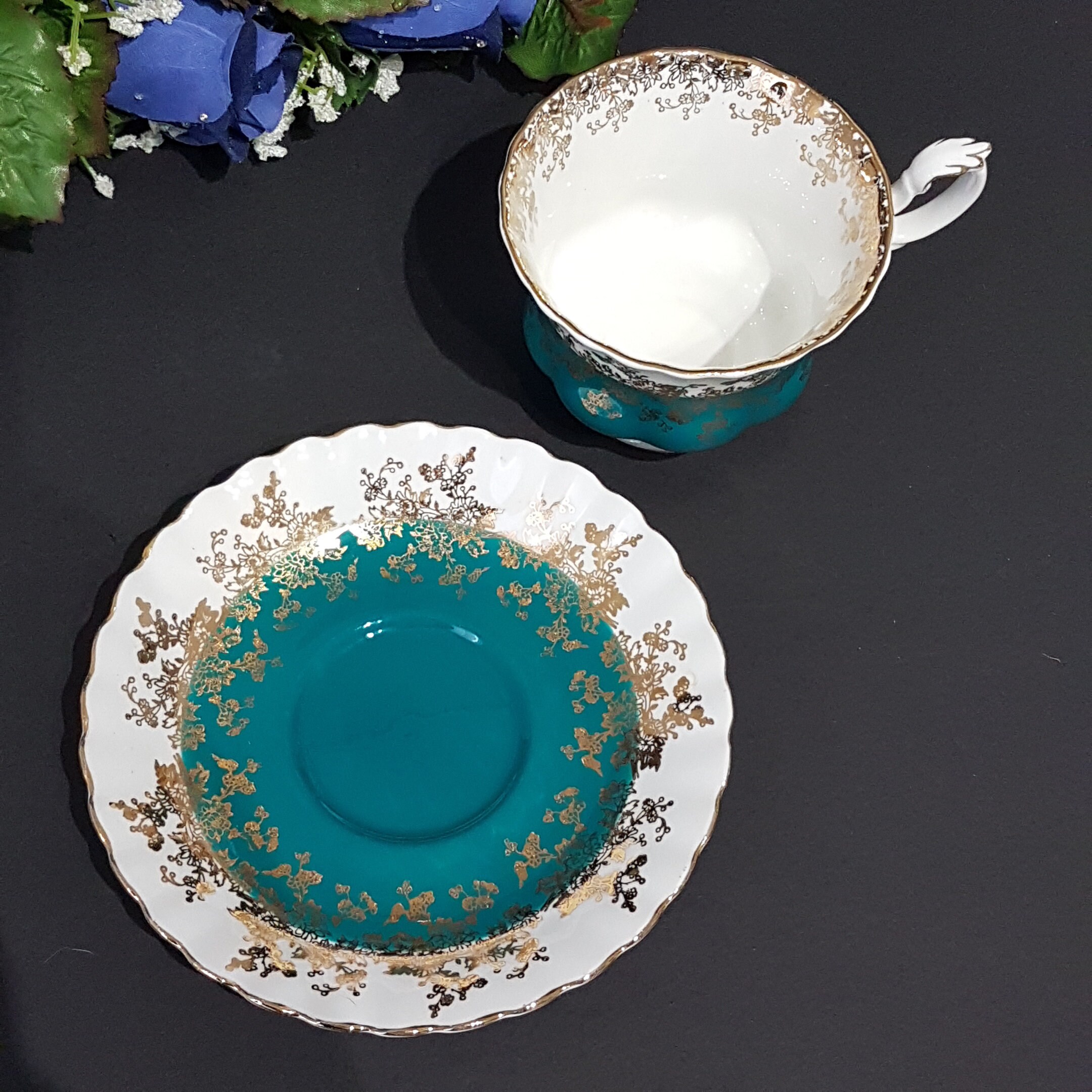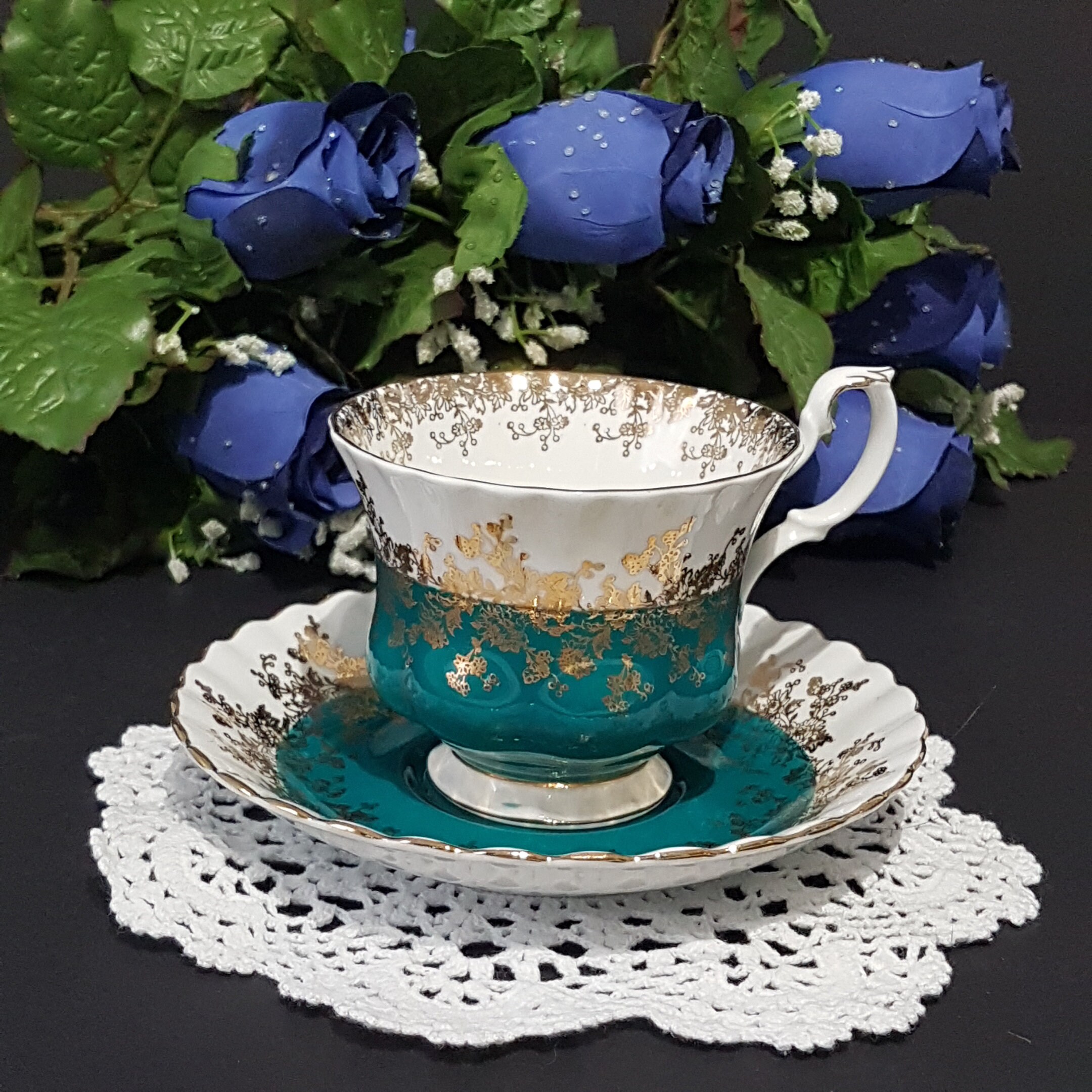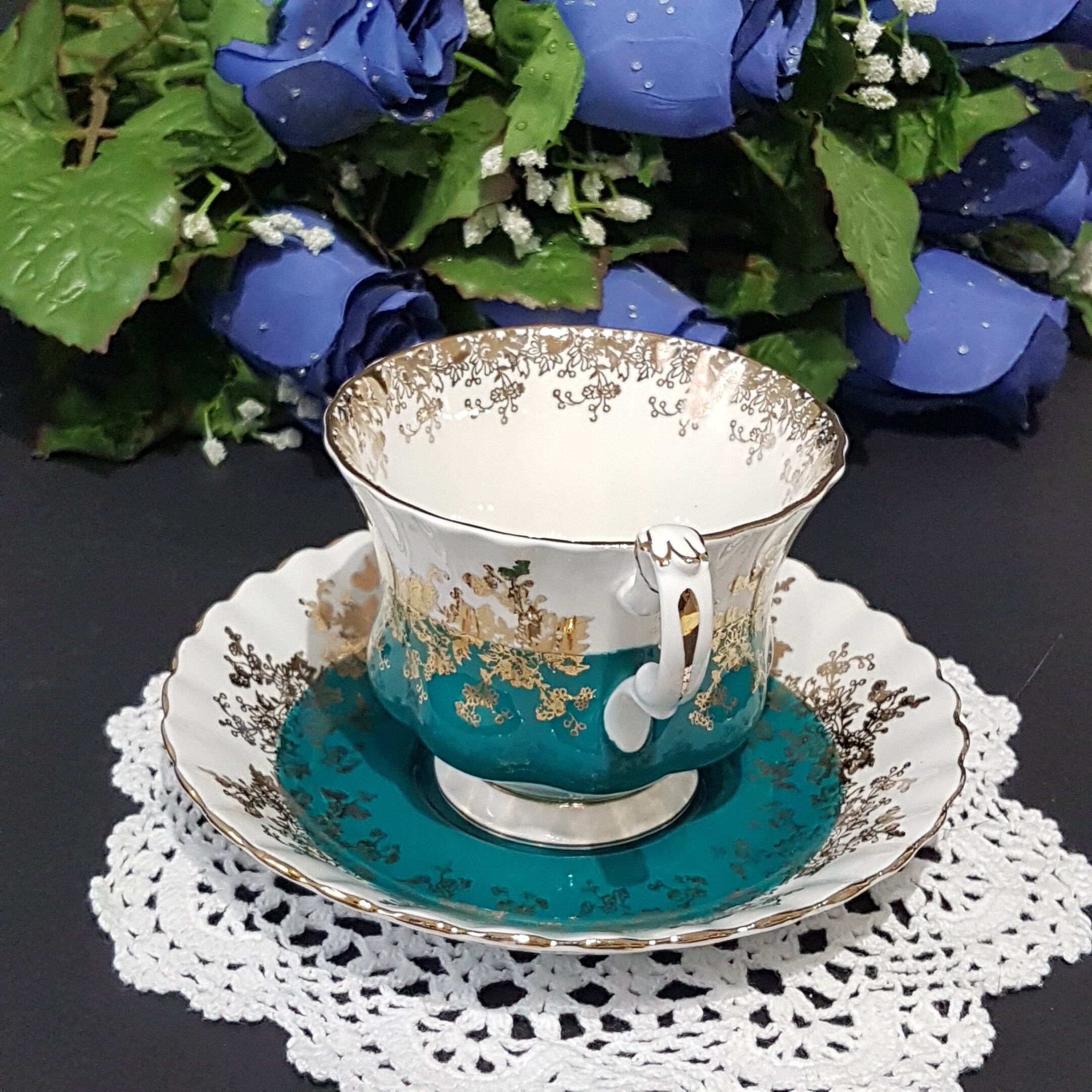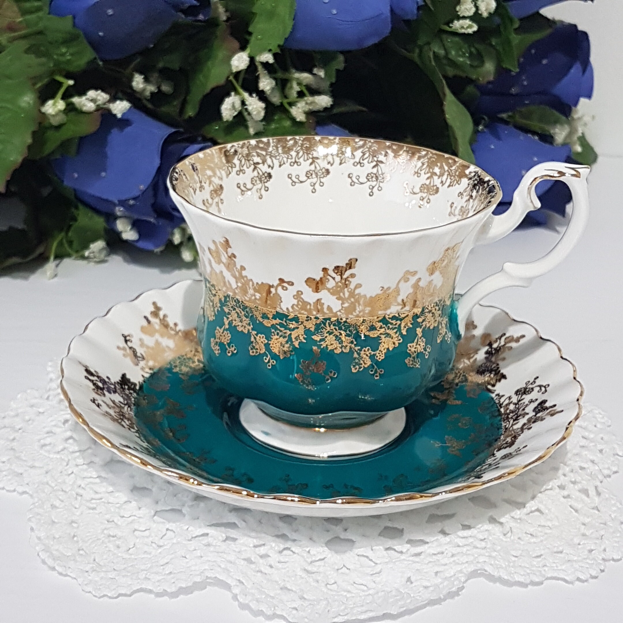 This particular teacup is in a lovely teal green. An abundance of gold gilding on both the teacup and saucer. Gold accents and gold trim. Saucer has a scalloped edge.