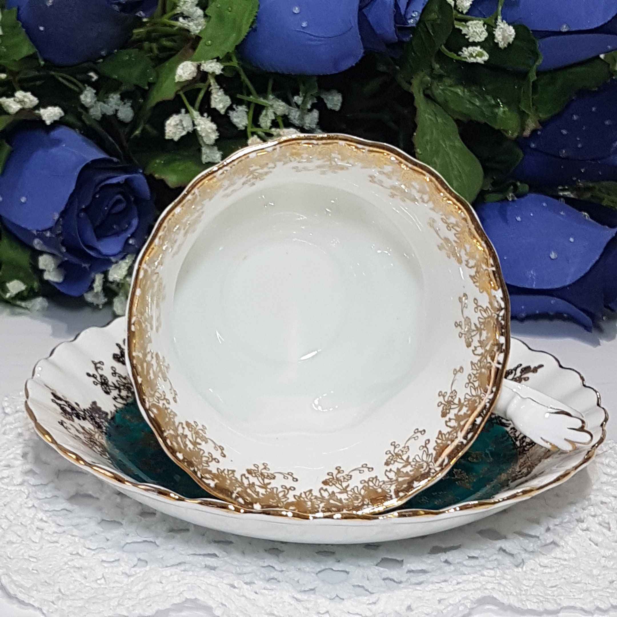 Vintage Condition: NO chips. NO cracks. NO crazing. NO obvious signs of gold wear. Two smears of teal glaze on the white tea cup foot.