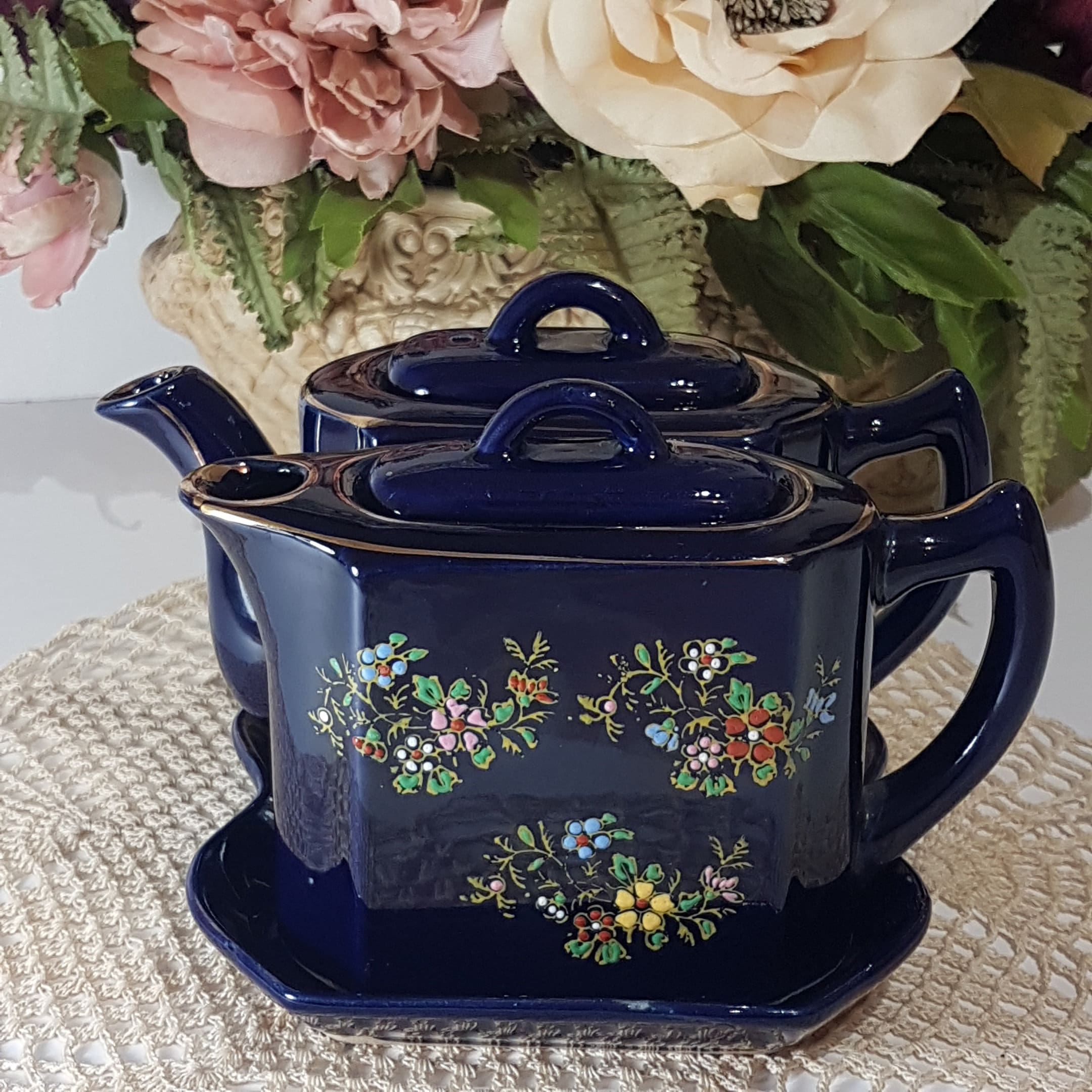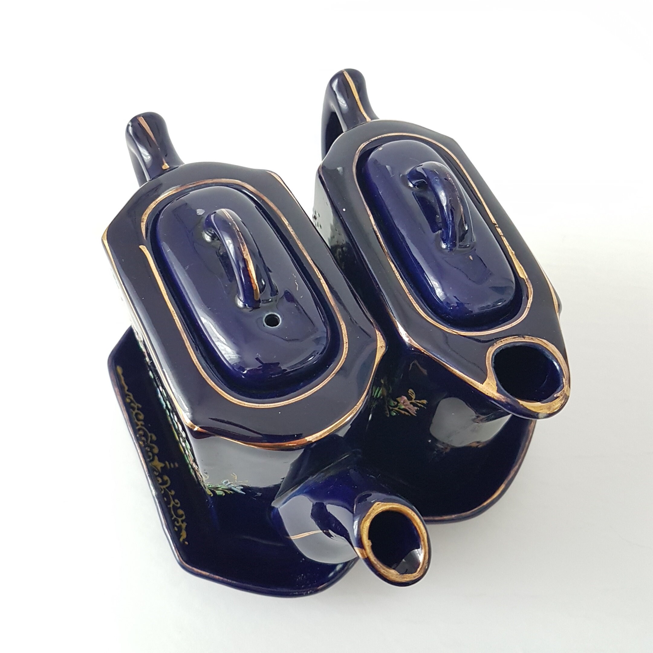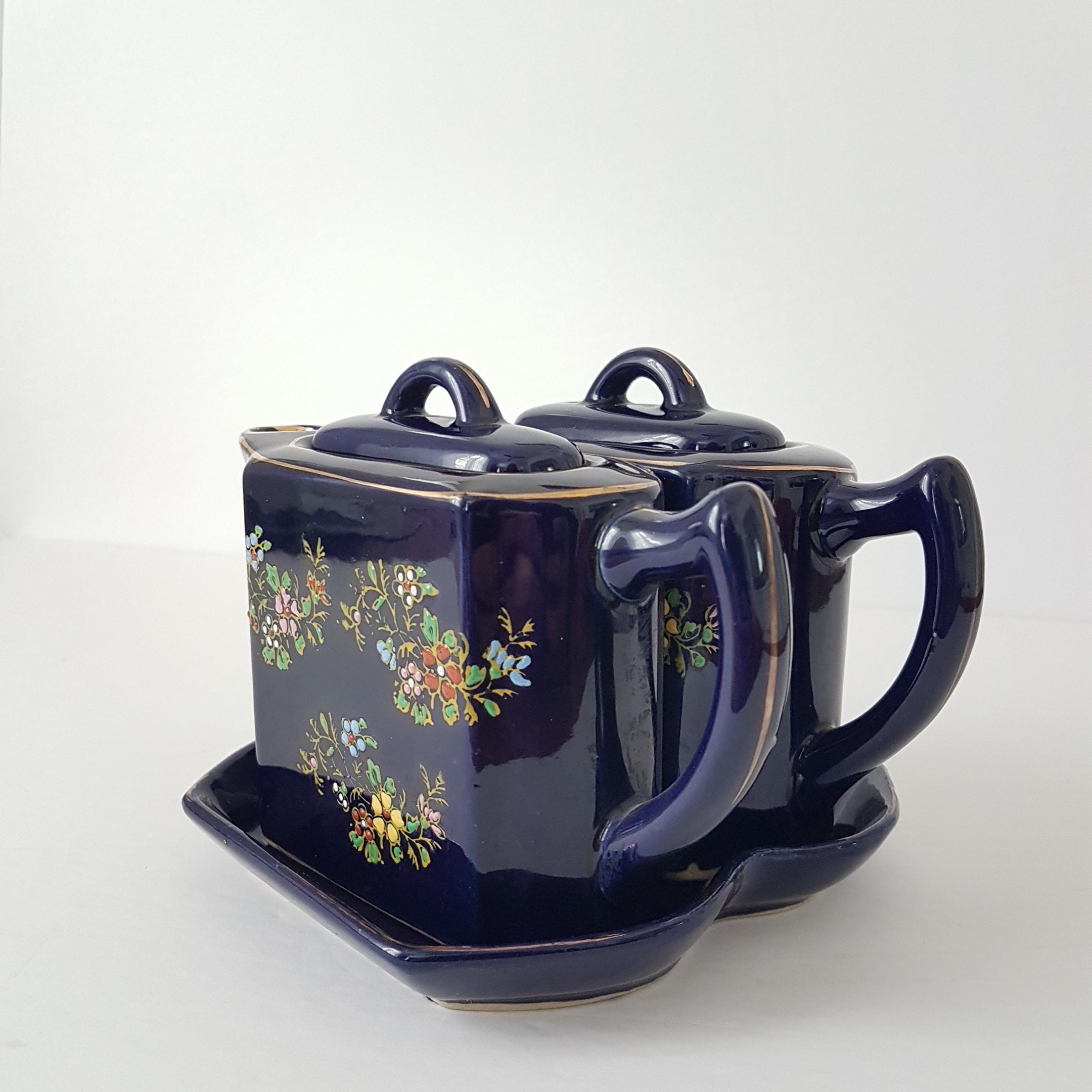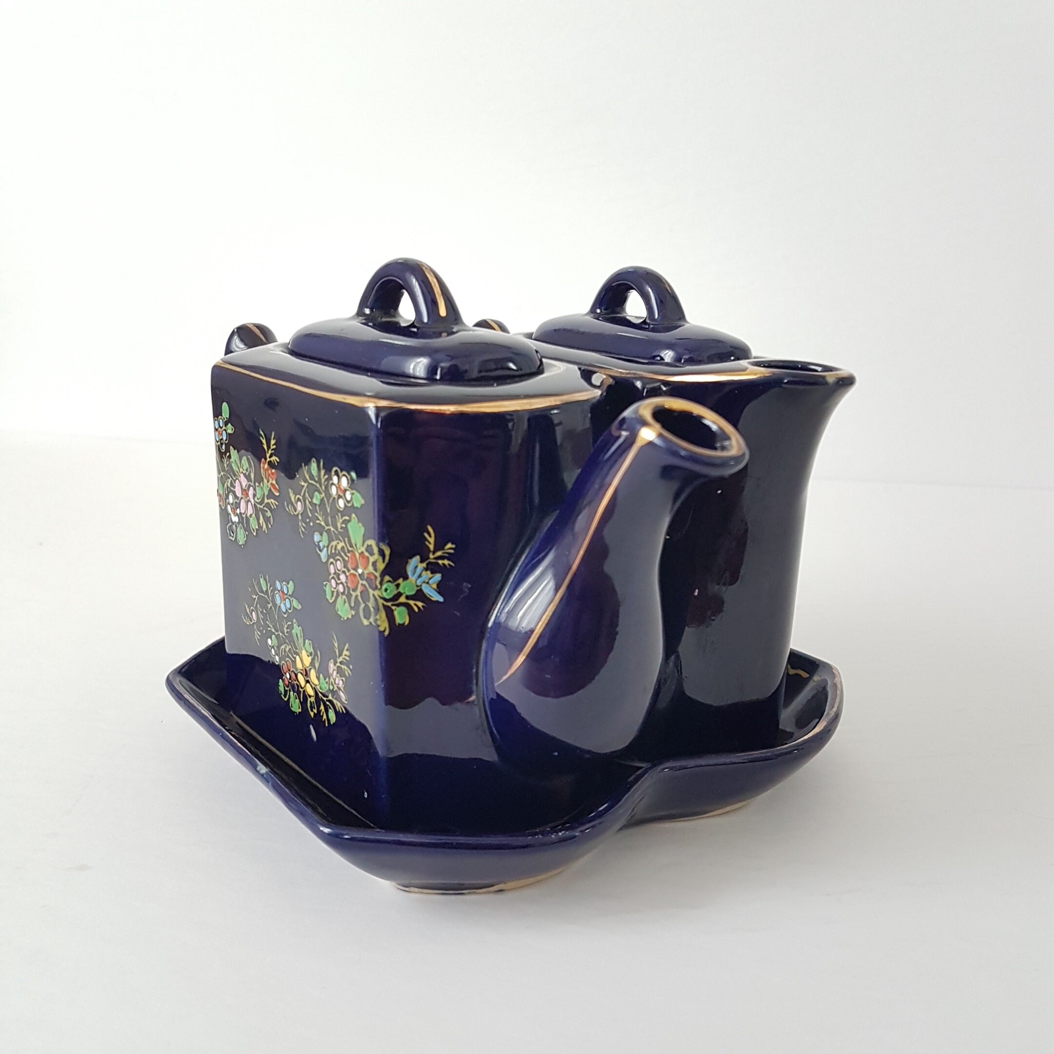 Double small teapots with tray. Hand painted flowers in yellow, pink, blue white and red on a cobalt blue. Gold gilt accent and trim. Use as one teapot for brewed tea and one for hot water or make a small pot of two different teas, to share with a friend!