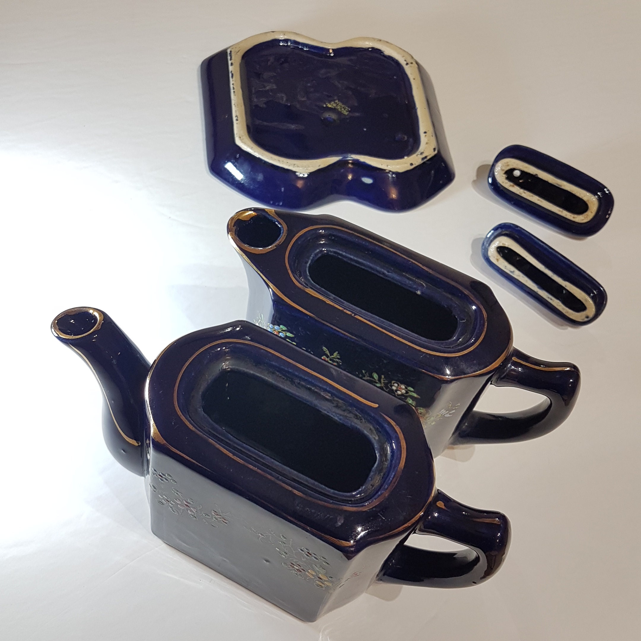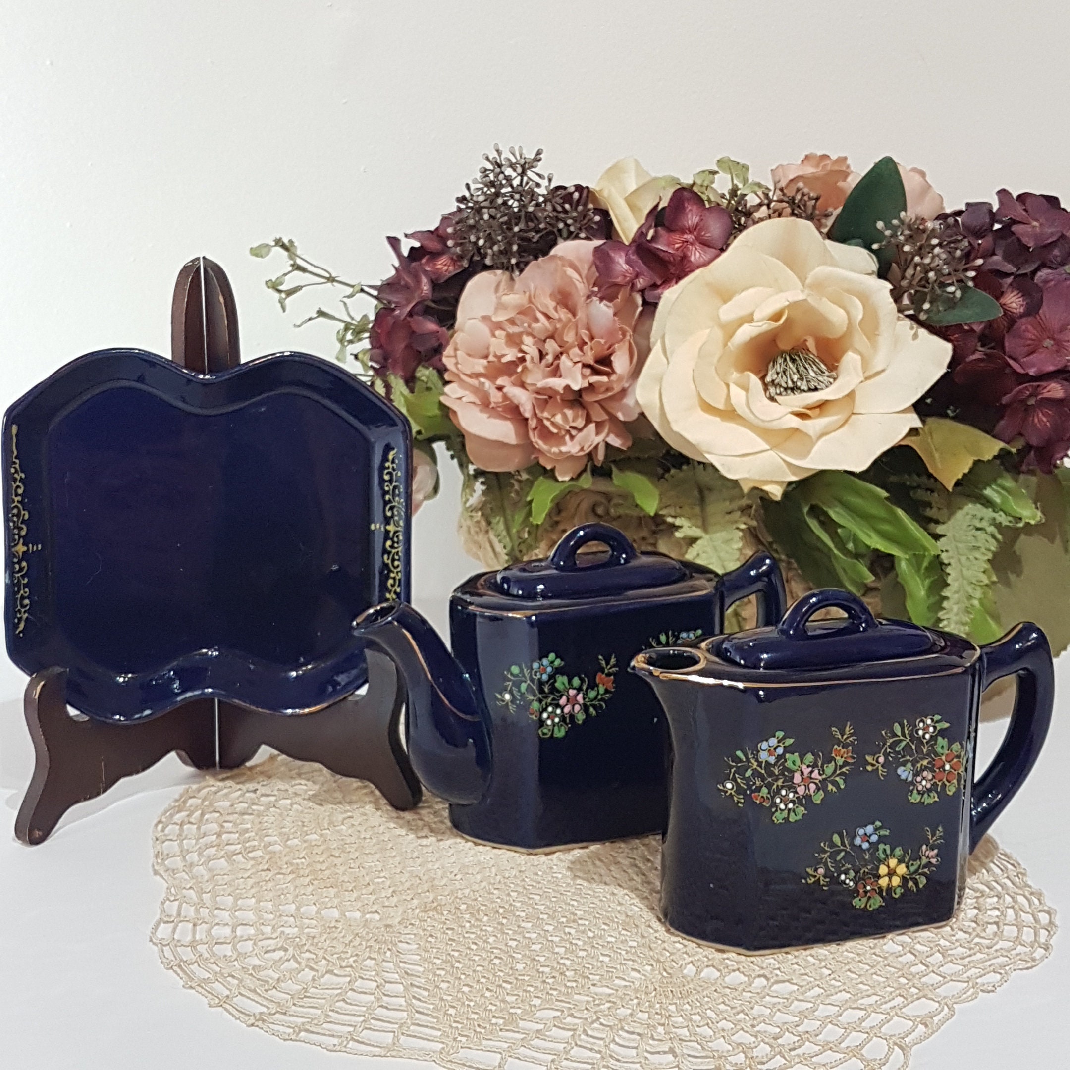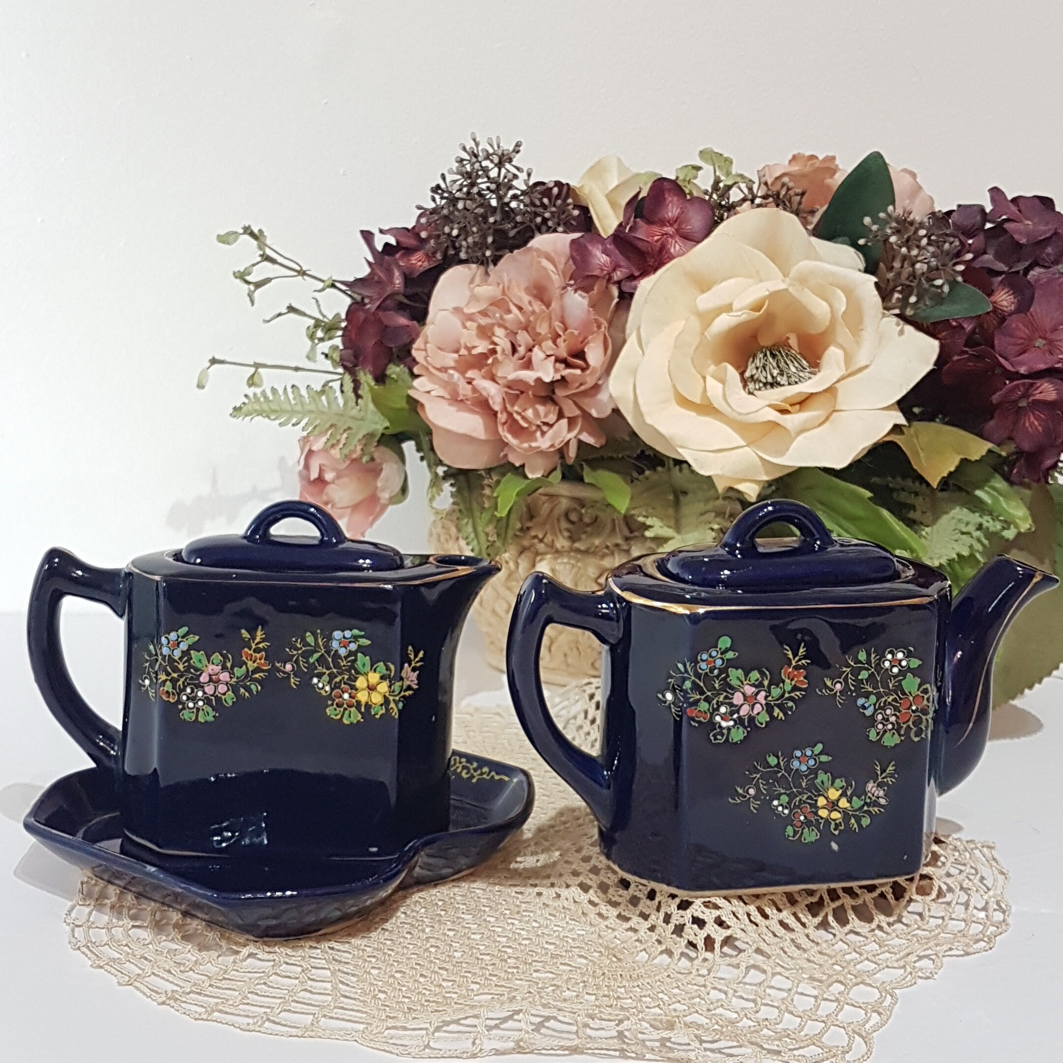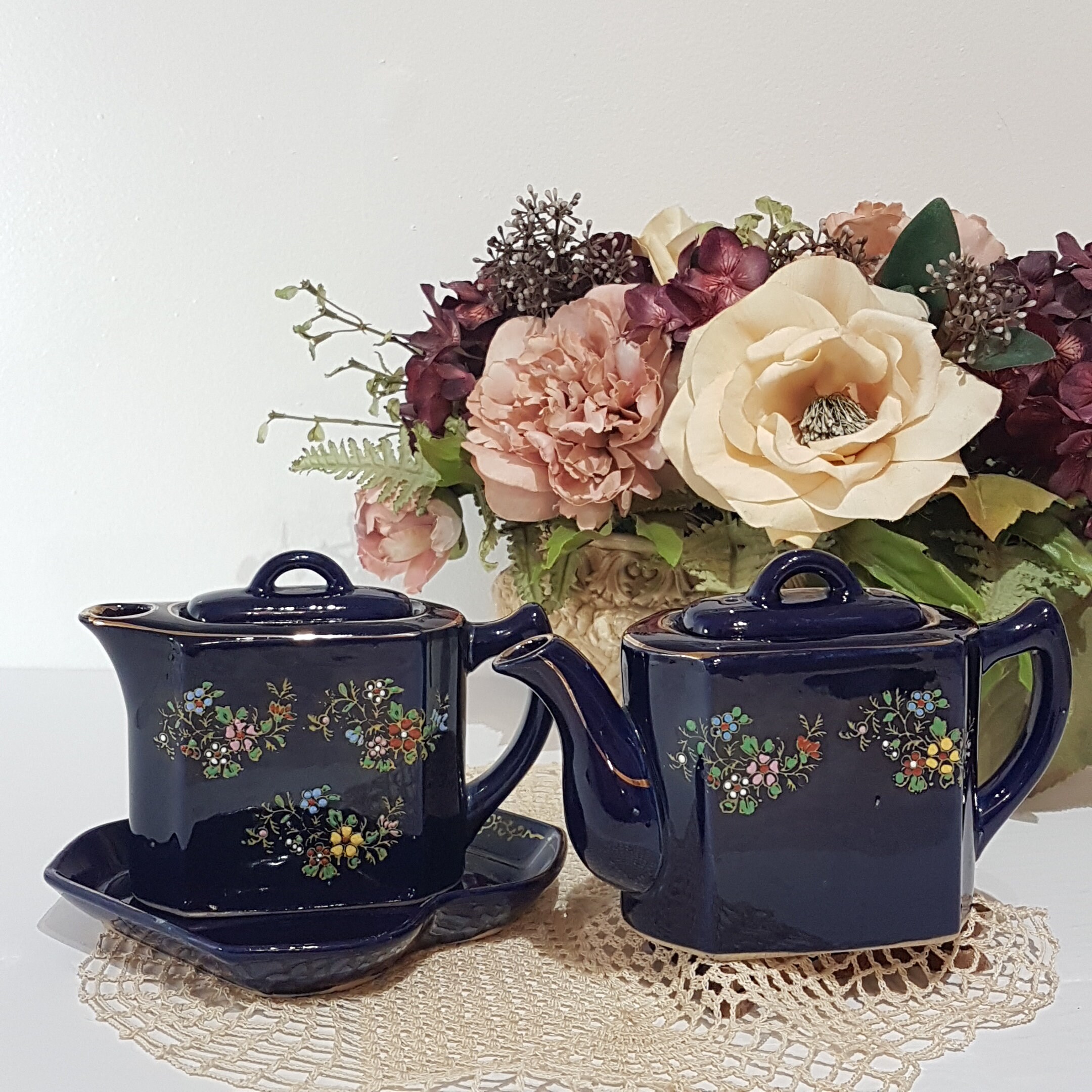 Double small teapots with tray. Hand painted flowers in yellow, pink, blue white and red on a cobalt blue. Gold gilt accent and trim. Use as one teapot for brewed tea and one for hot water or make a small pot of two different teas, to share with a friend!