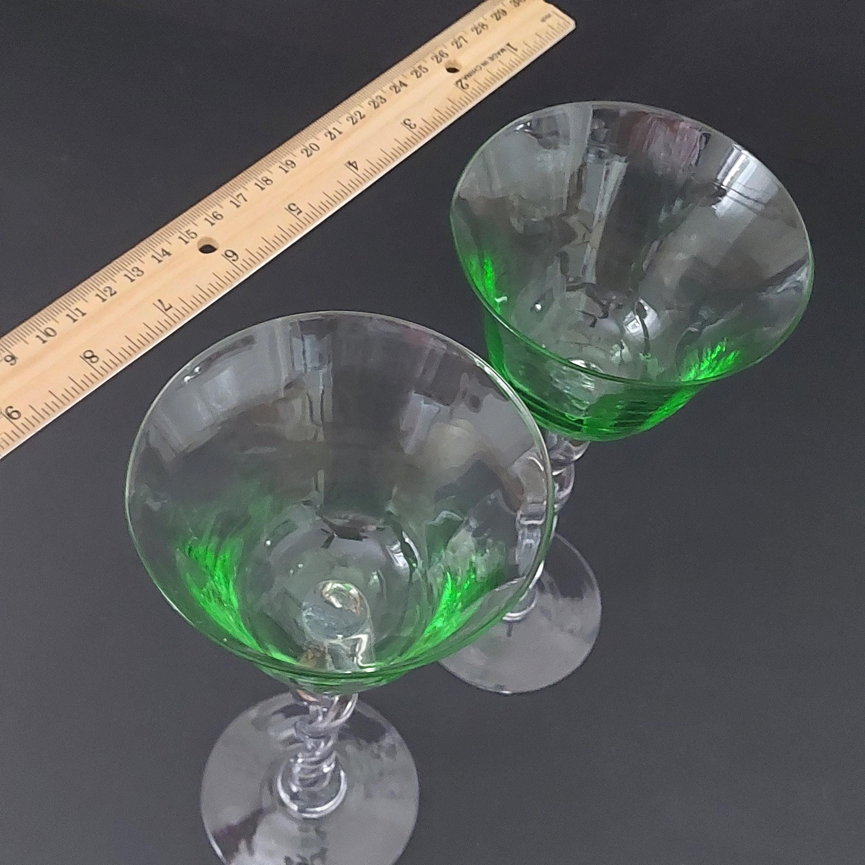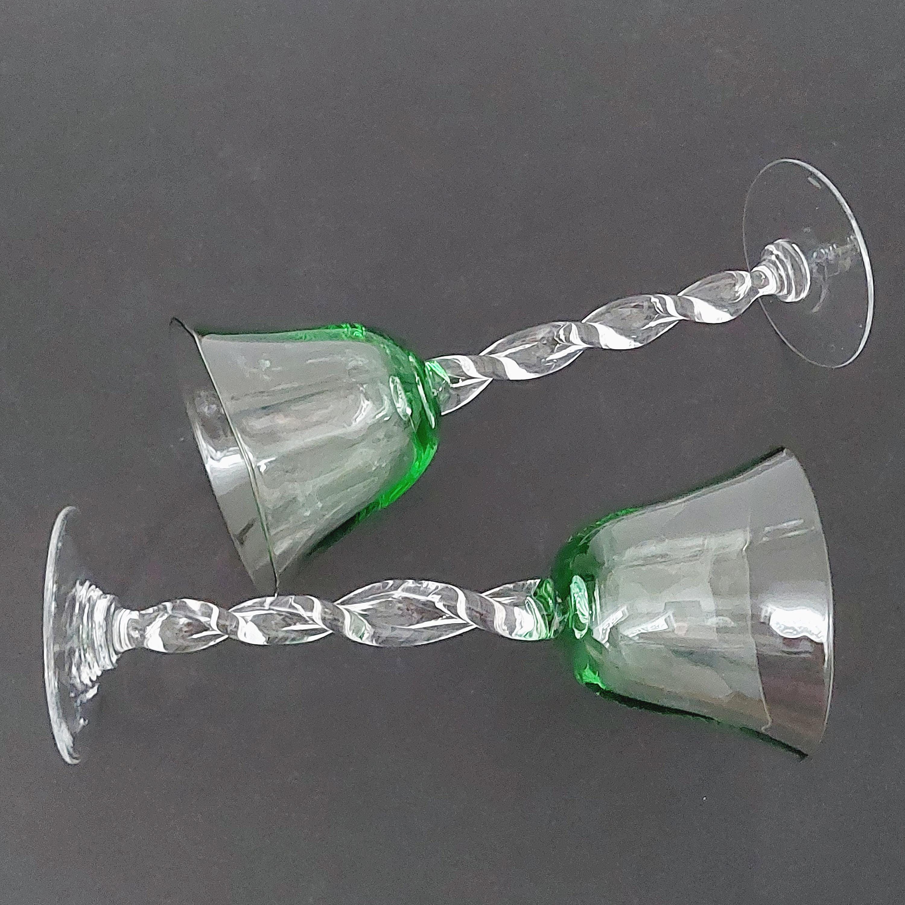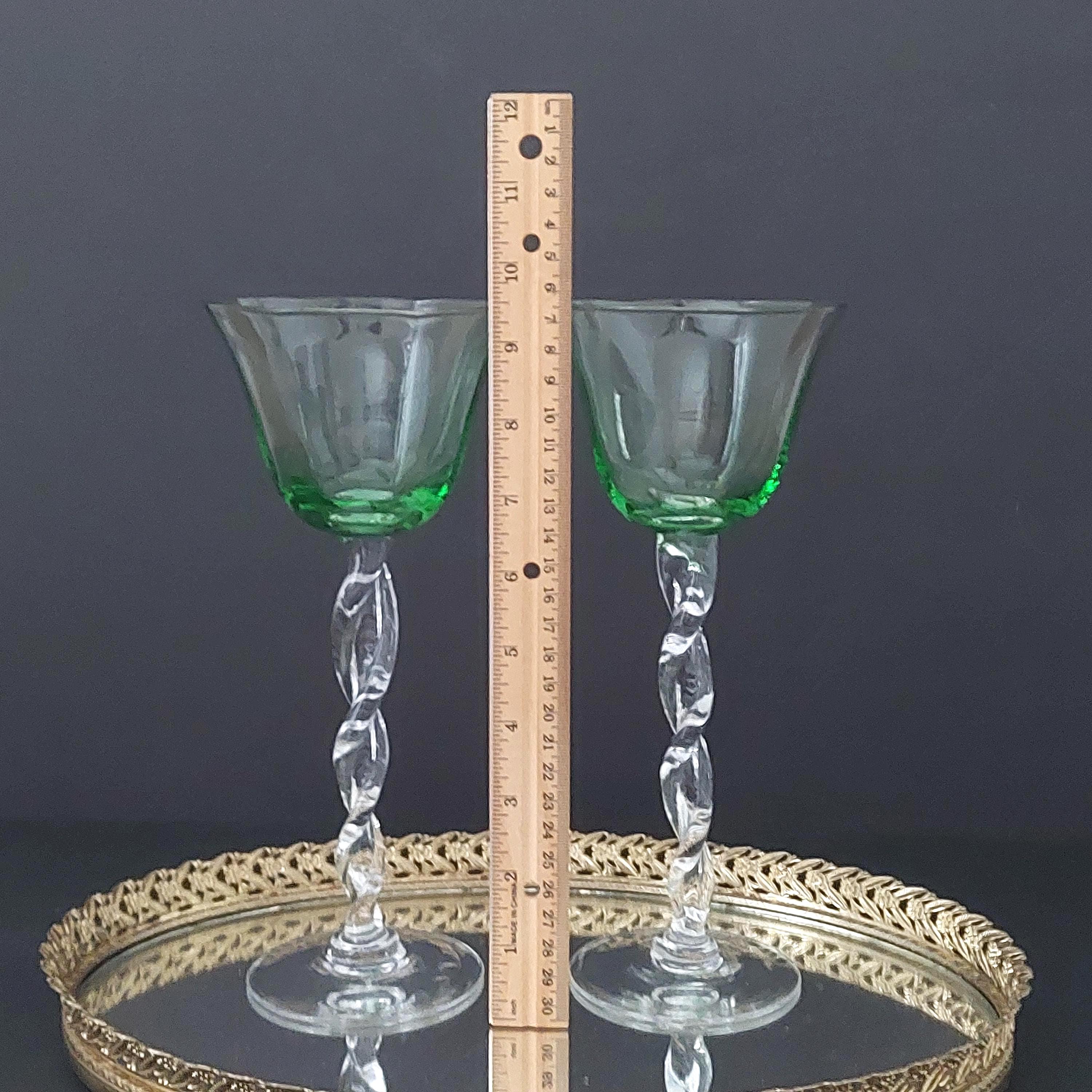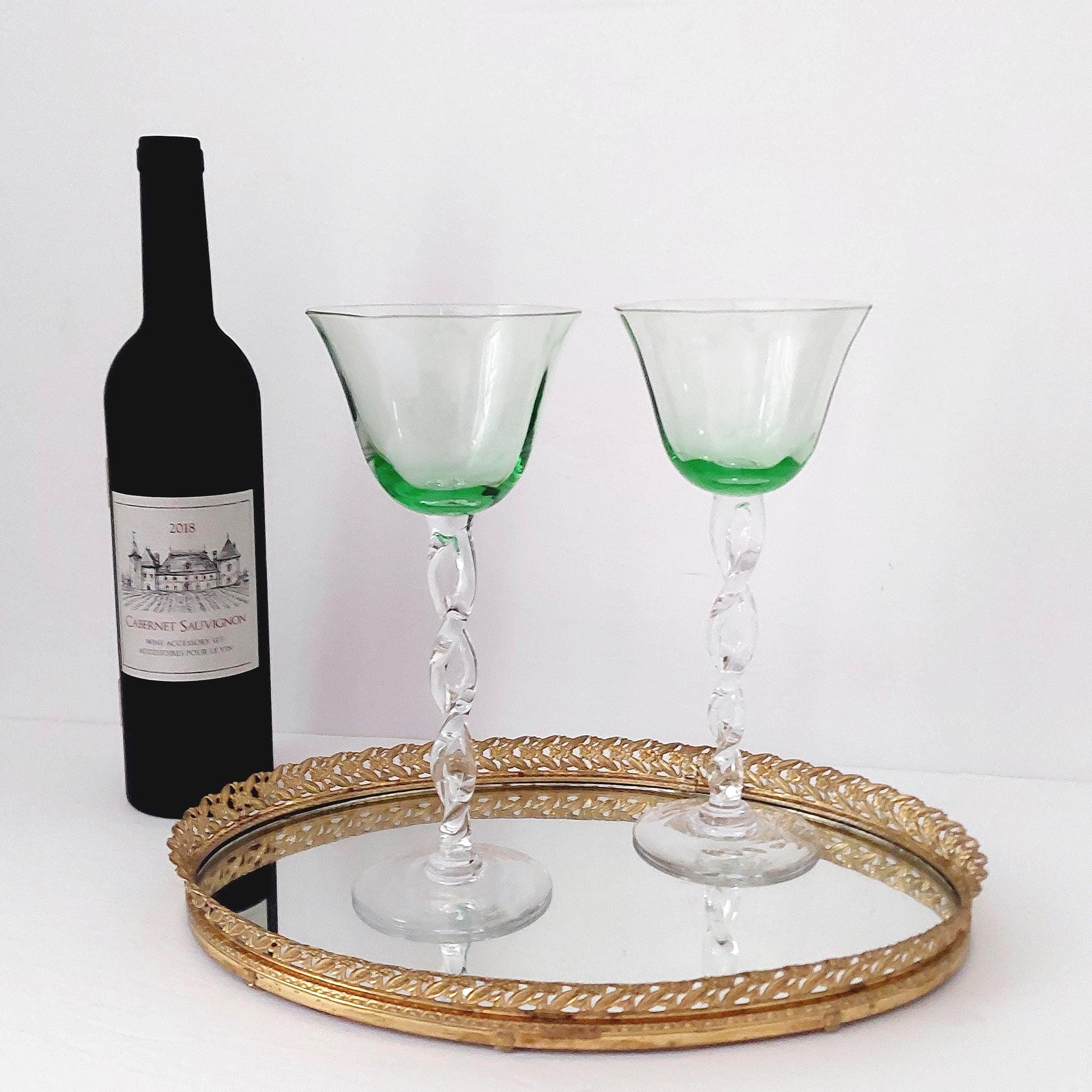 Set of 2 hand-blown green wine glasses featuring a clear twisted stem—each with slight size variations that highlight their artisanal charm. Standing 9 1/2" tall with a 4 1/8" rim diameter and 3 1/4" base, each glass holds 8 ounces comfortably. Vintage condition: no chips or cracks. Perfect as a wedding, birthday, or housewarming gift.
