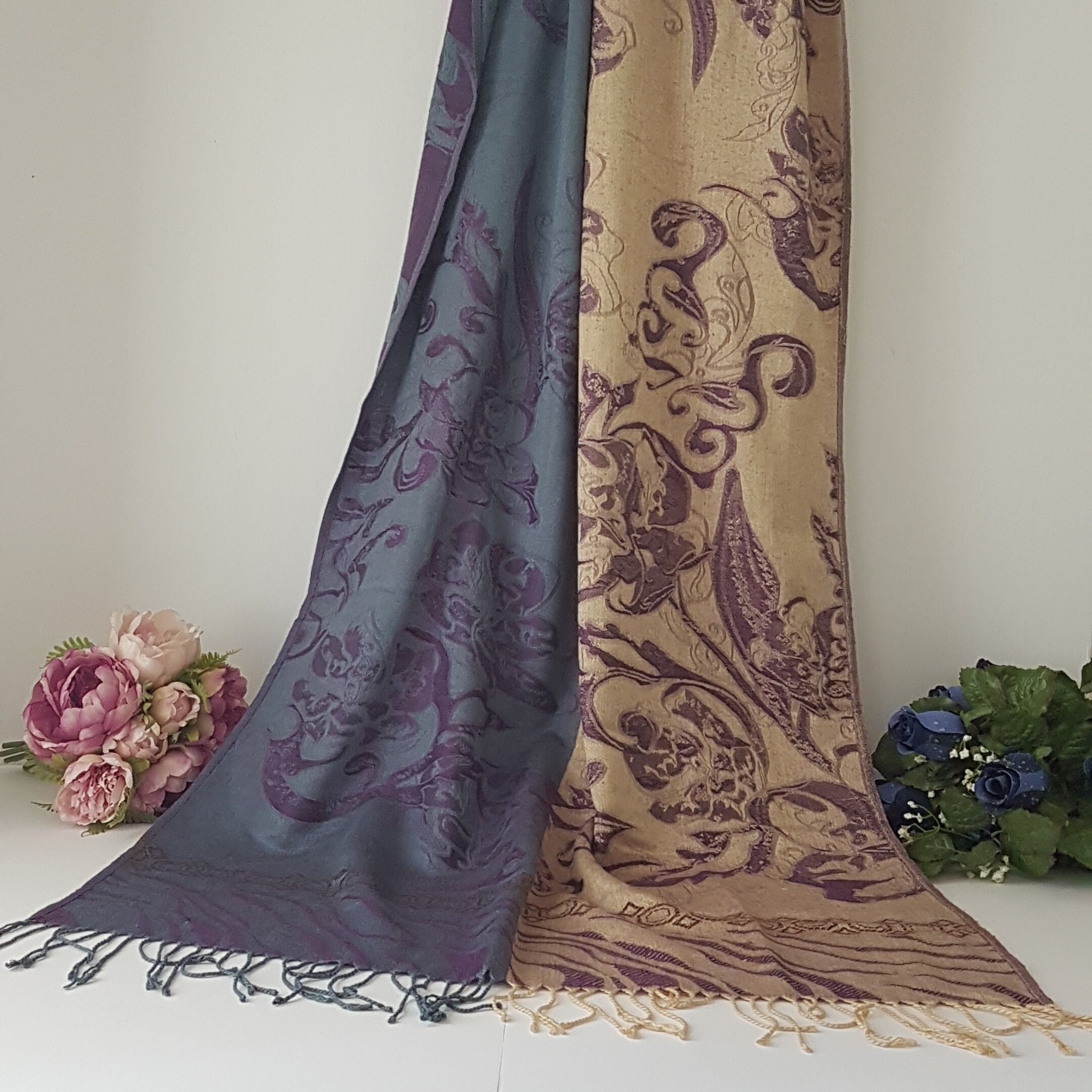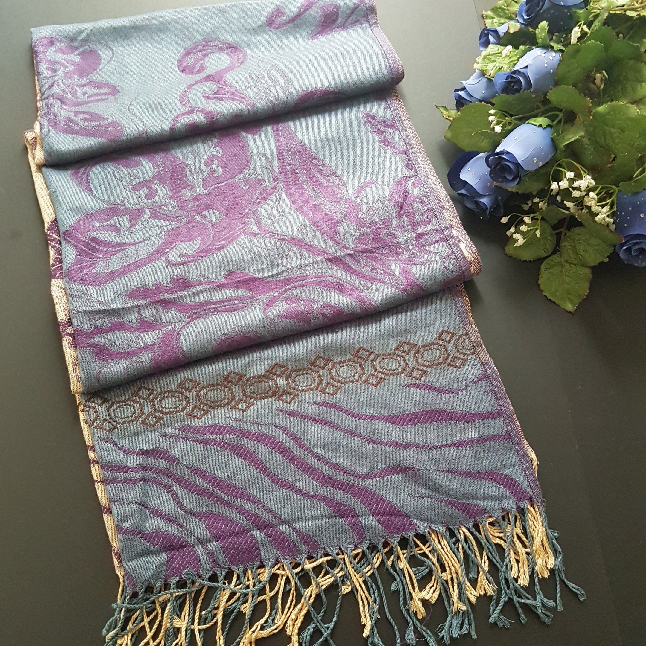 Two tone Pashmina of purple and beige and blue and purple, with long fringed ends. Both sides have a brown geometric pattern of squared circle and diamond shapes. Soft and lightweight, lovely as evening shawl or special occasions like weddings, parties and celebrations.