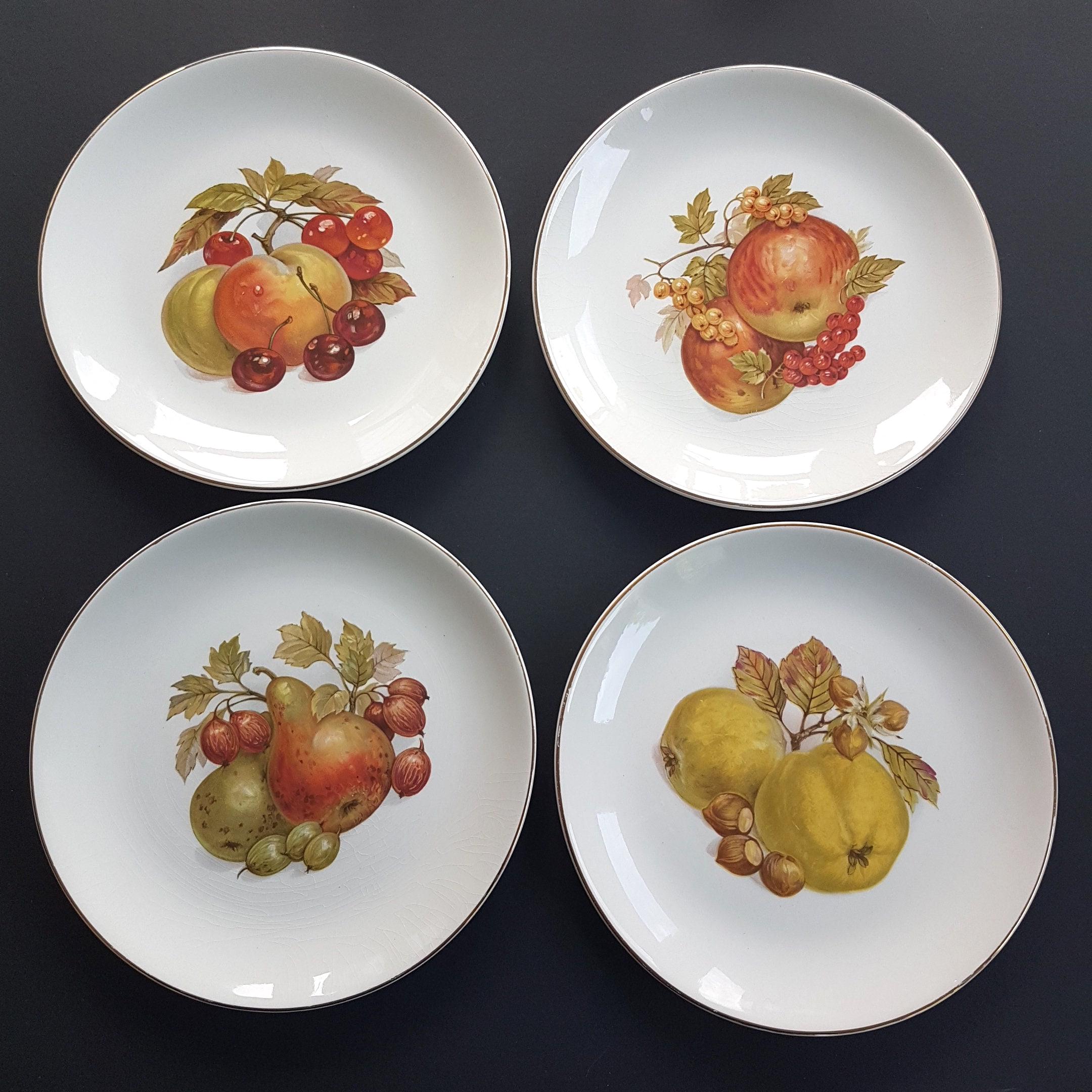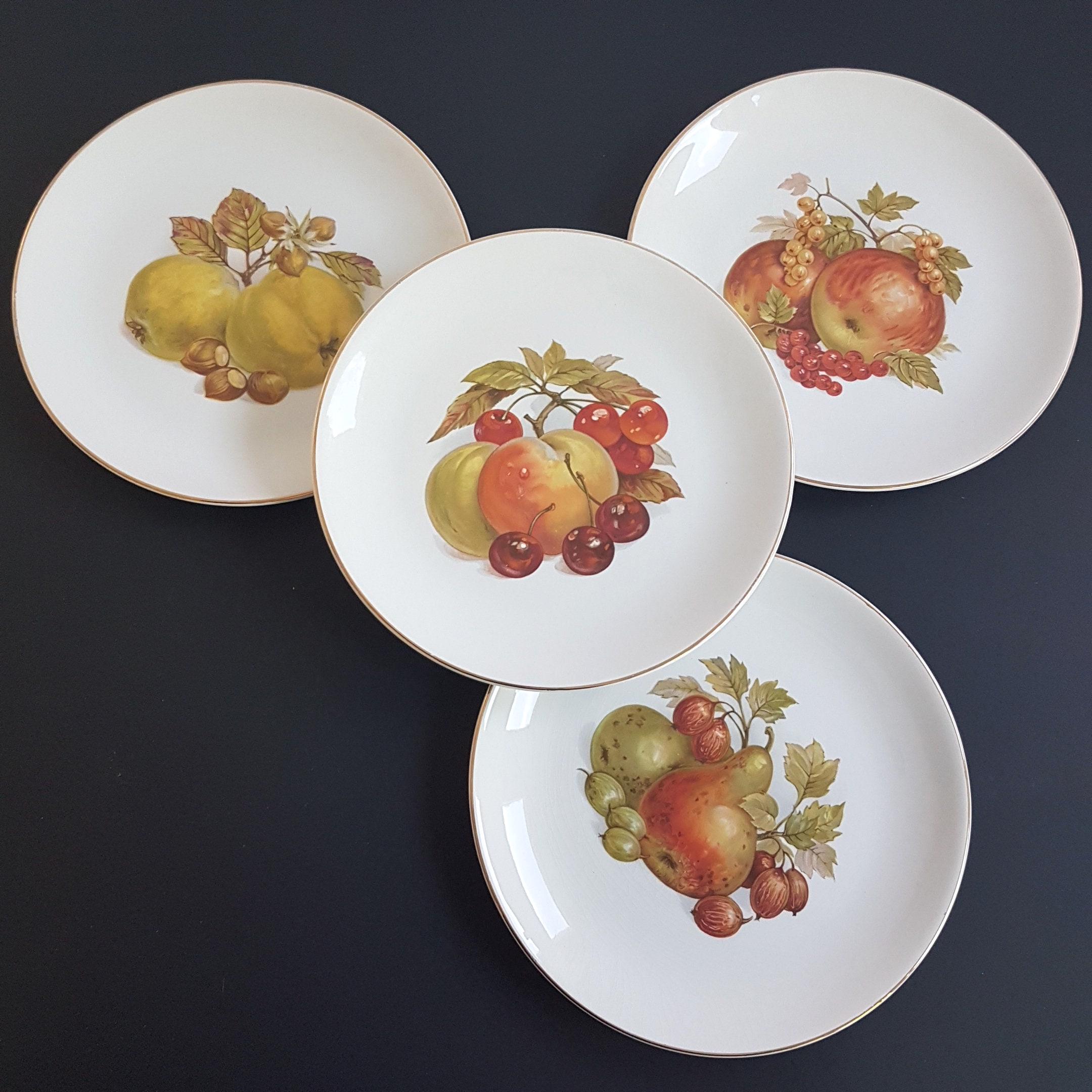 Set of 4 ironstone salad plates decorated with various fruit centers of apples, pears, nuts, berries and cherries. Each plate has a different fruit pattern. Gold edge. Made in England.