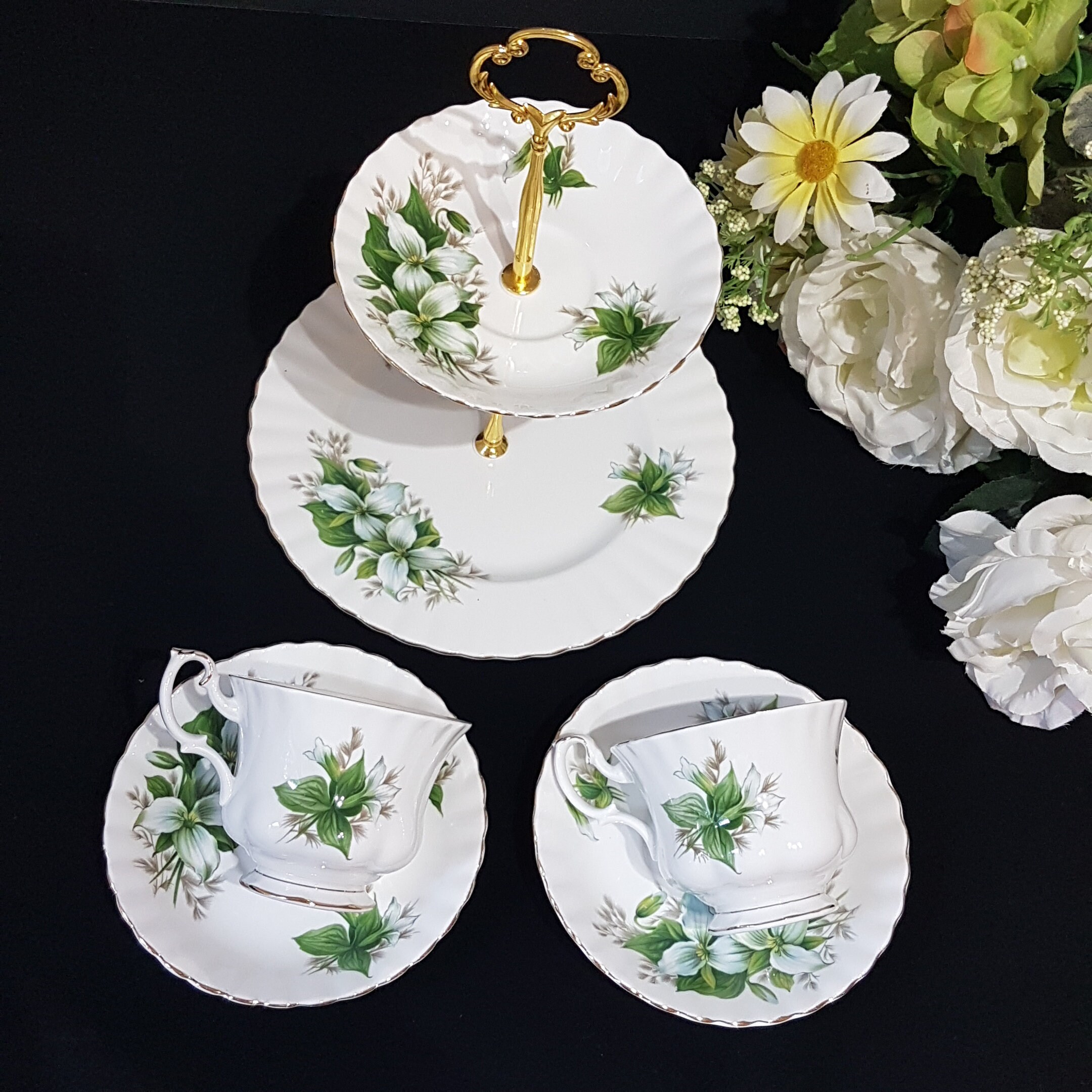 Afternoon tea party for 2 in Royal Albert's Trillium pattern. Includes two tier cake stand, made by me, using vintage plates and new hardware and 2 matching tea cups and saucers.