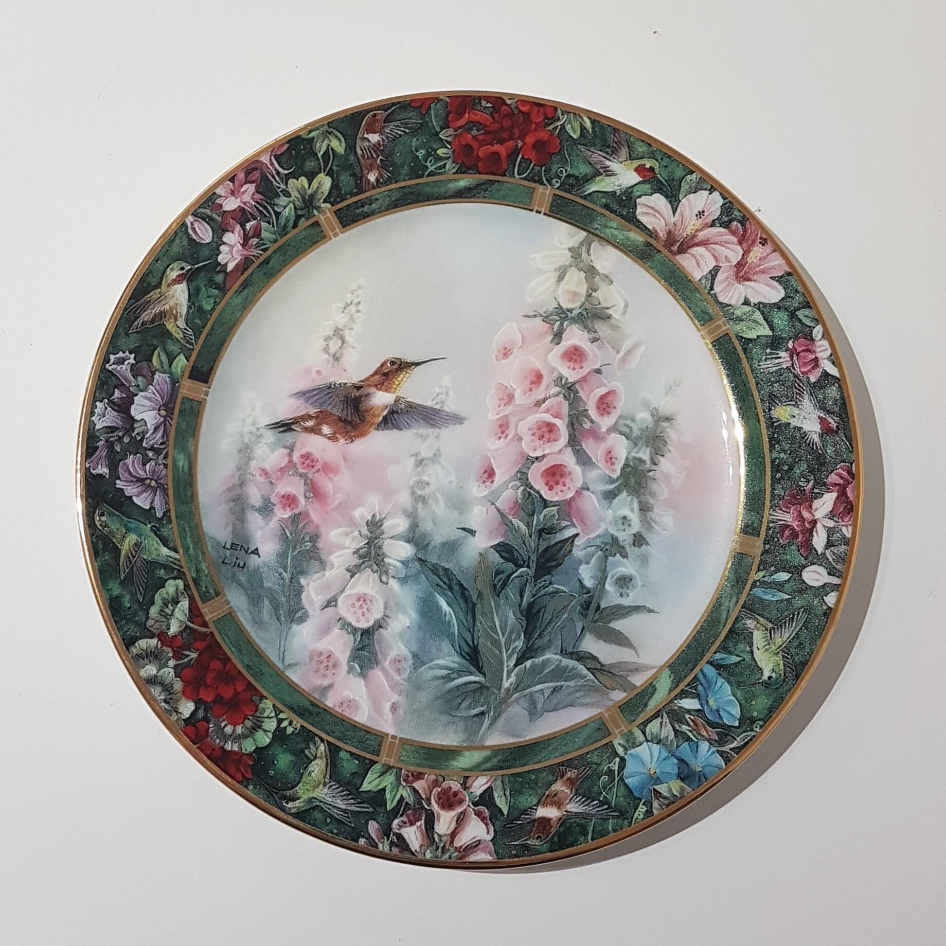 Lena Liu's captured the essence of The Rufous hummingbird flying to have a sip of nectar from the pink foxglove flowers. Collectible wall plate.
