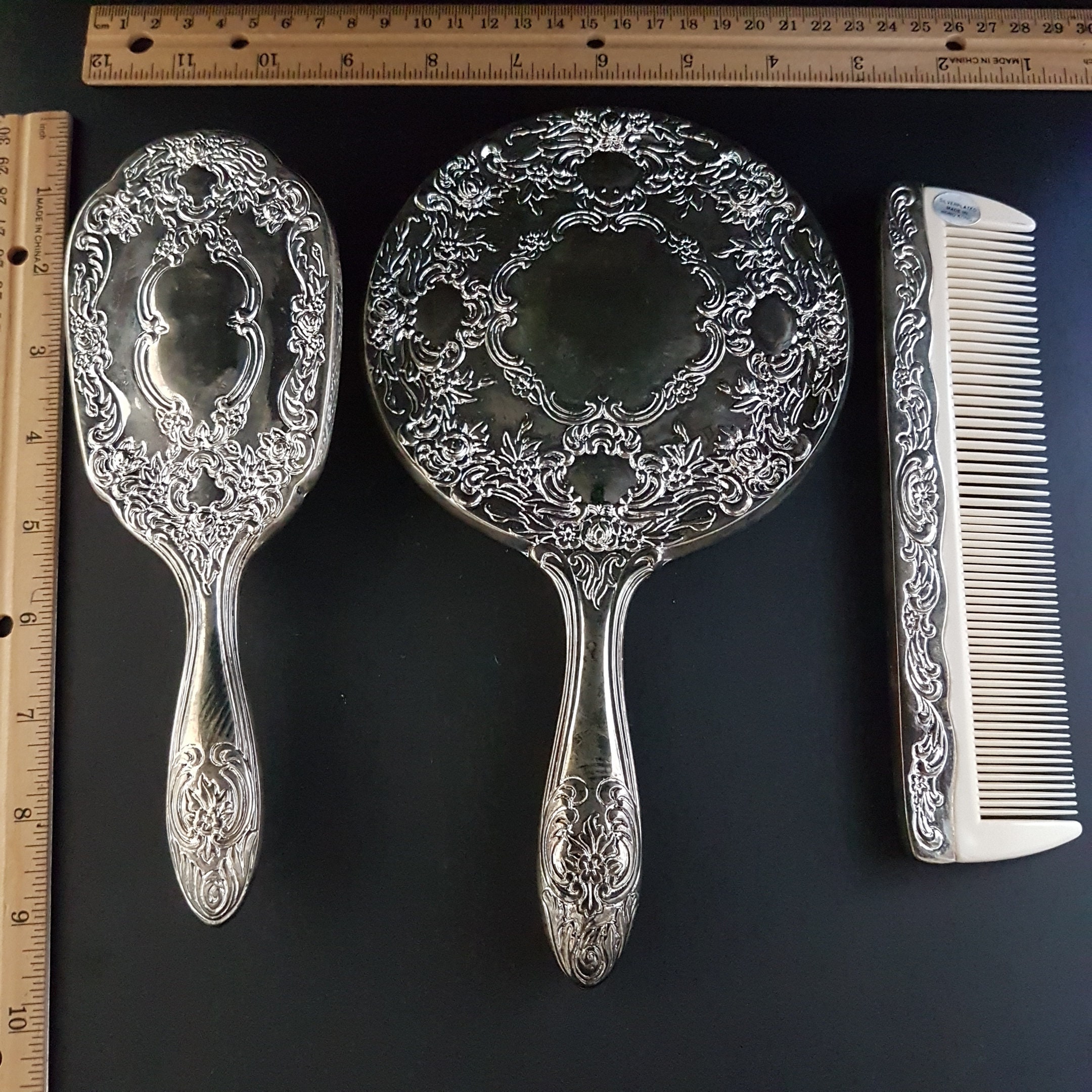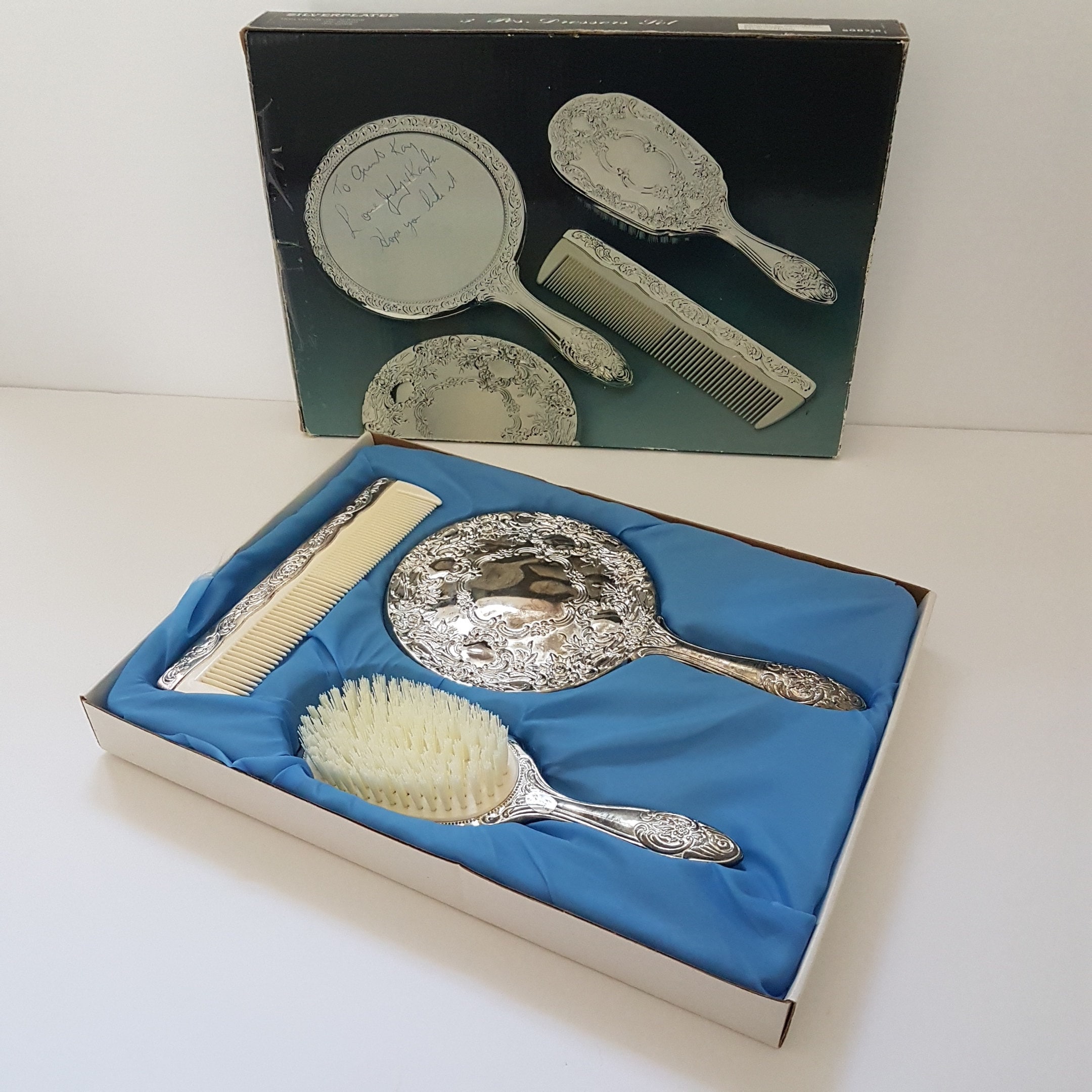 On box: "3 Pcs Dressers Set - Silverplated - Made in Hong Kong"