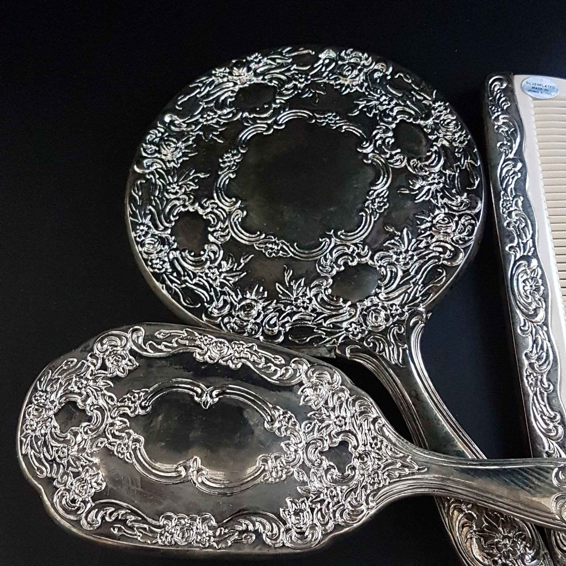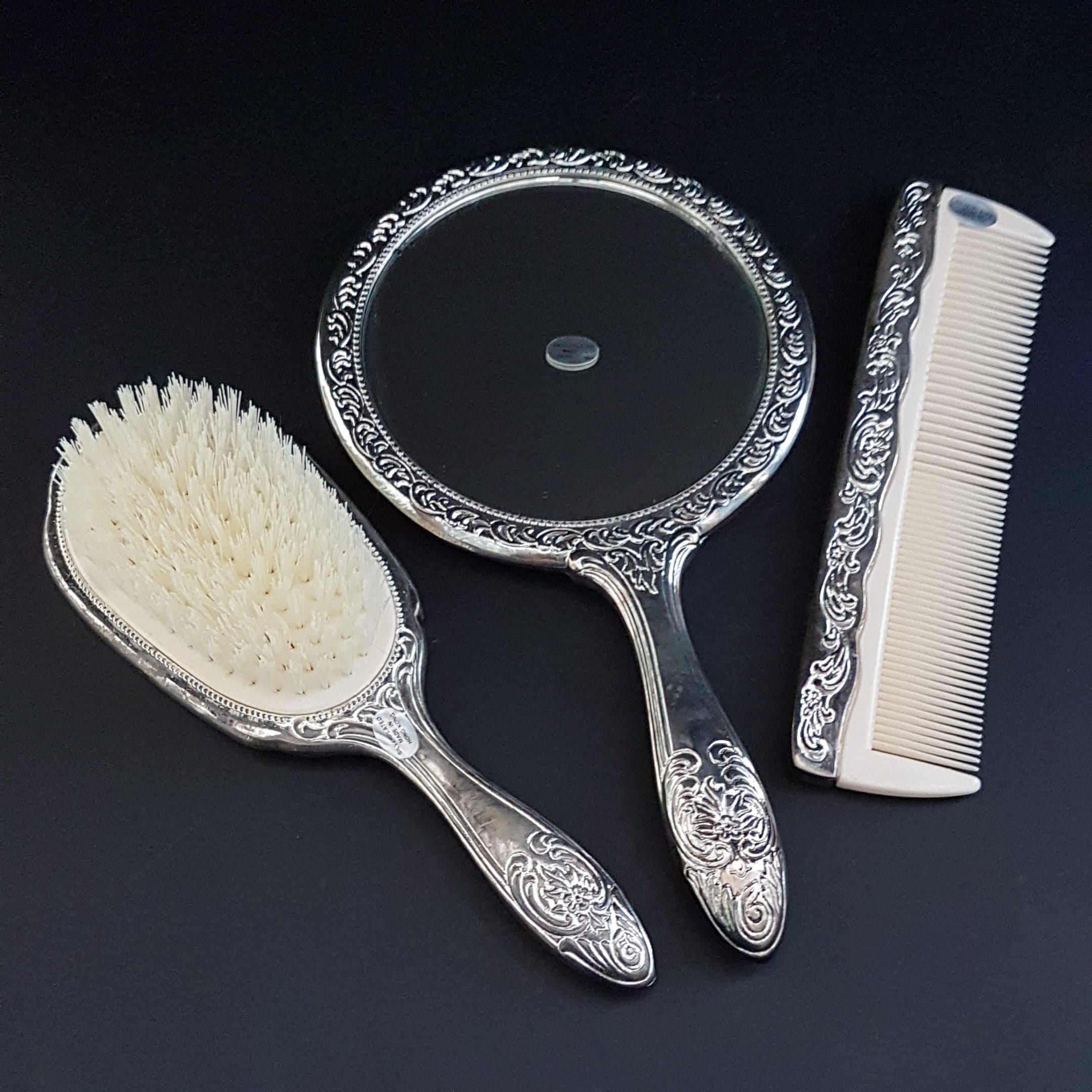 Brush, Comb & Hand Mirror have original sticker labels: "Silverplated - Made in Hong Kong"