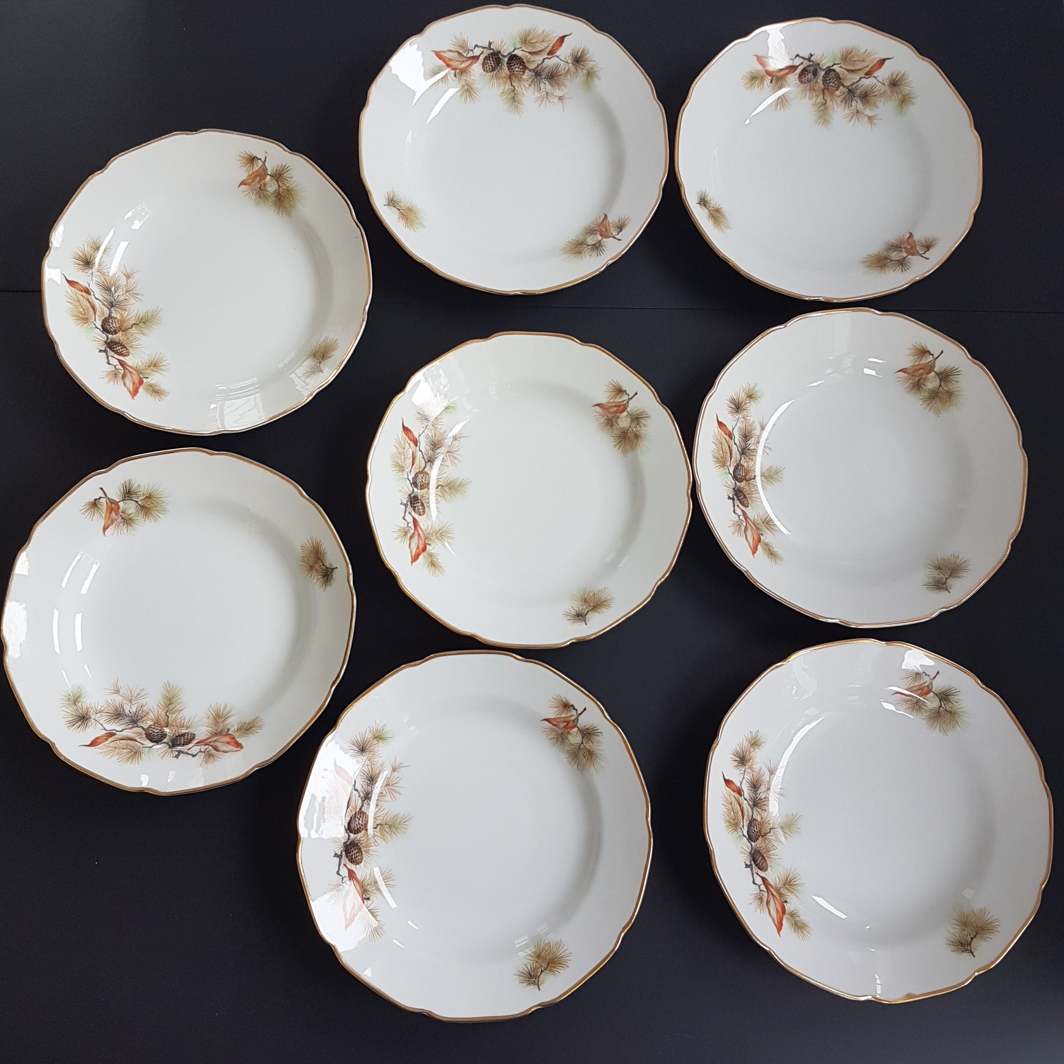 Pine Tree by Fine Translucent China of Japan. Pine tree branches with pine cones on a crisp white. Gold gilt on edge of rim. Set of 4 rim soup bowls.