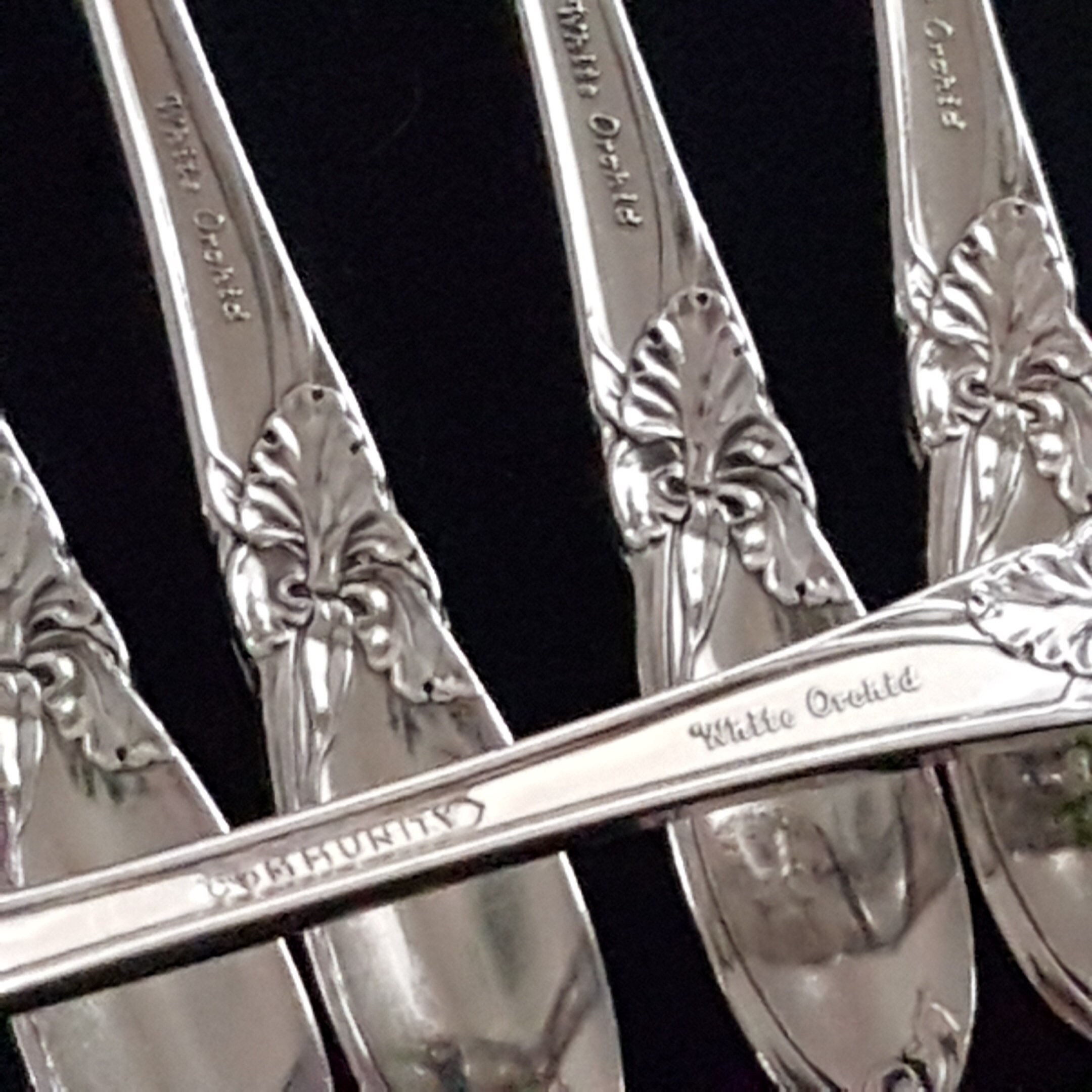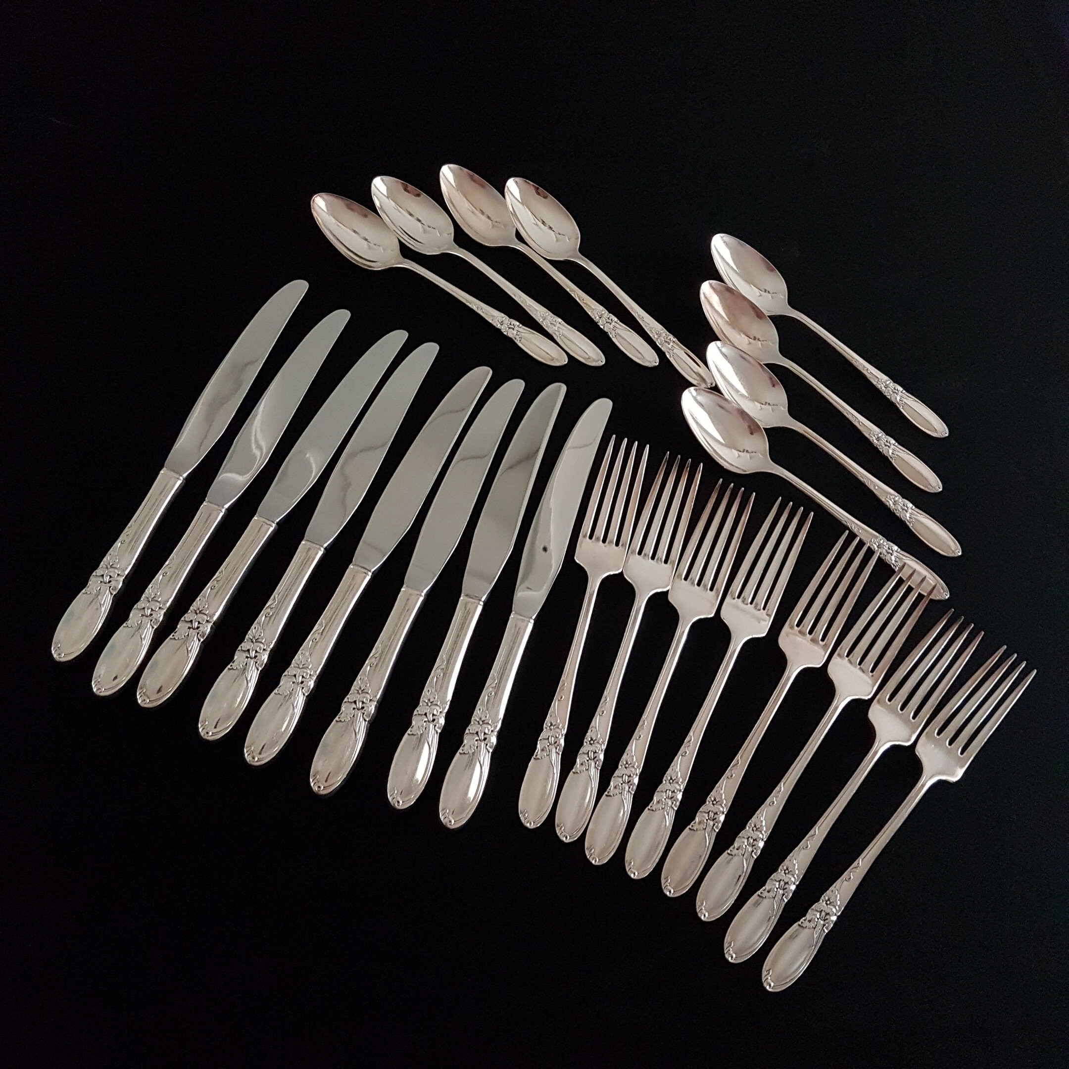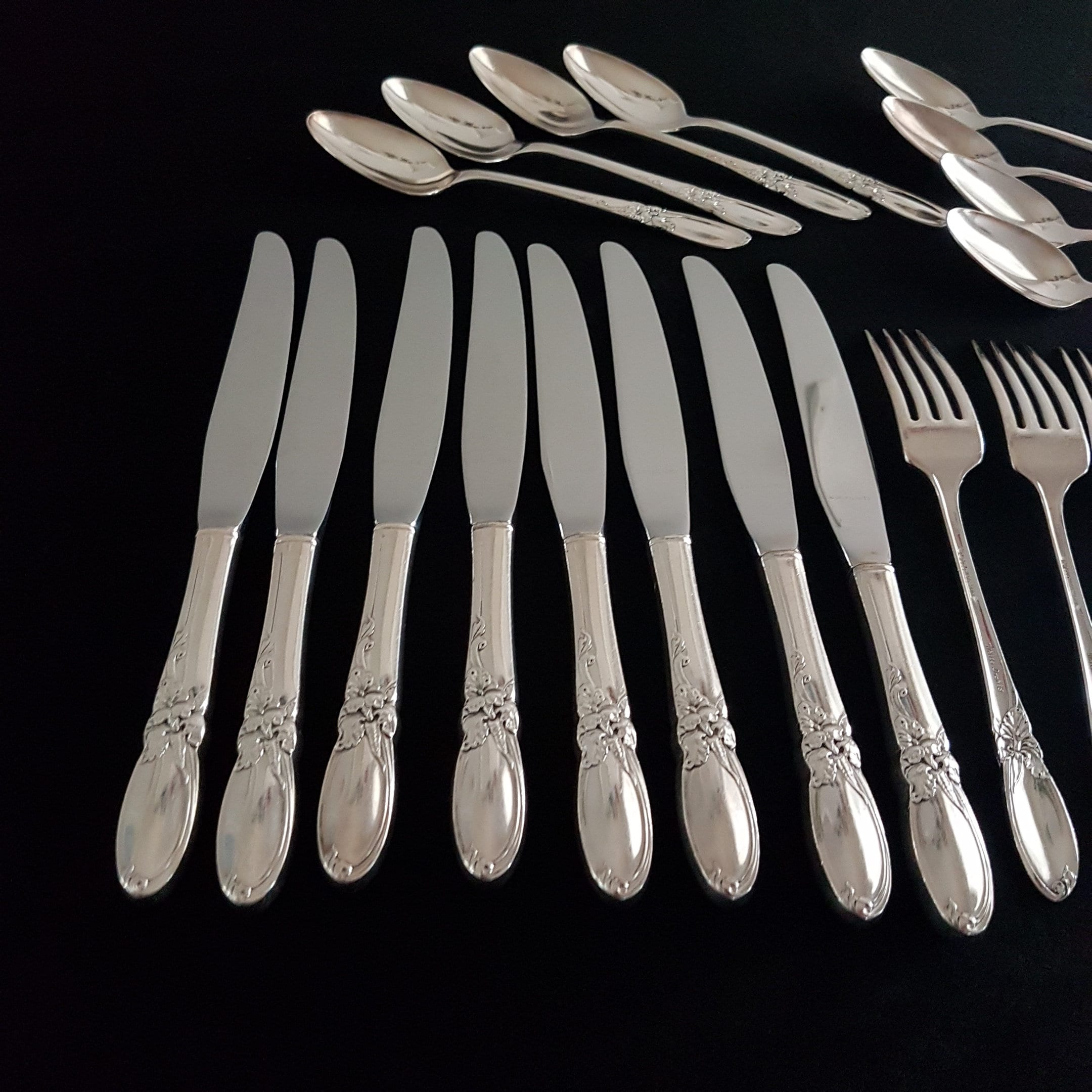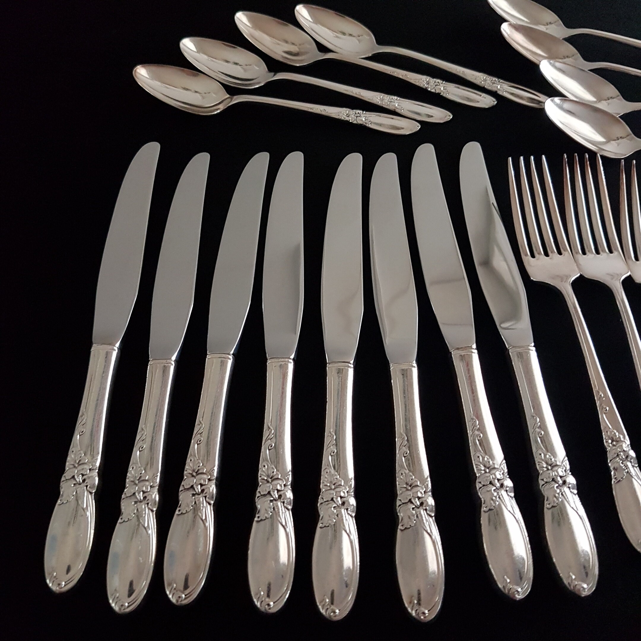 24 piece set of White Orchid by Community Plate, Oneida Silver. Eight pieces each of dinner knife, dinner fork and teaspoon. circa 1953. Now discontinued.