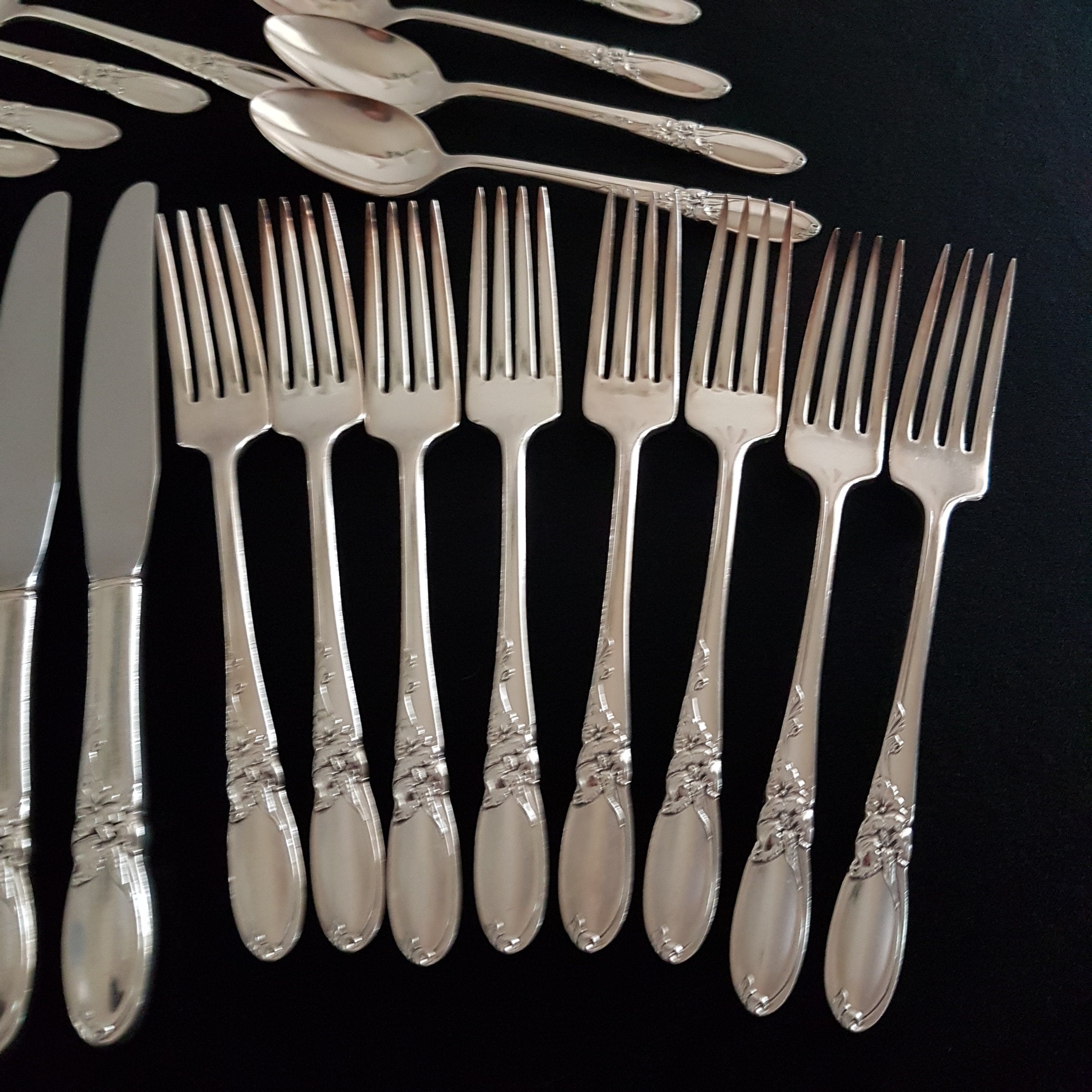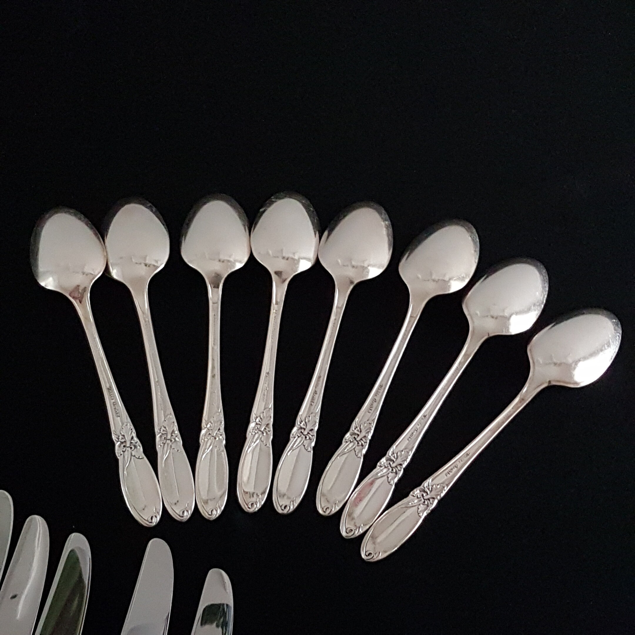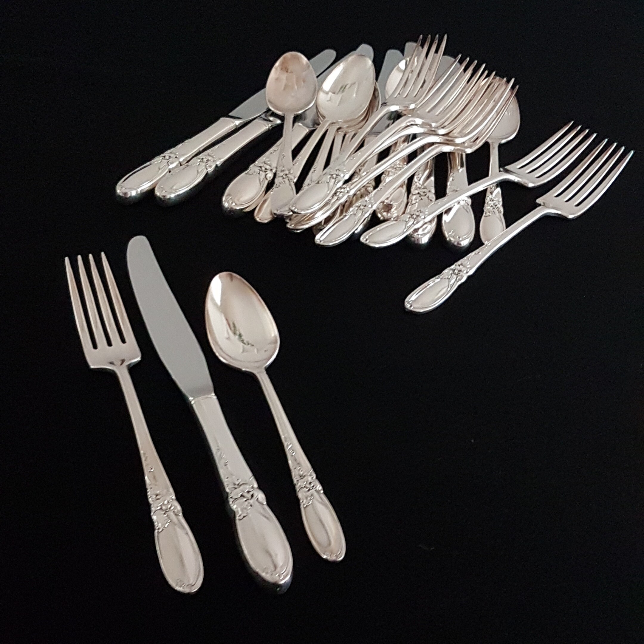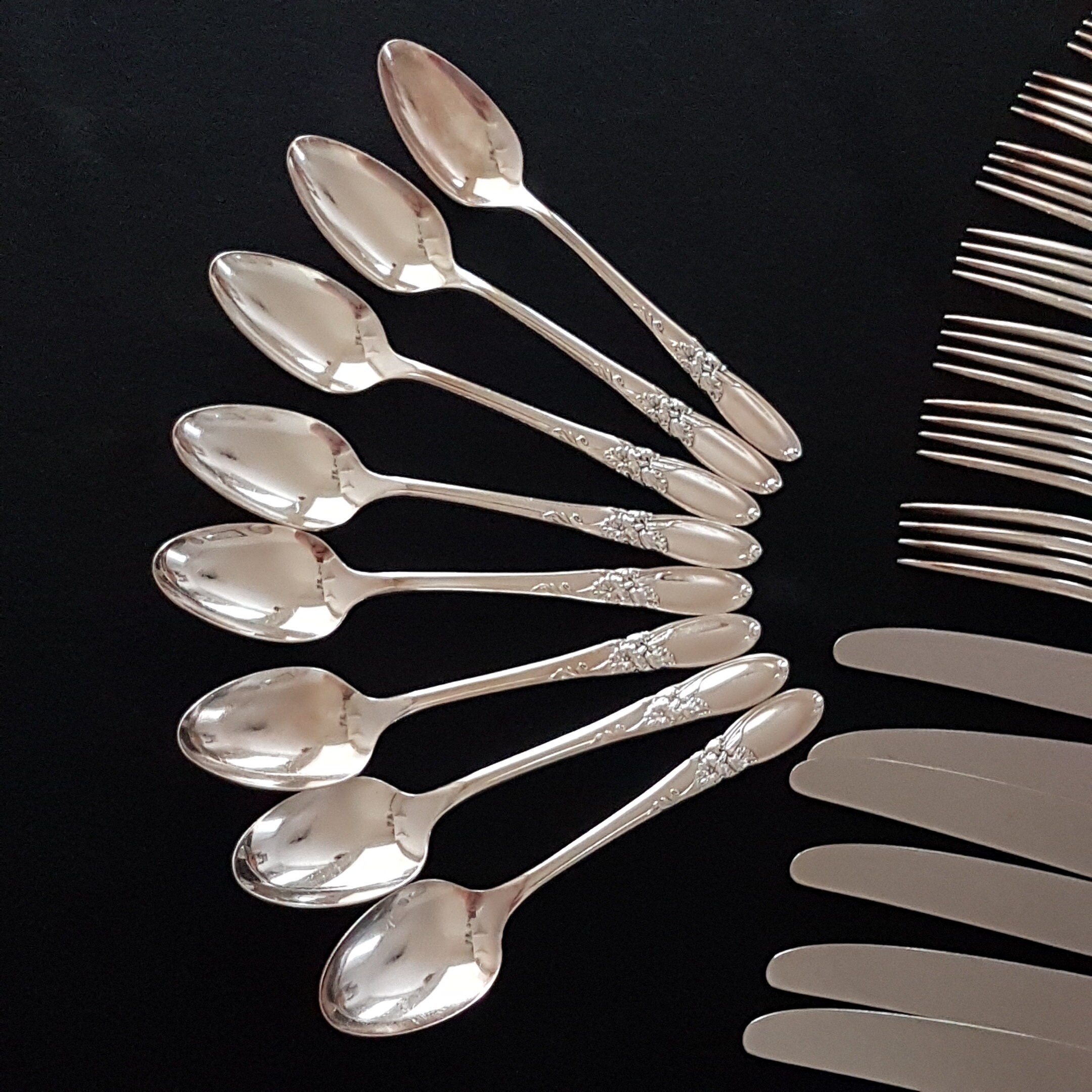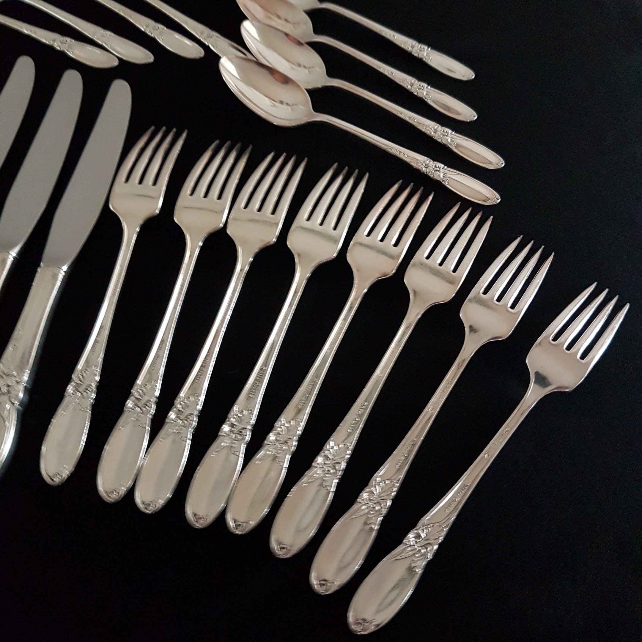 24 piece set of White Orchid by Community Plate, Oneida Silver. Eight pieces each of dinner knife, dinner fork and teaspoon. circa 1953. Now discontinued.
