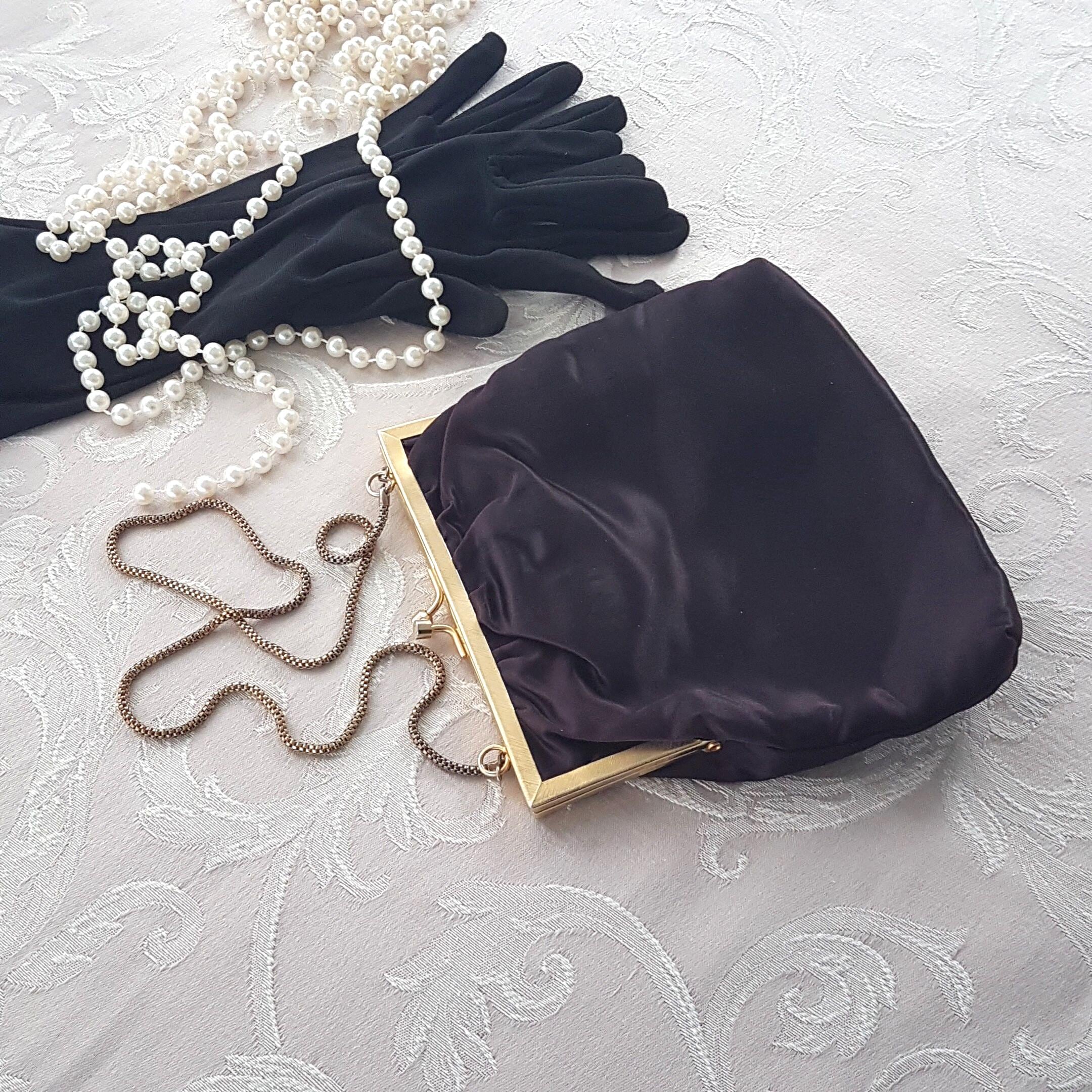 1960s black cloth evening bag with long gold tone chain. Gold tone metal bracket. Lined with a golden yellow sateen with handy pocket on one side. Feels like a foam in between the cloth layers to help shape the purse. Gold tone chain is tarnished.