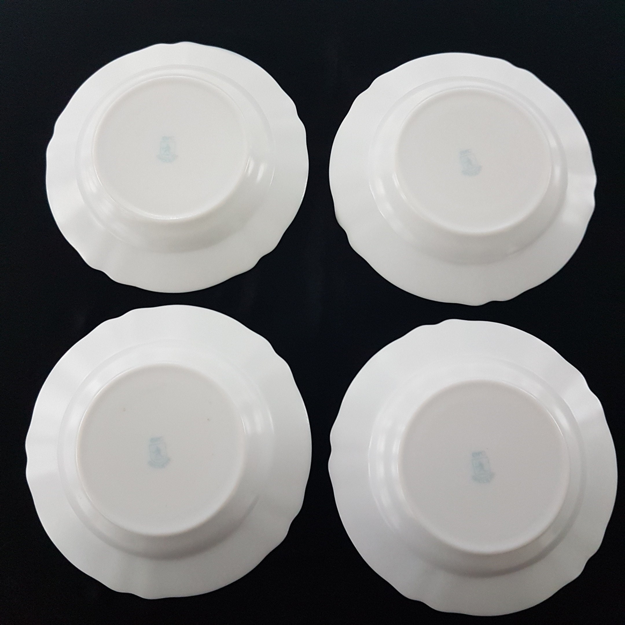 Arcopal Romantique pattern of blue roses and white daisy flowers on white milk glass. Blue trim and scalloped edge. Set of 4 large rim soup bowls