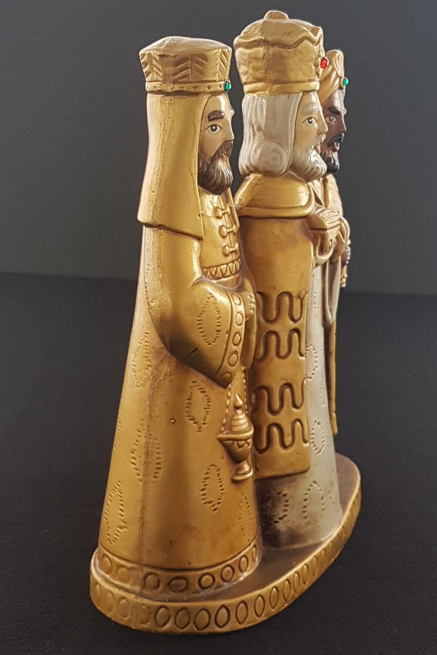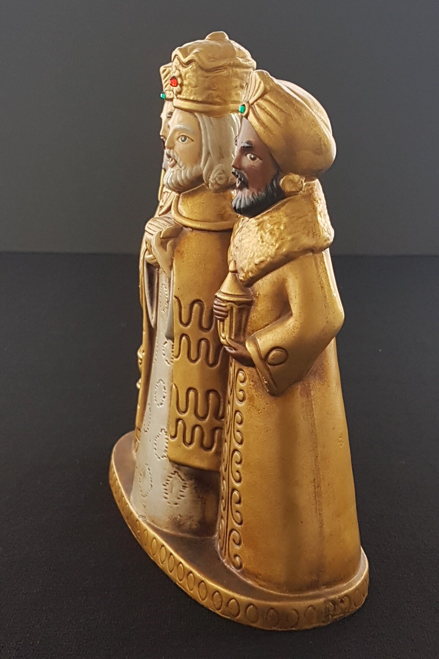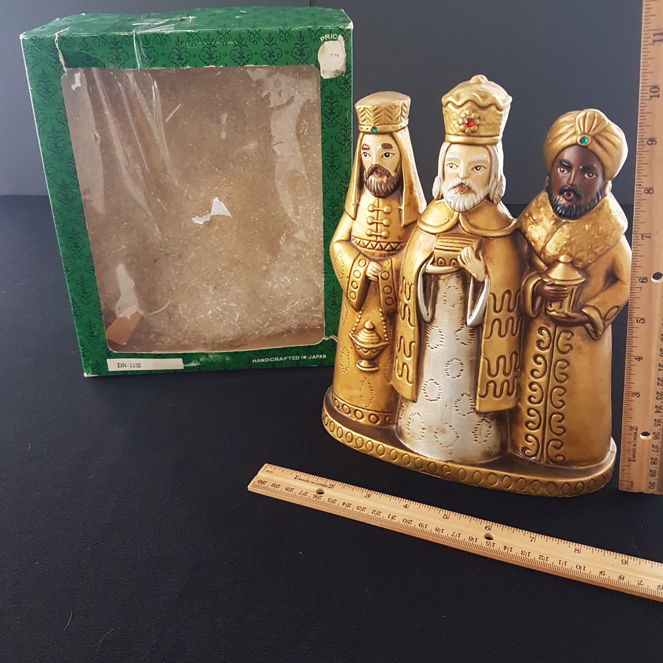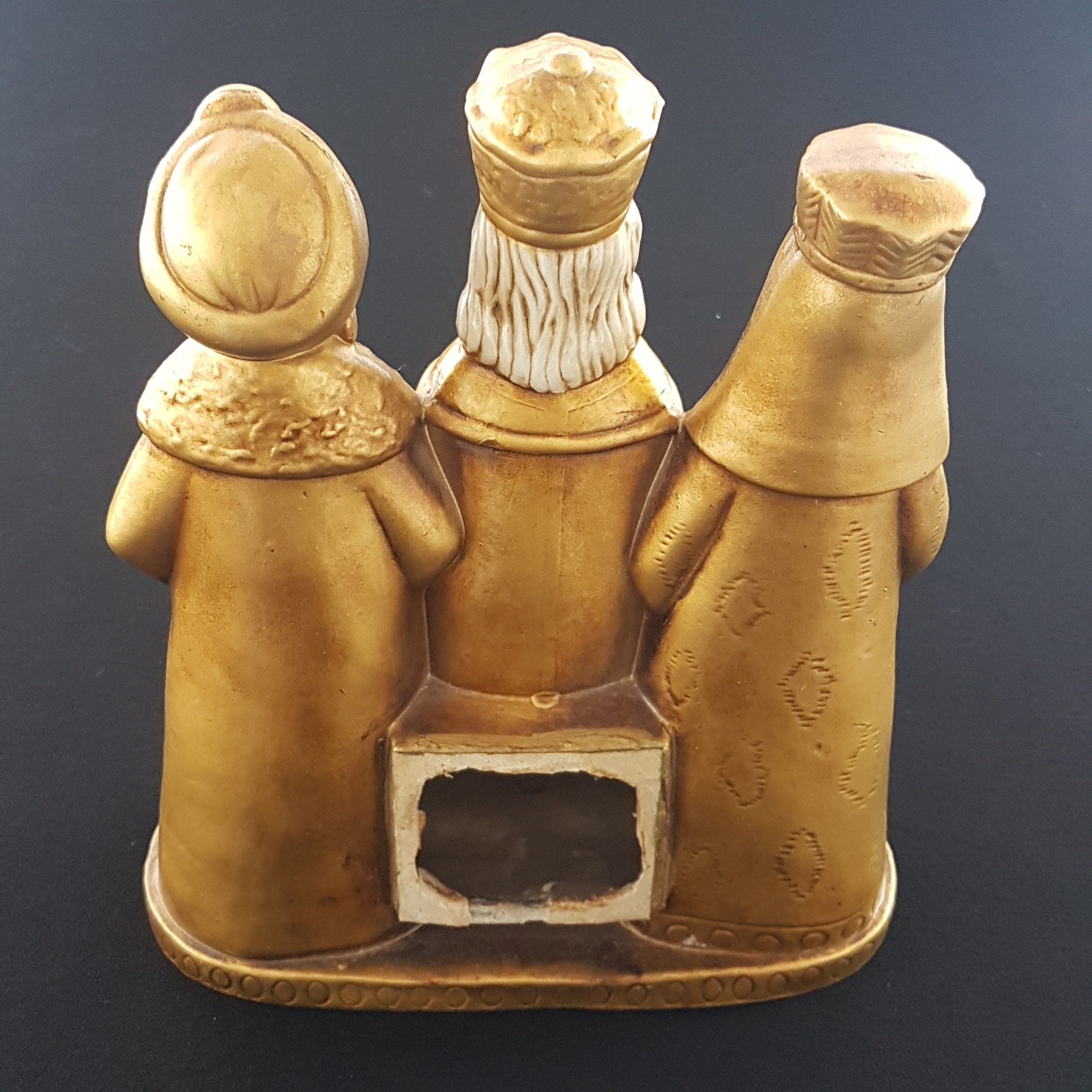 Vintage 3 Wise Men figurine made of resin plaster. Hollow figurine with open square at the back, that has remnants of cardboard / paperboard that once covered the opening. This is not a votive candle holder.