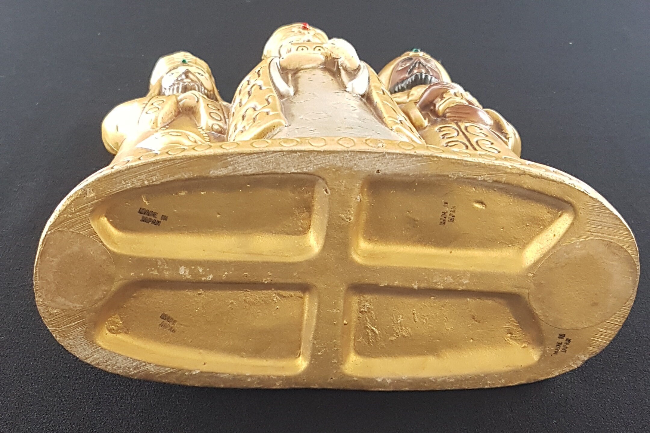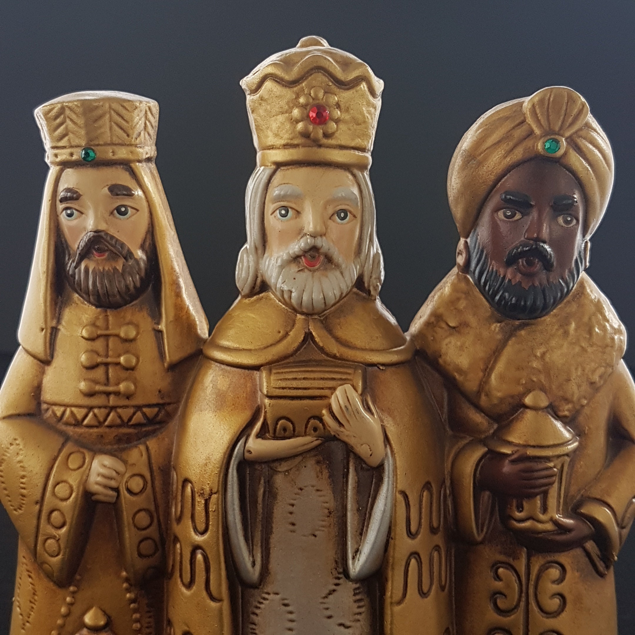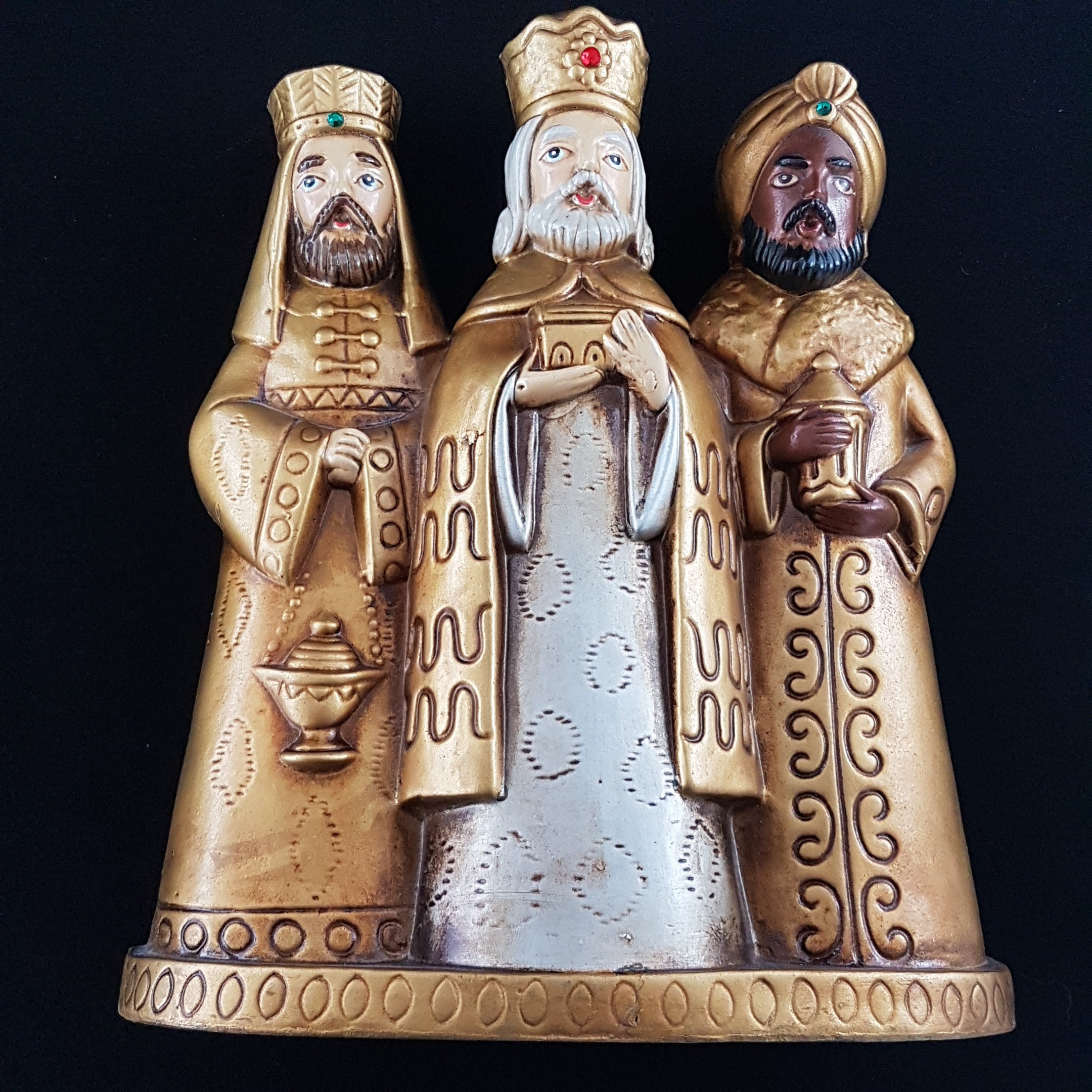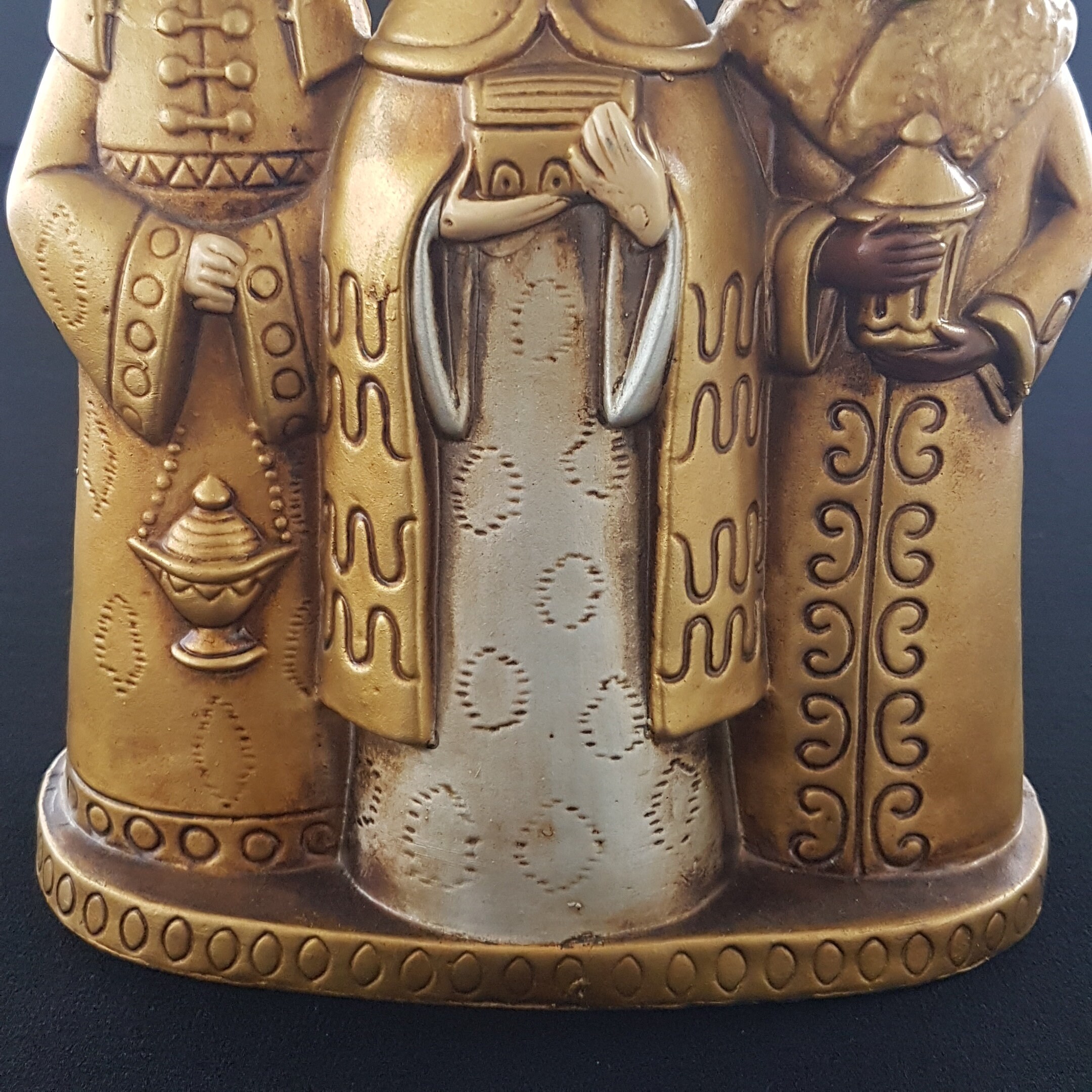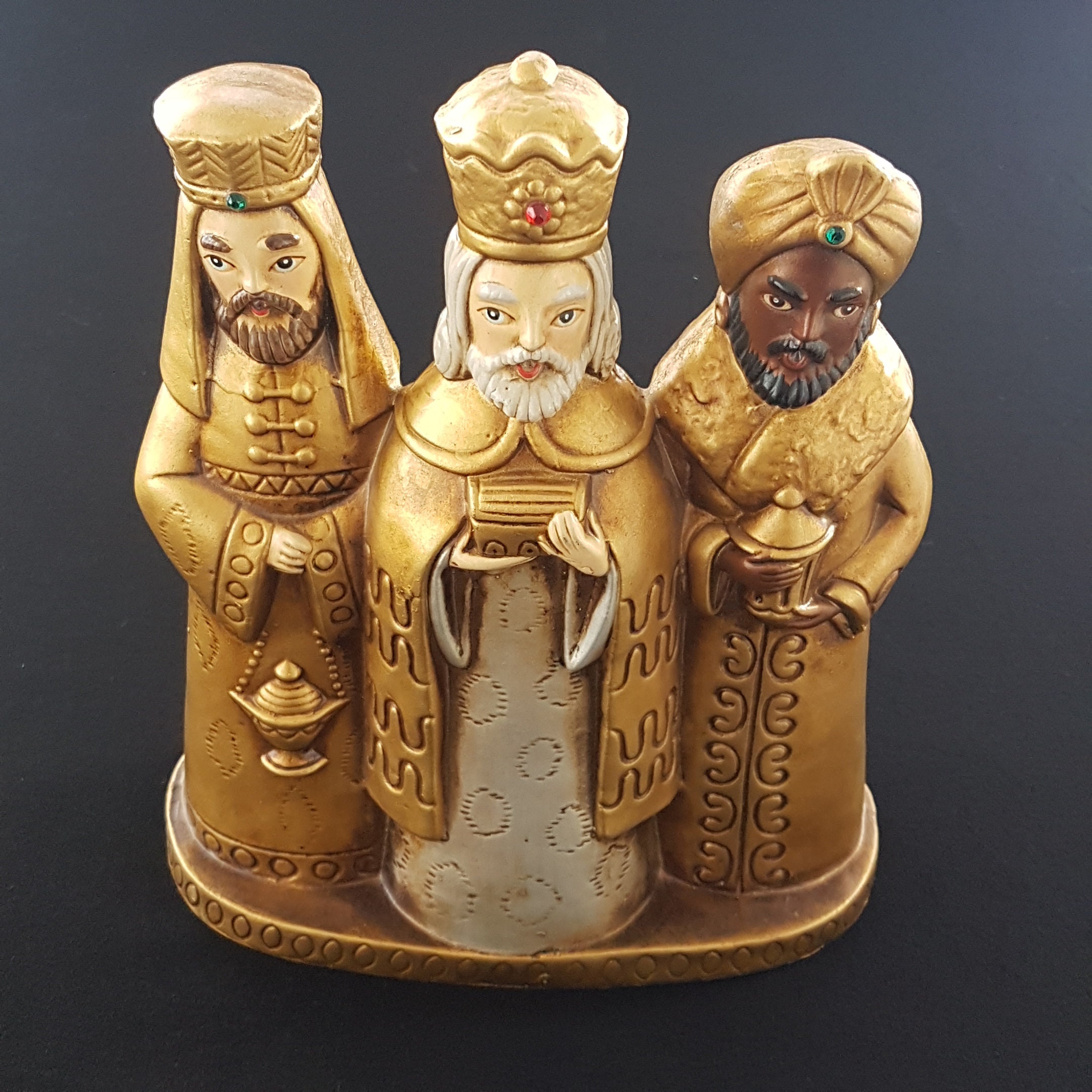 Vintage 3 Wise Men figurine made of resin plaster. Hollow figurine with open square at the back, that has remnants of cardboard / paperboard that once covered the opening. This is not a votive candle holder.