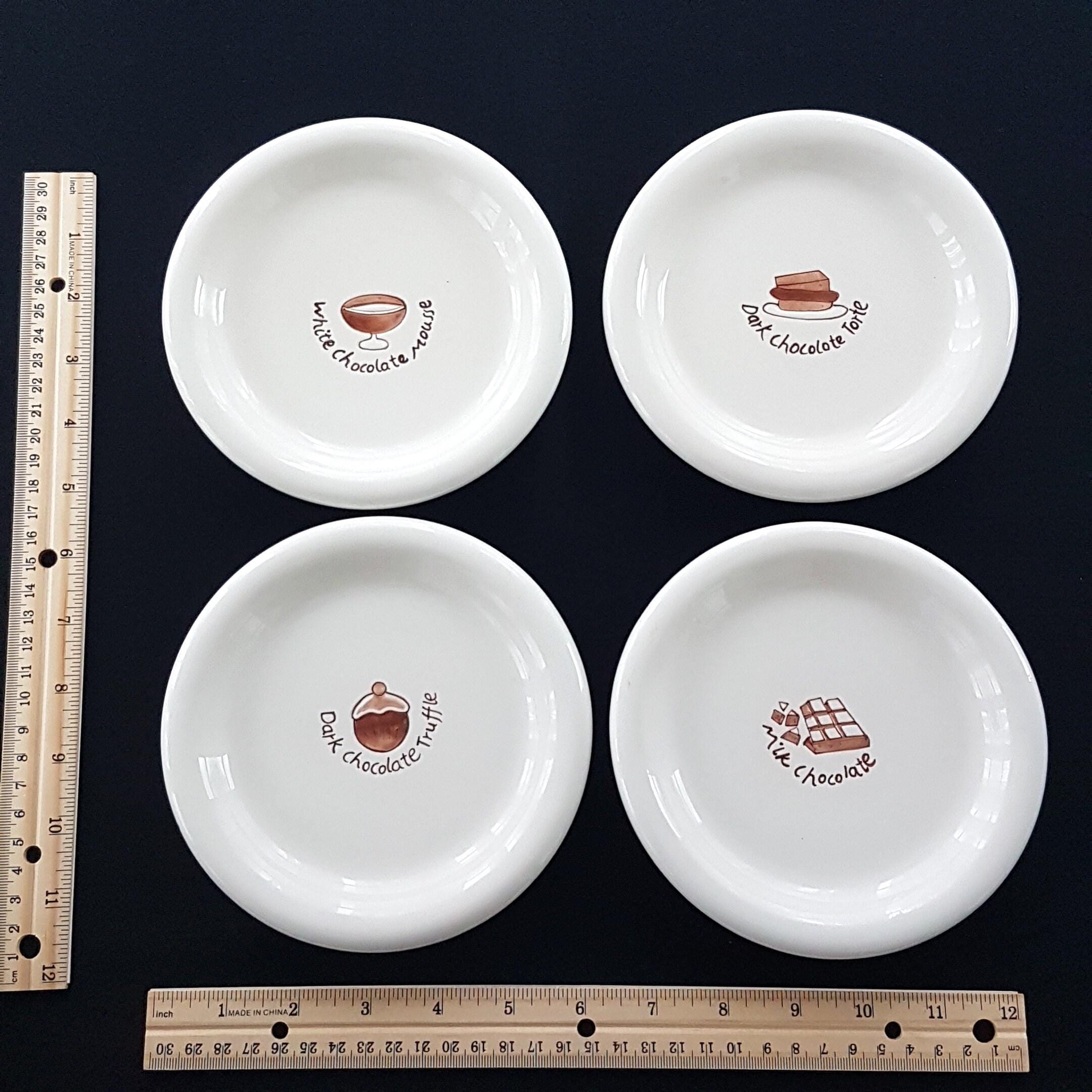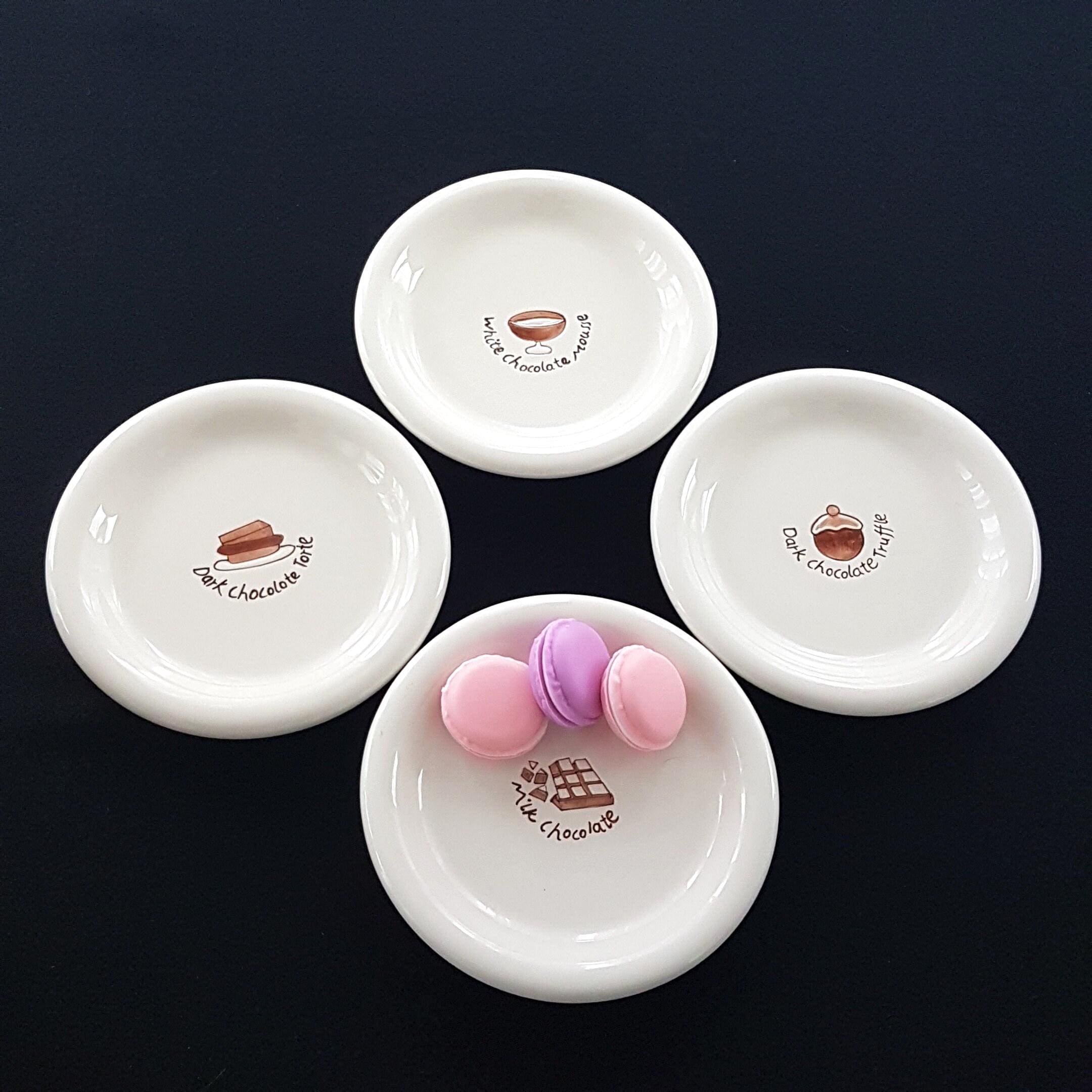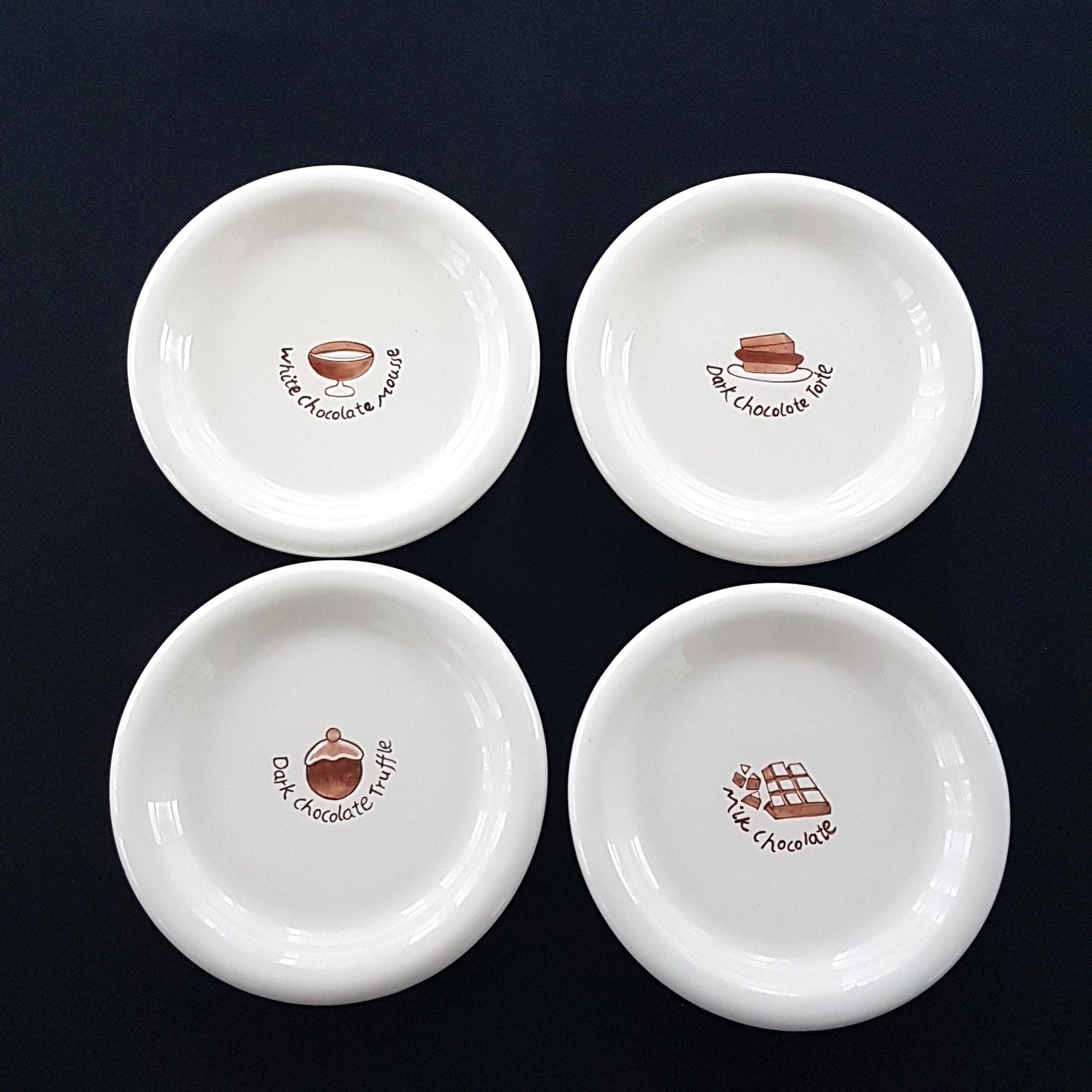 Each dessert plate has a different image: Dark Chocolate Torte, White Chocolate Mousse, Dark Chocolate Truffle and Milk Chocolate.