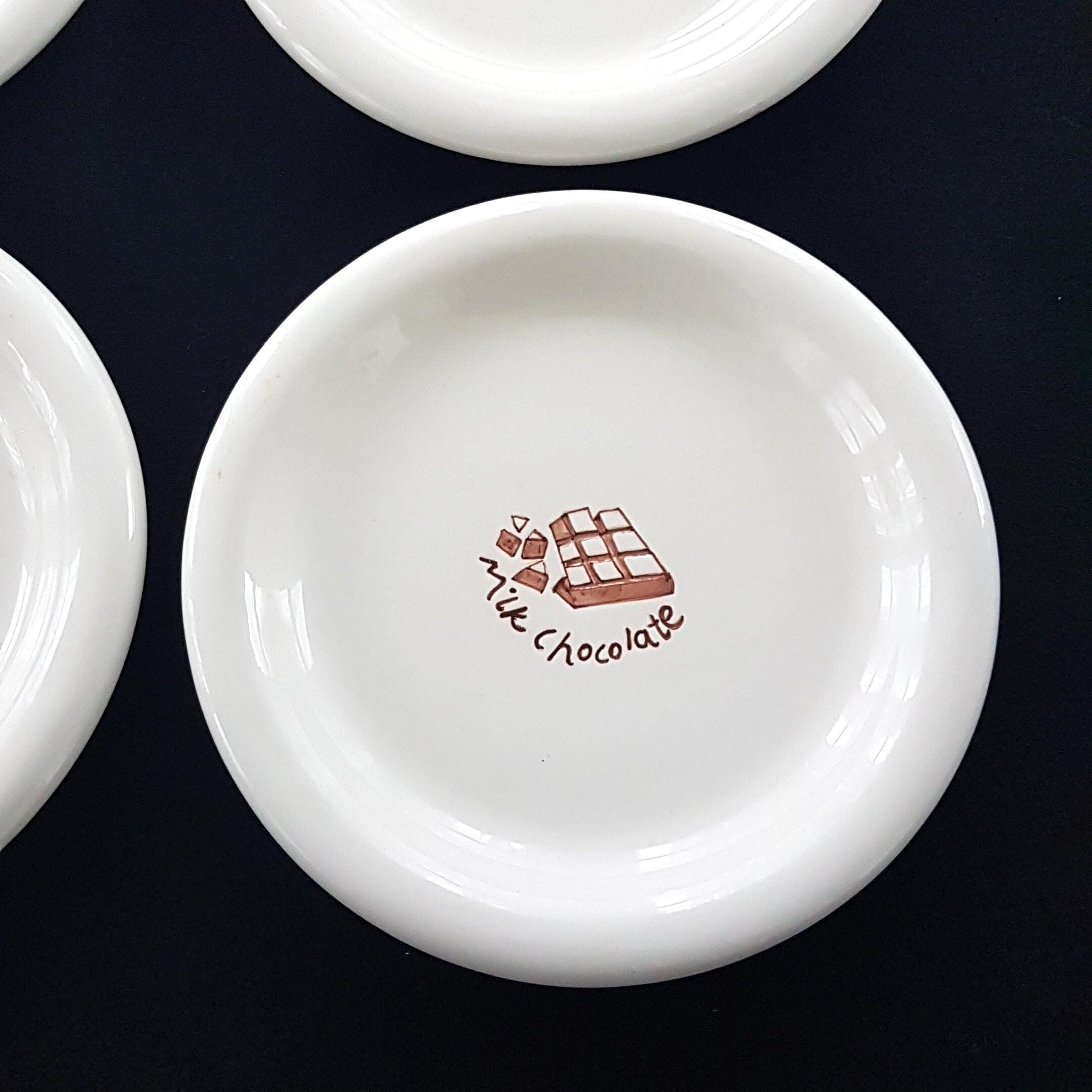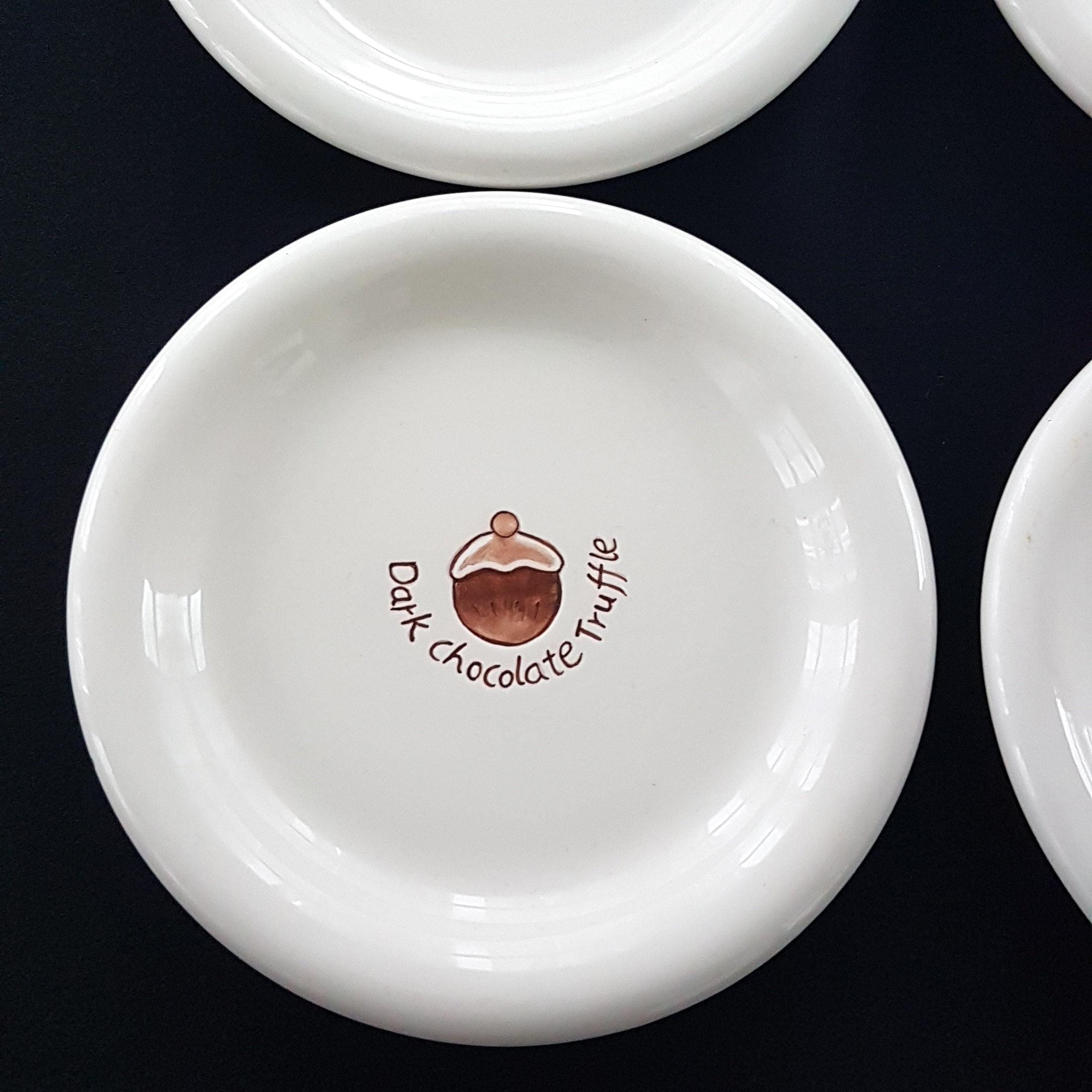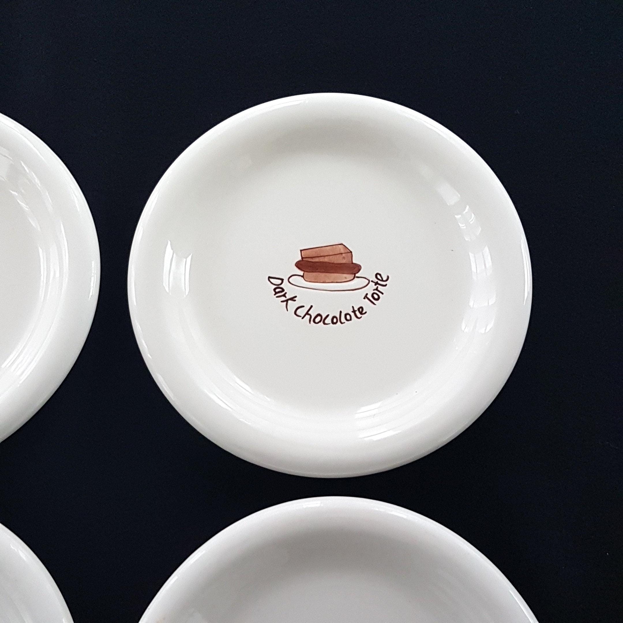 Each dessert plate has a different image: Dark Chocolate Torte, White Chocolate Mousse, Dark Chocolate Truffle and Milk Chocolate.