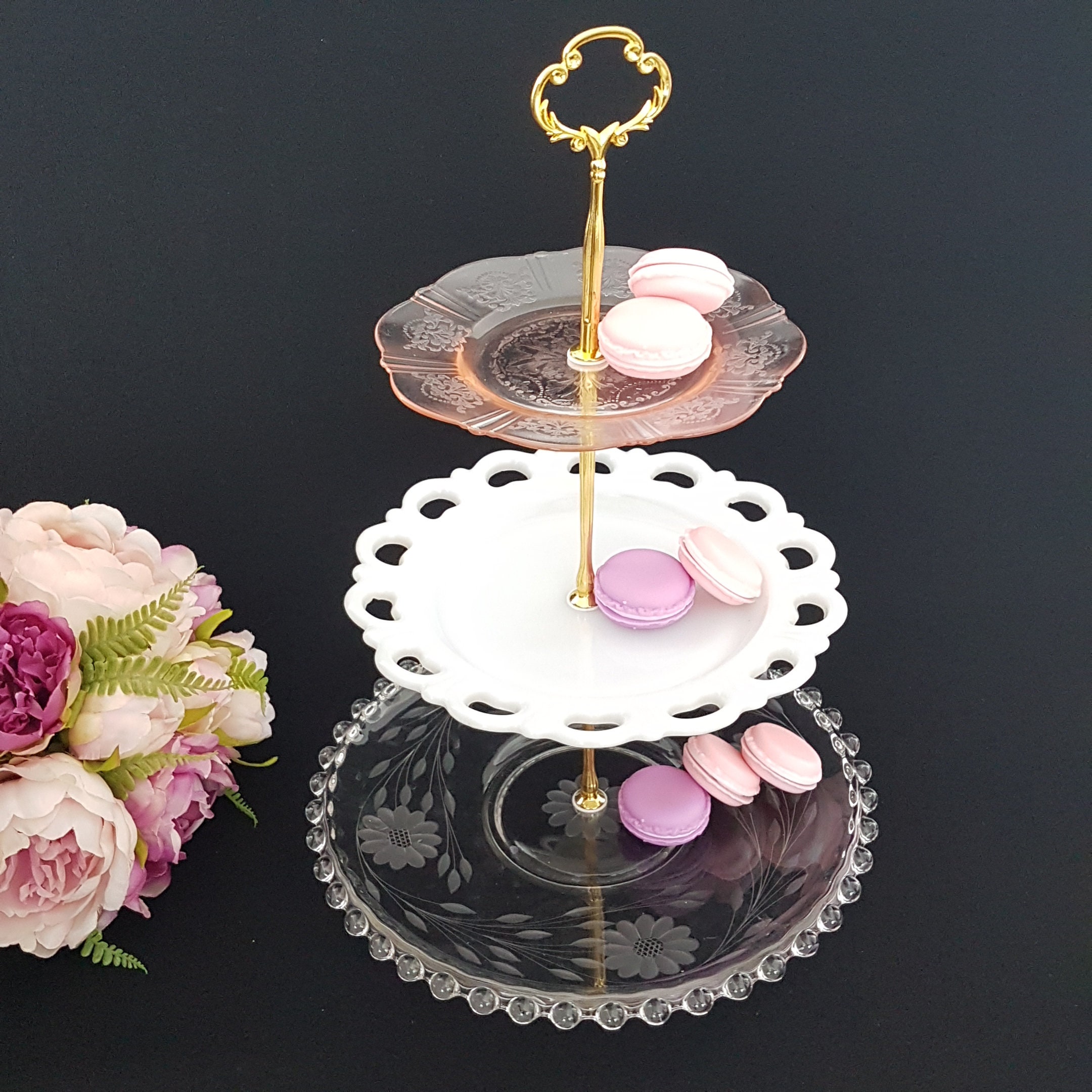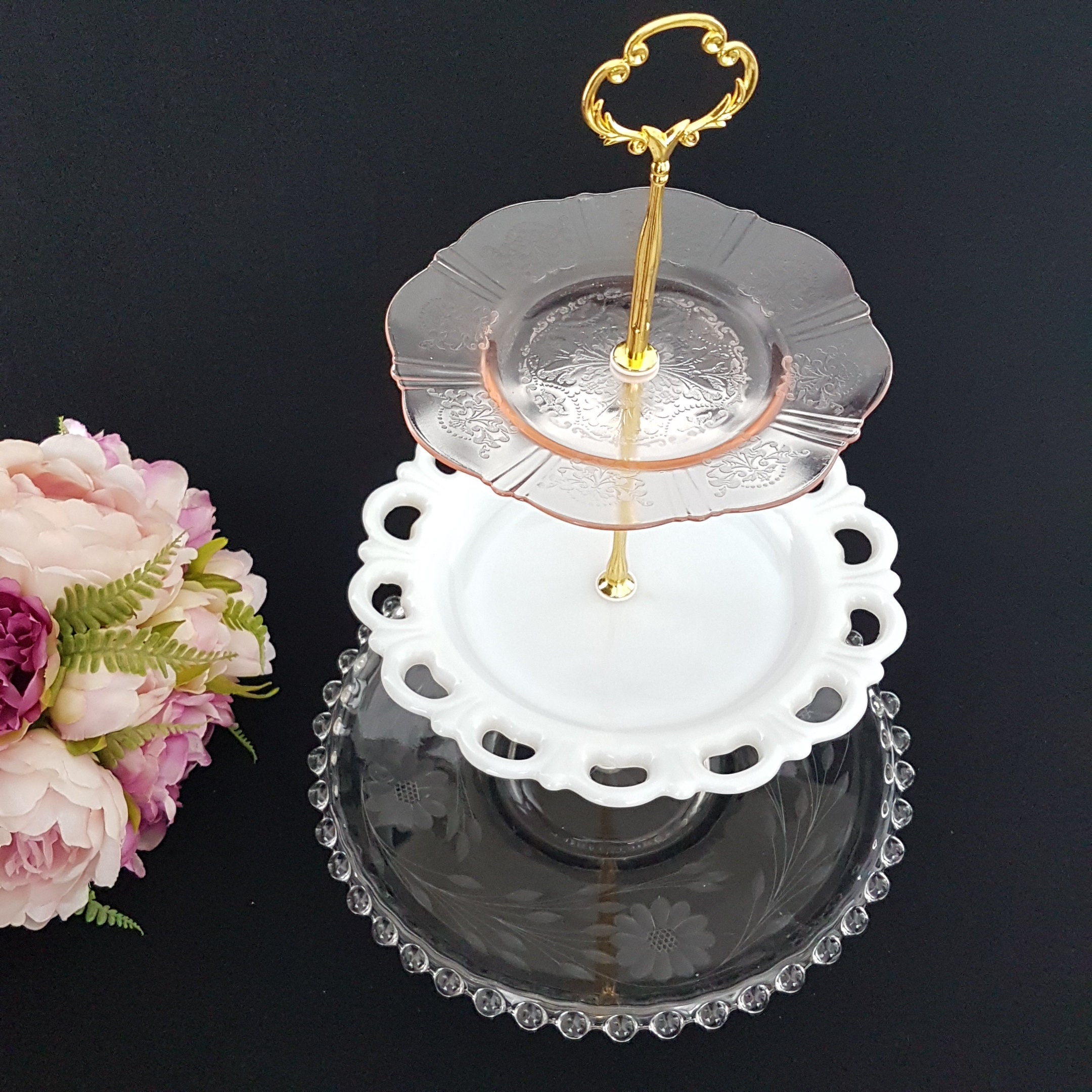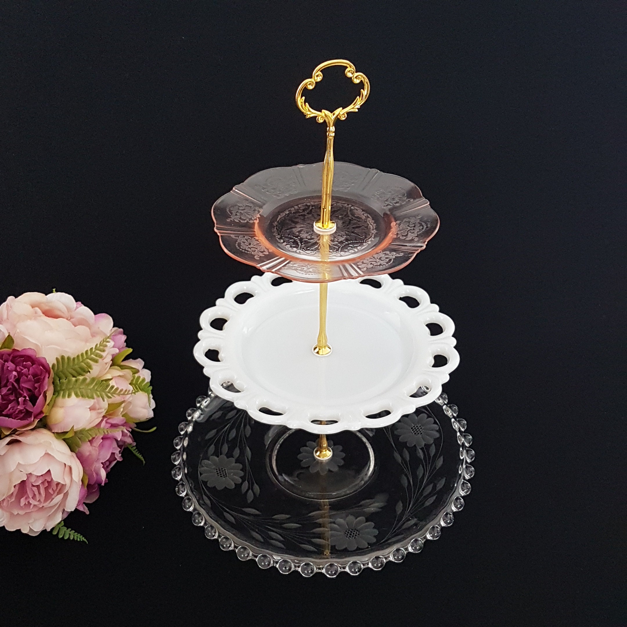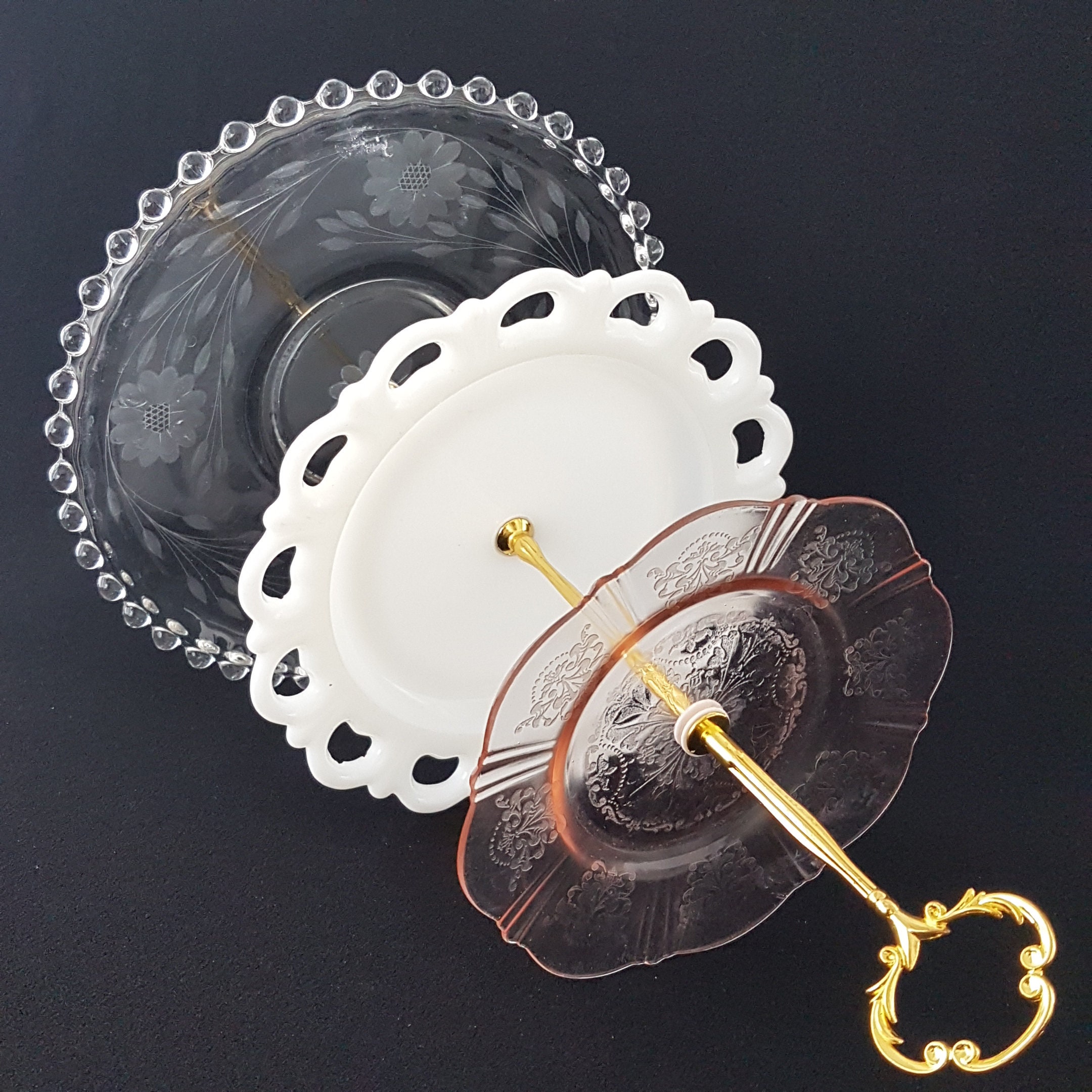 Three tier cake stand, made by me, using various vintage glass plates and new gold tone hardware. A lovely ALL vintage glass cake stand! Top tier is a pink depression glass side plate in MADRID pattern by Federal Glass. Middle tier is a white milk glass salad plate in Anchor Hocking's OLD COLONY Open Lace Edge. Bottom tier is an etched clear cake plate in Hughes CORNFLOWER with candlewick edge.