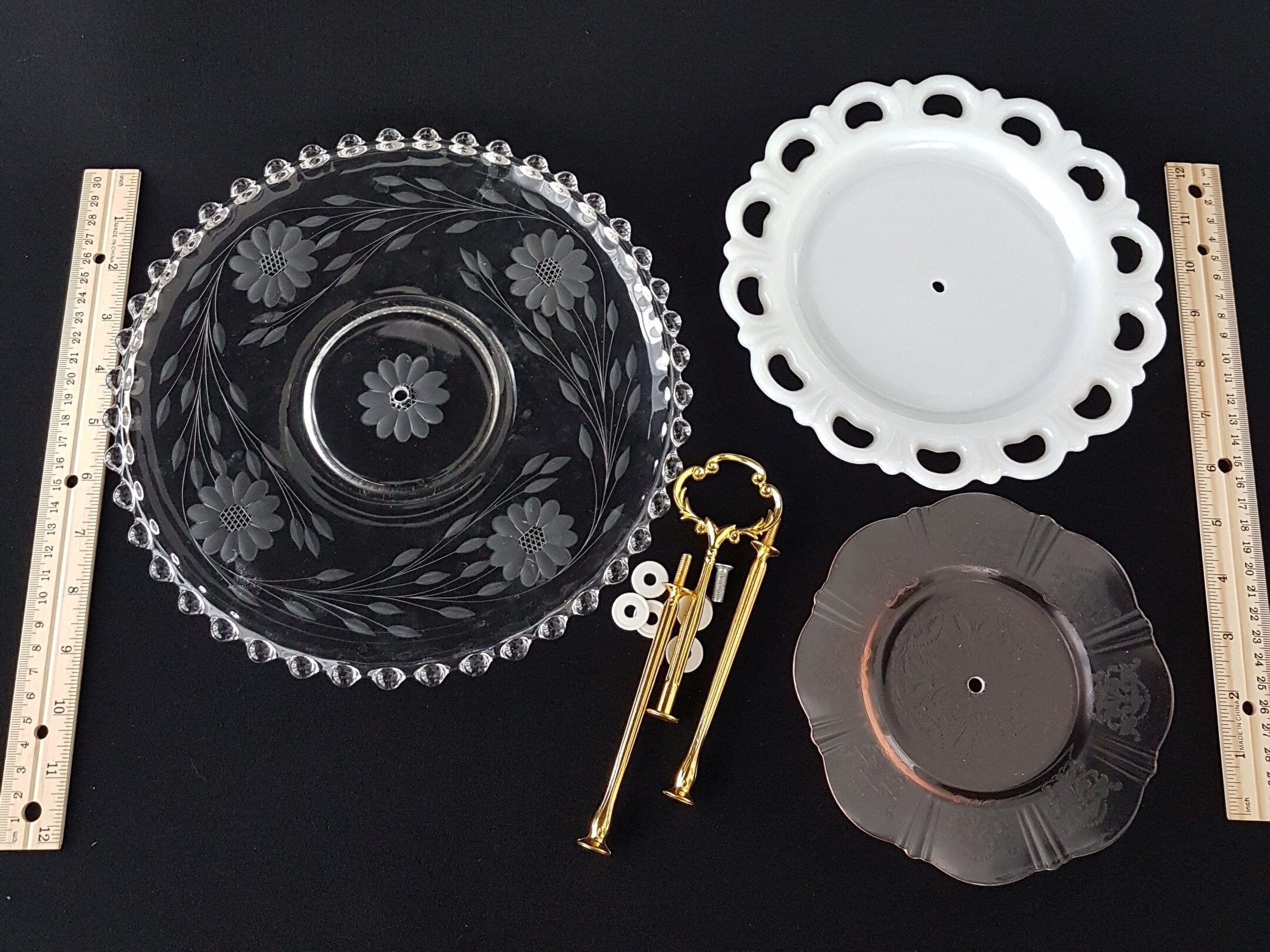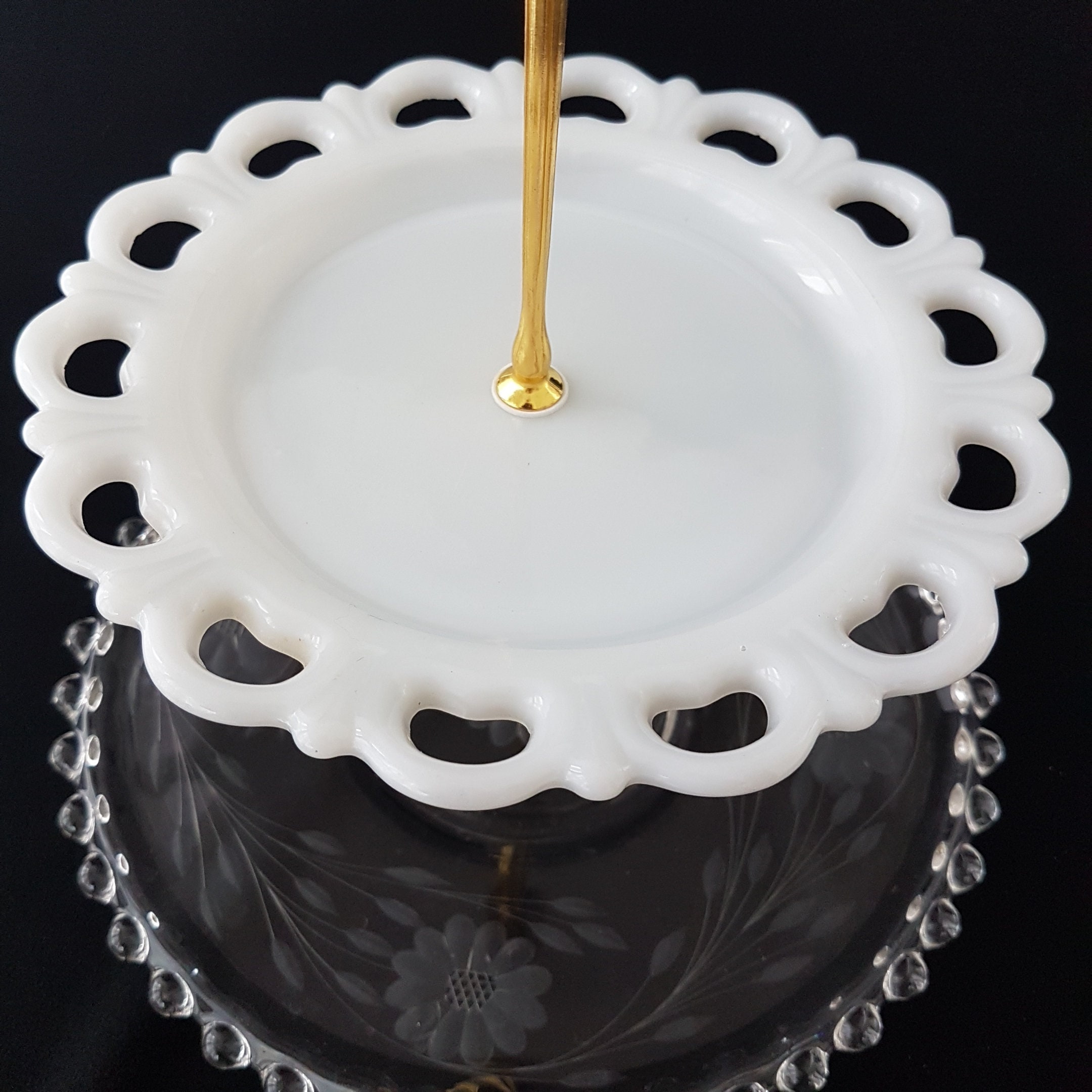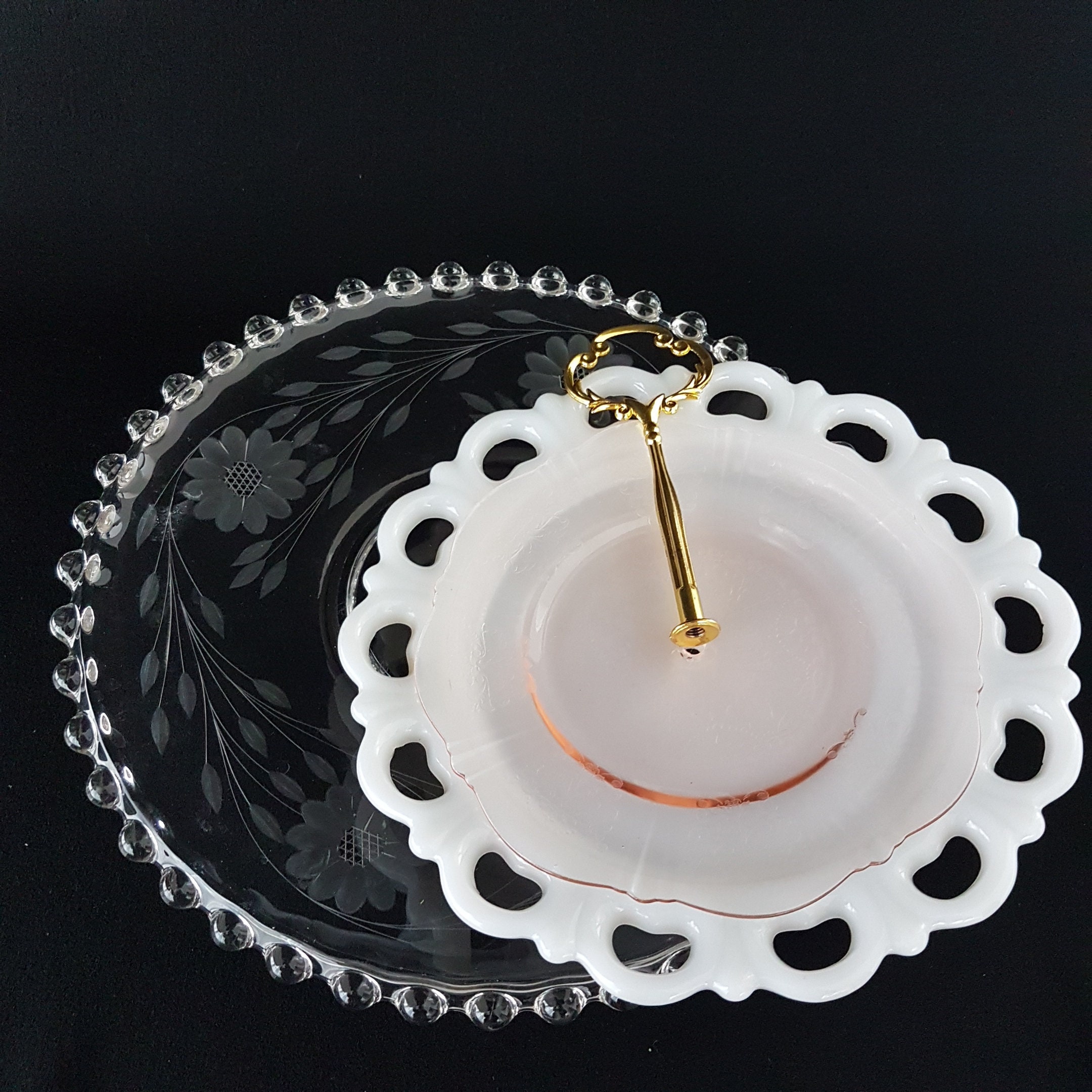Three tier cake stand, made by me, using various vintage glass plates and new gold tone hardware. A lovely ALL vintage glass cake stand! Top tier is a pink depression glass side plate in MADRID pattern by Federal Glass. Middle tier is a white milk glass salad plate in Anchor Hocking's OLD COLONY Open Lace Edge. Bottom tier is an etched clear cake plate in Hughes CORNFLOWER with candlewick edge.