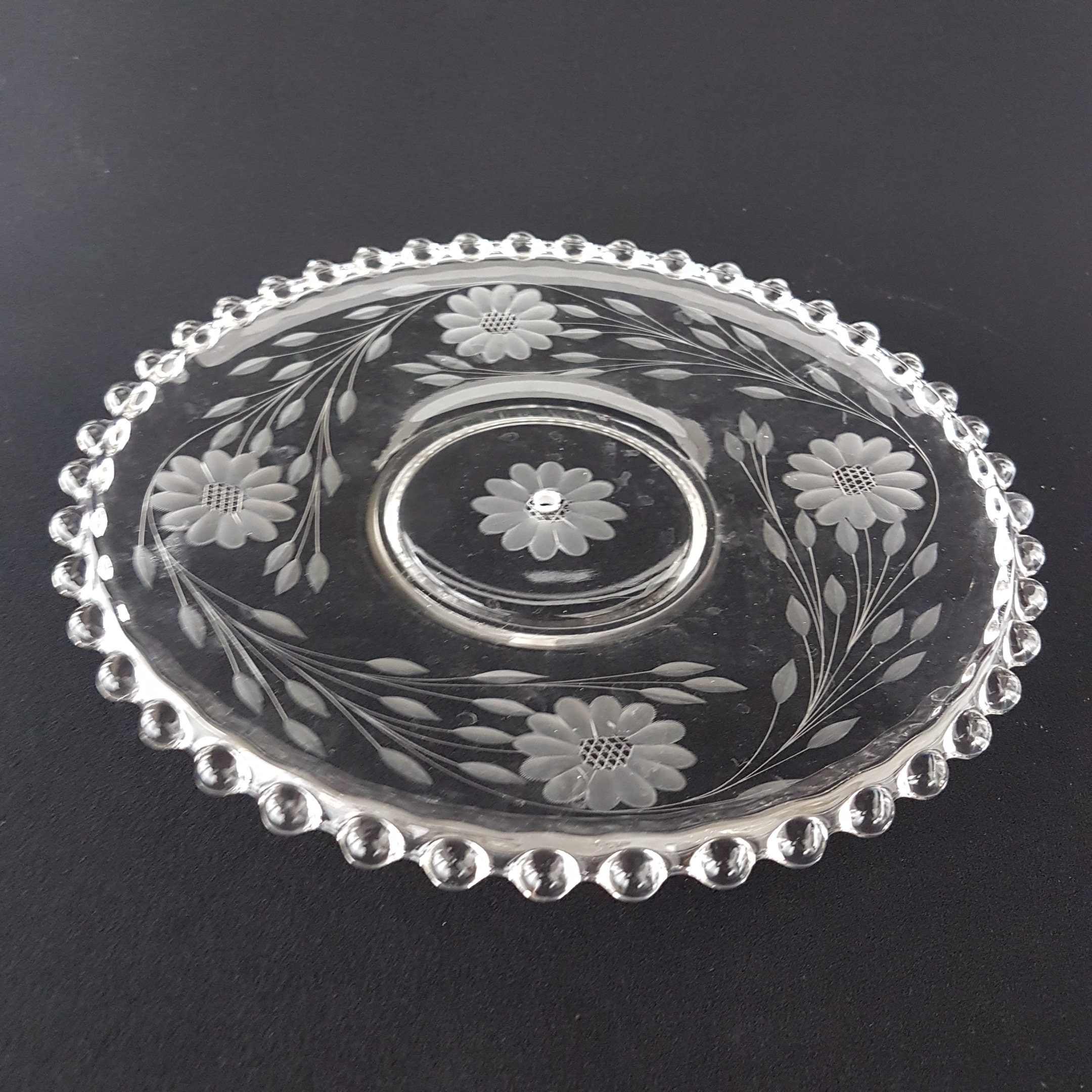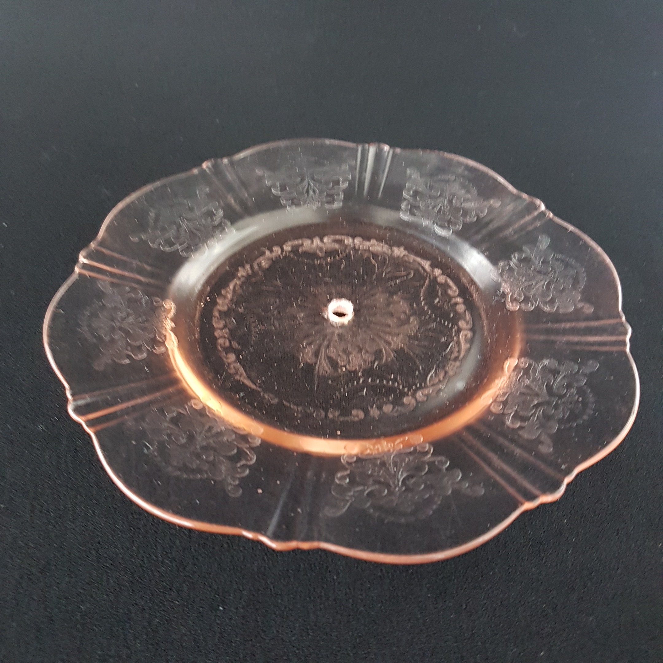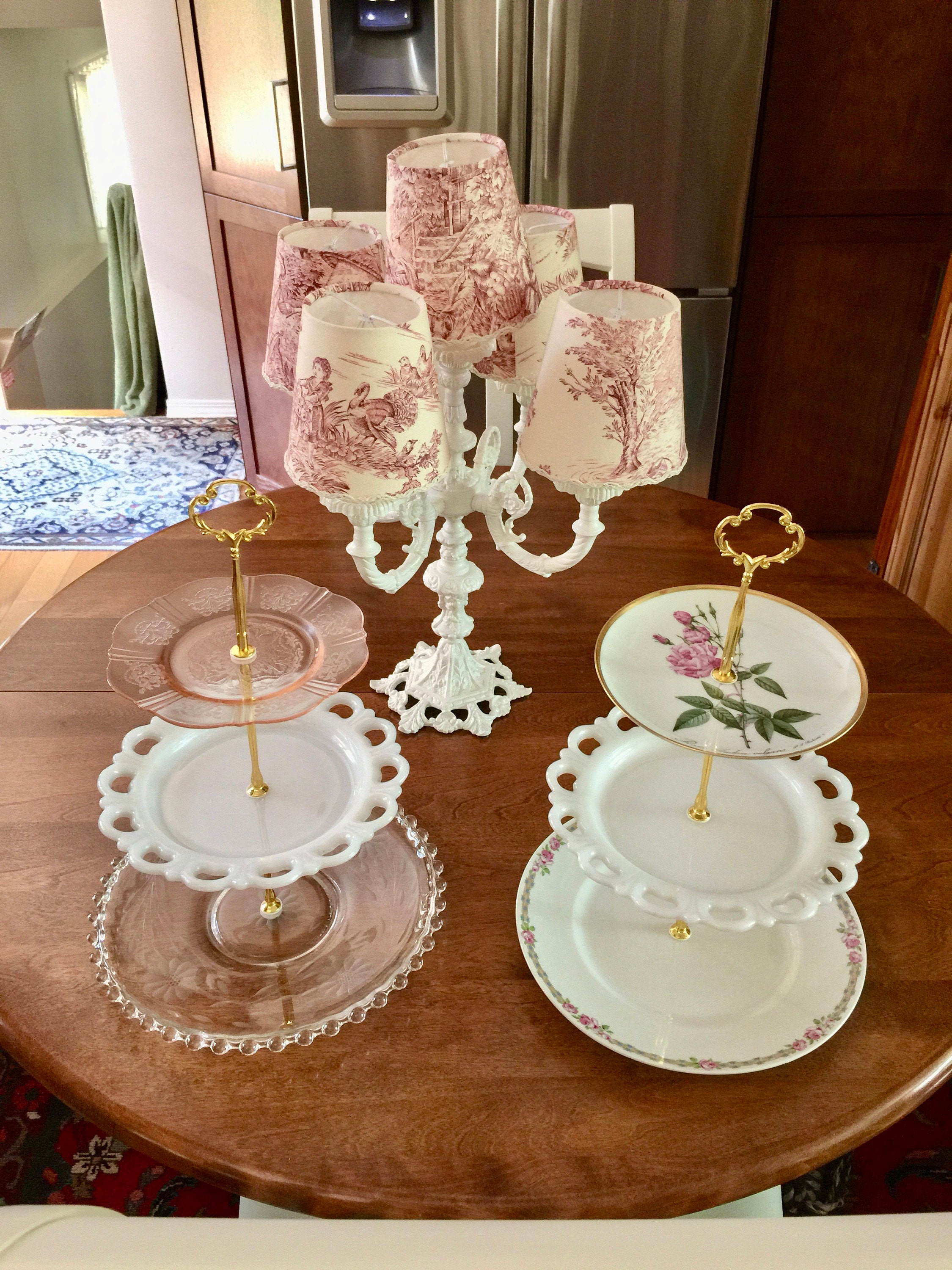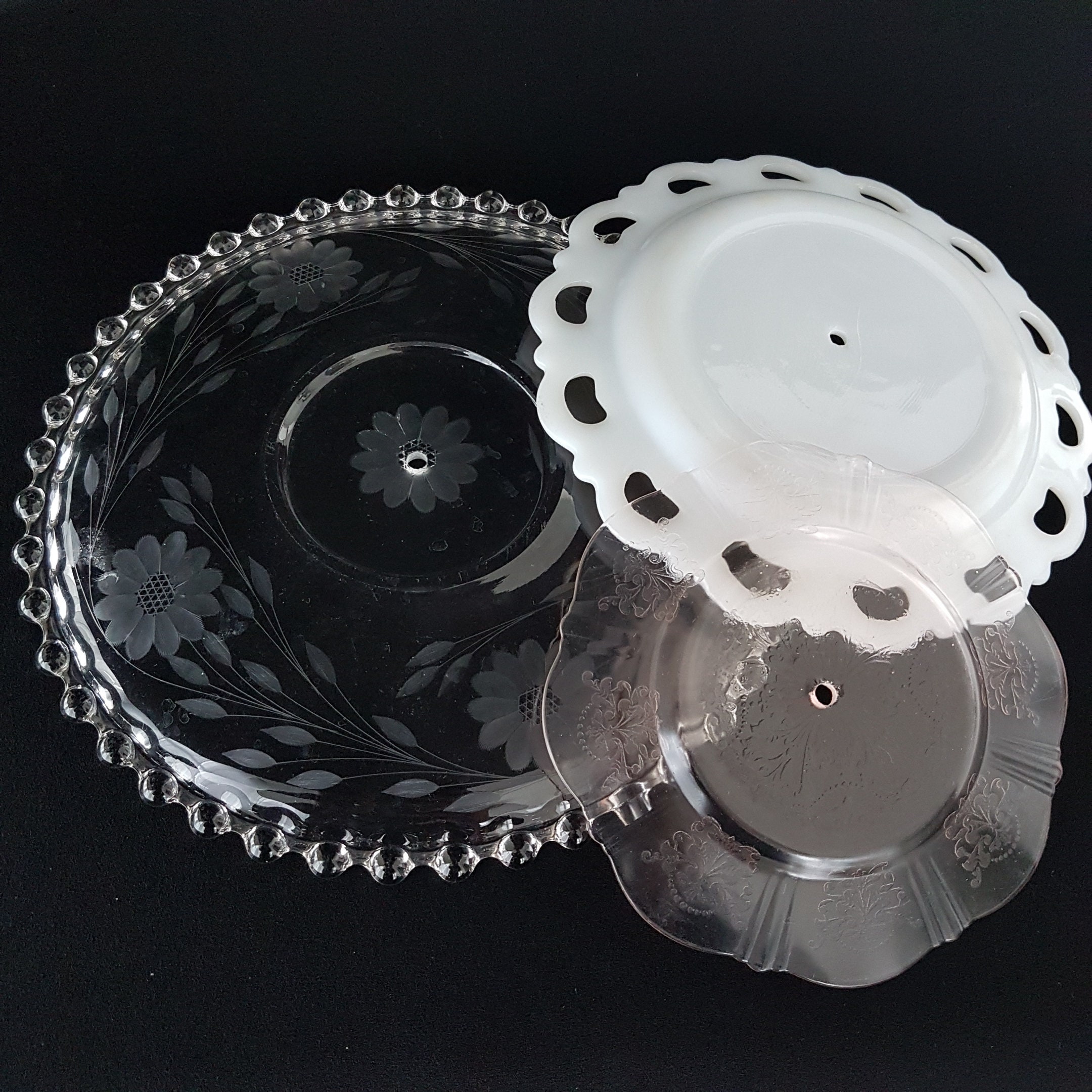 Three tier cake stand, made by me, using various vintage glass plates and new gold tone hardware. A lovely ALL vintage glass cake stand! Top tier is a pink depression glass side plate in MADRID pattern by Federal Glass. Middle tier is a white milk glass salad plate in Anchor Hocking's OLD COLONY Open Lace Edge. Bottom tier is an etched clear cake plate in Hughes CORNFLOWER with candlewick edge.