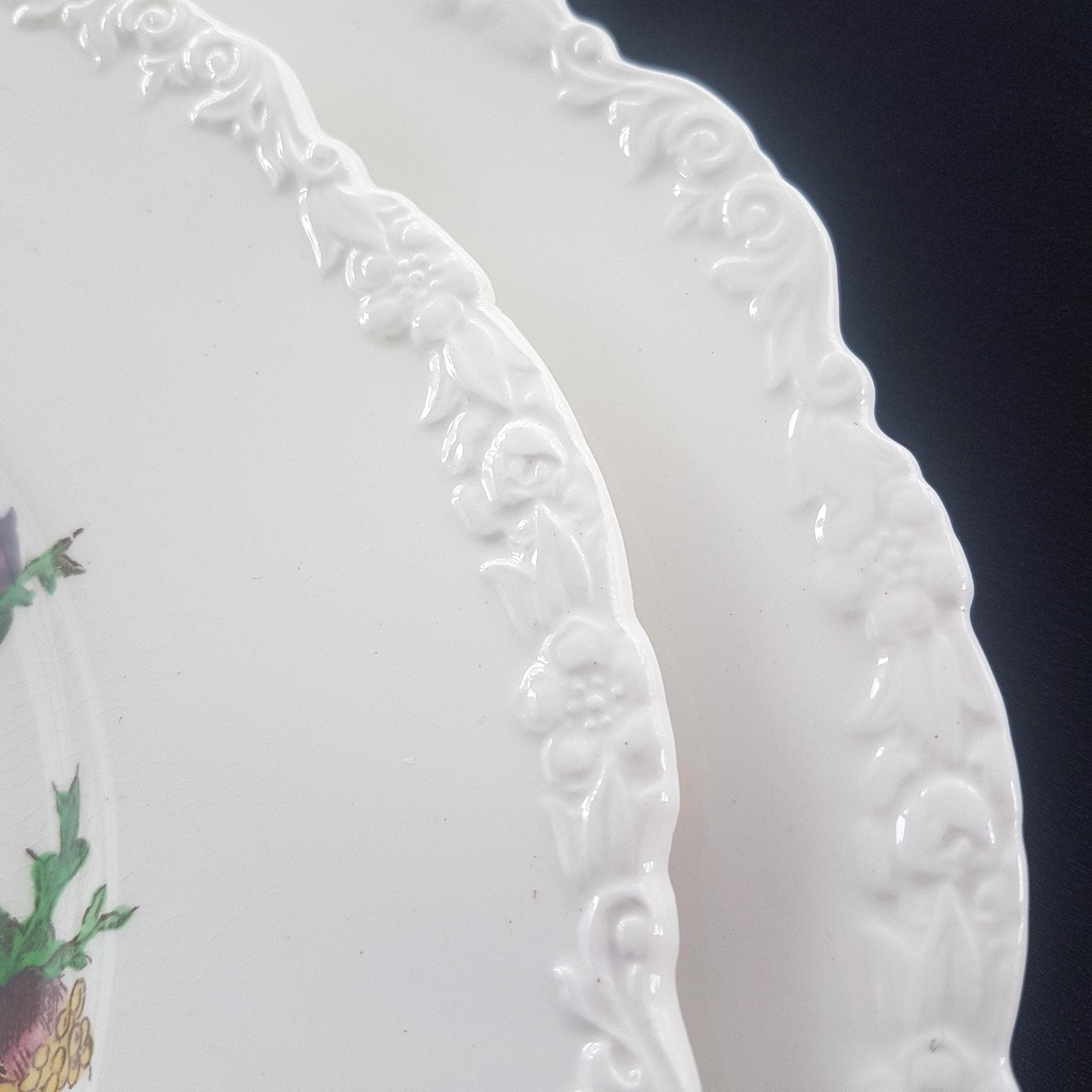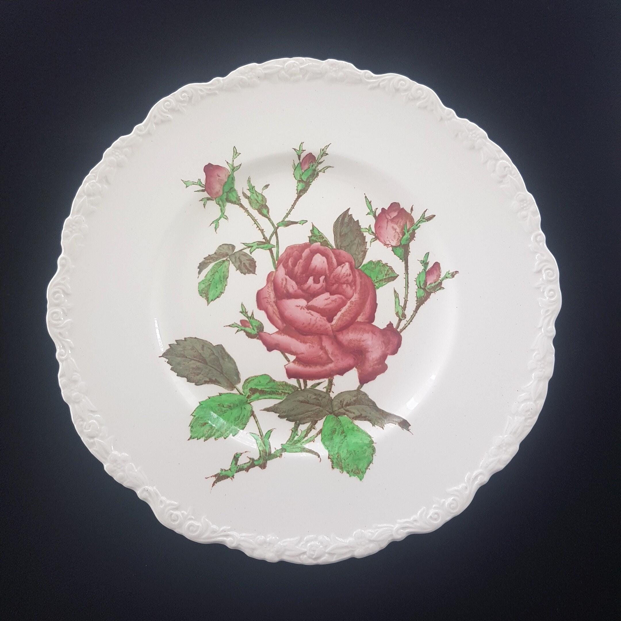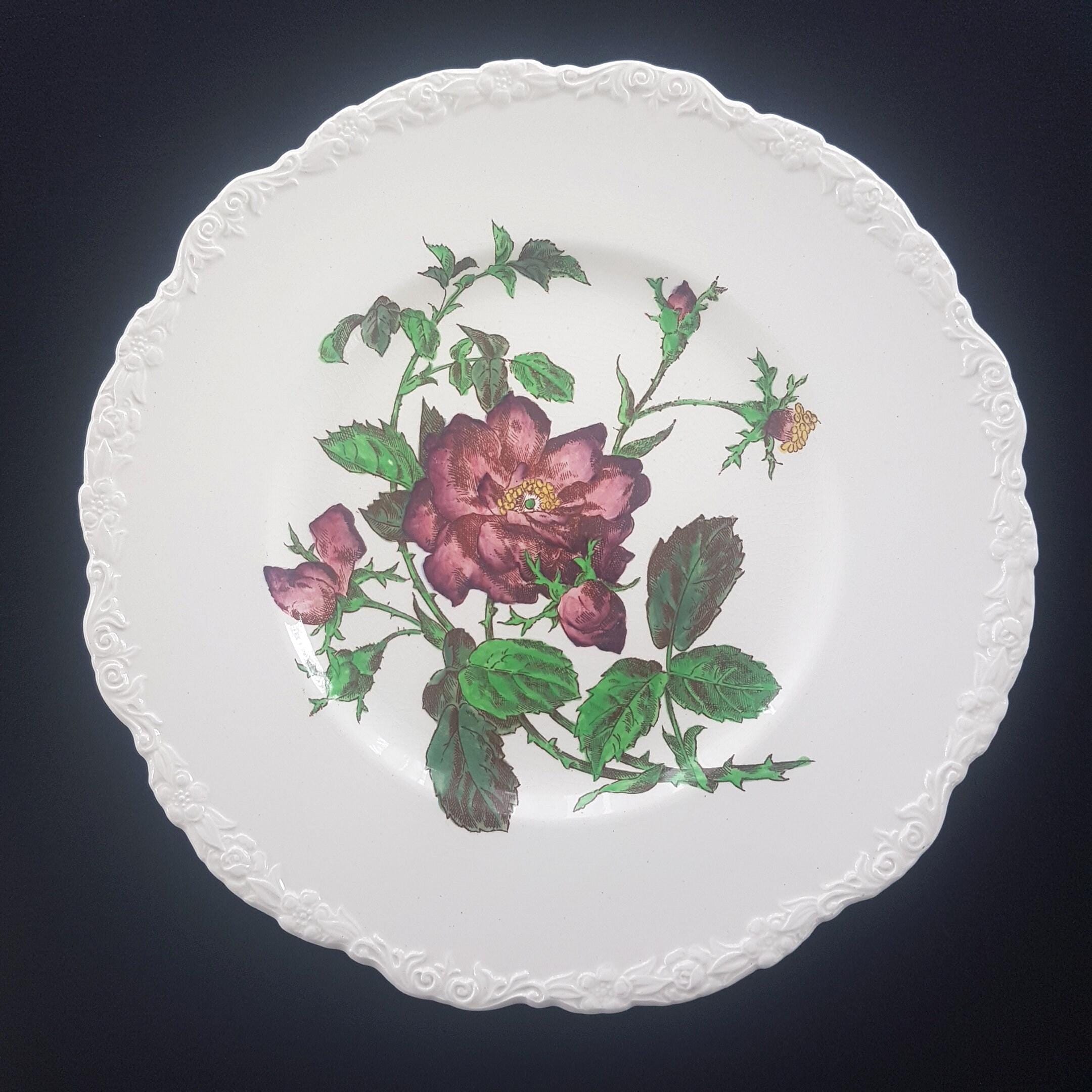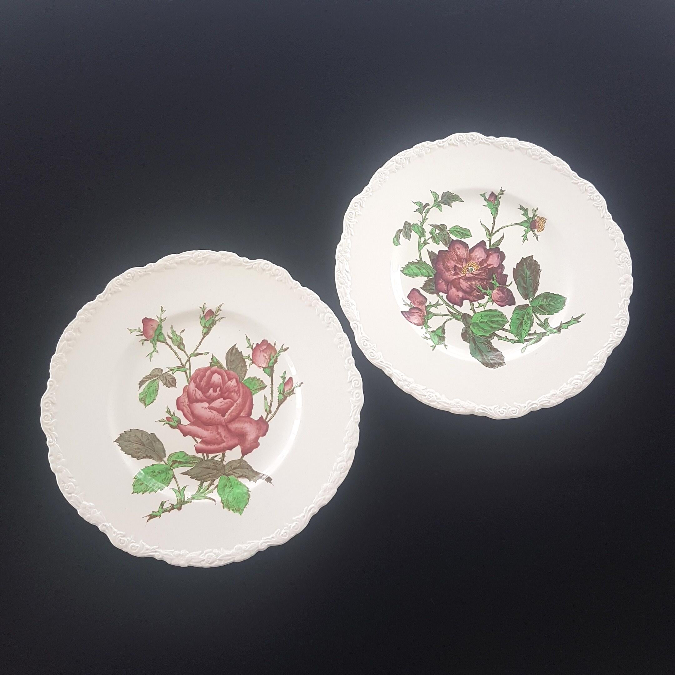 Mismatched vintage Cauldon England floral dinner plates. Set of 2 plates, each plate with a different rose. Embossed rim of flowers, leaves and scrolls. Made in England, circa 1930's