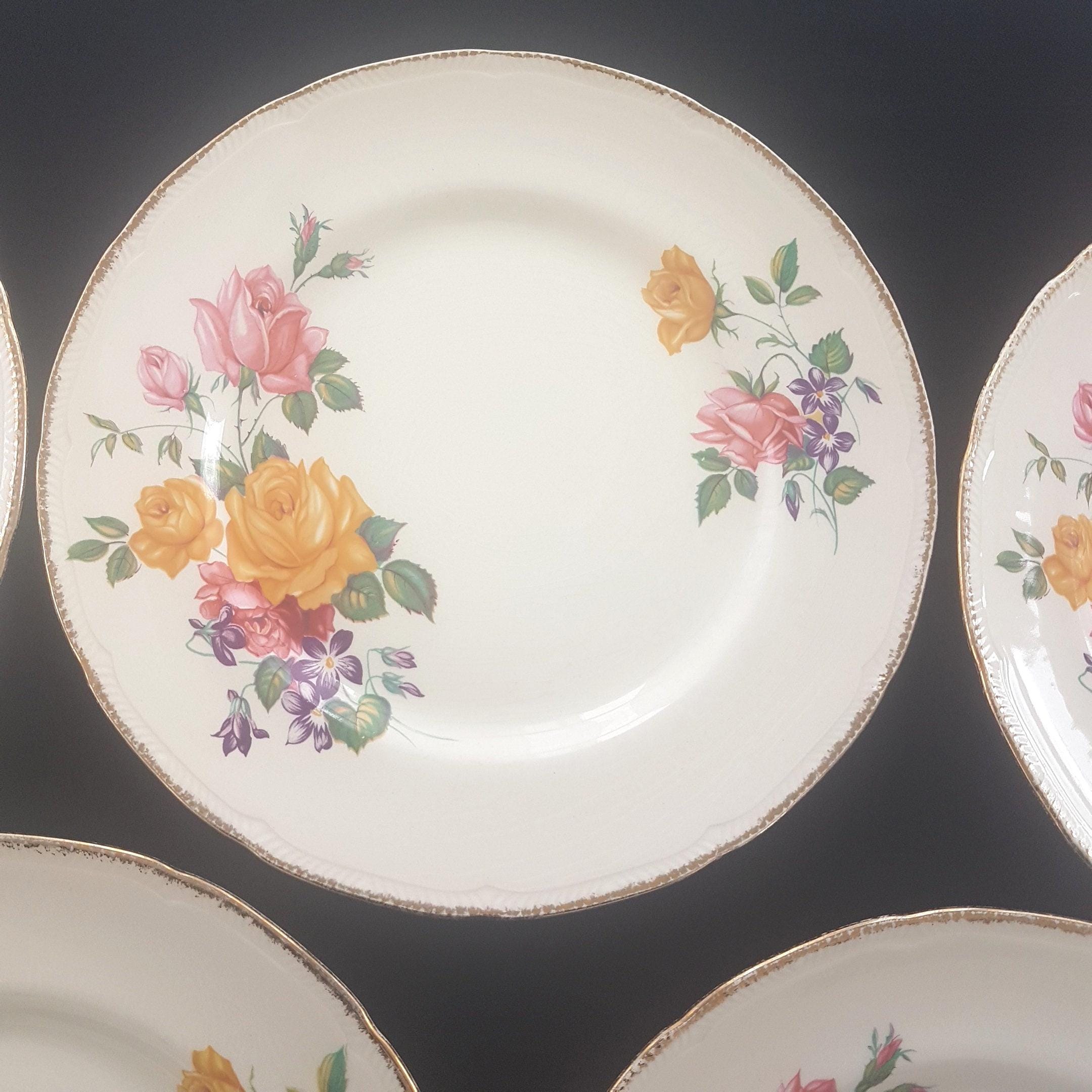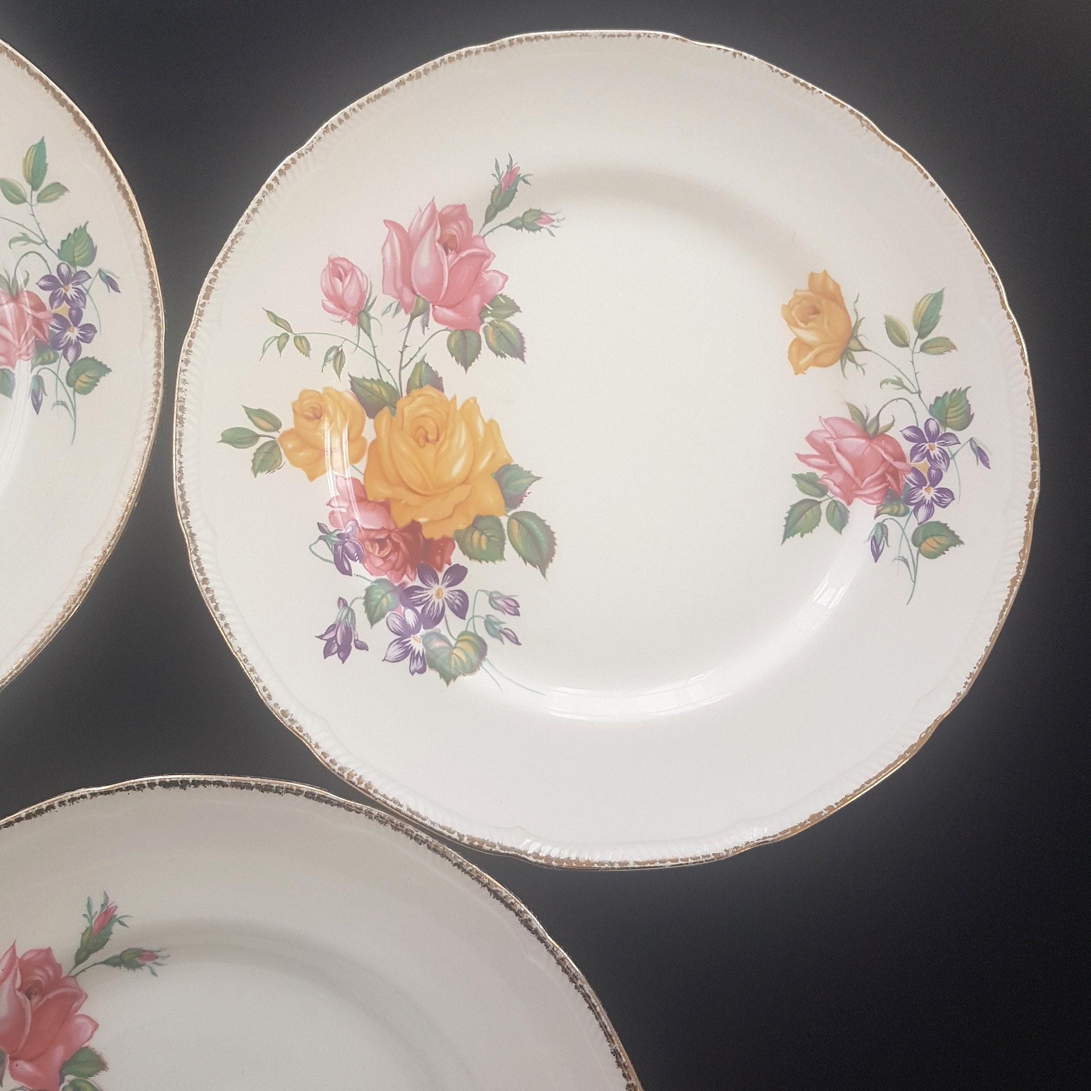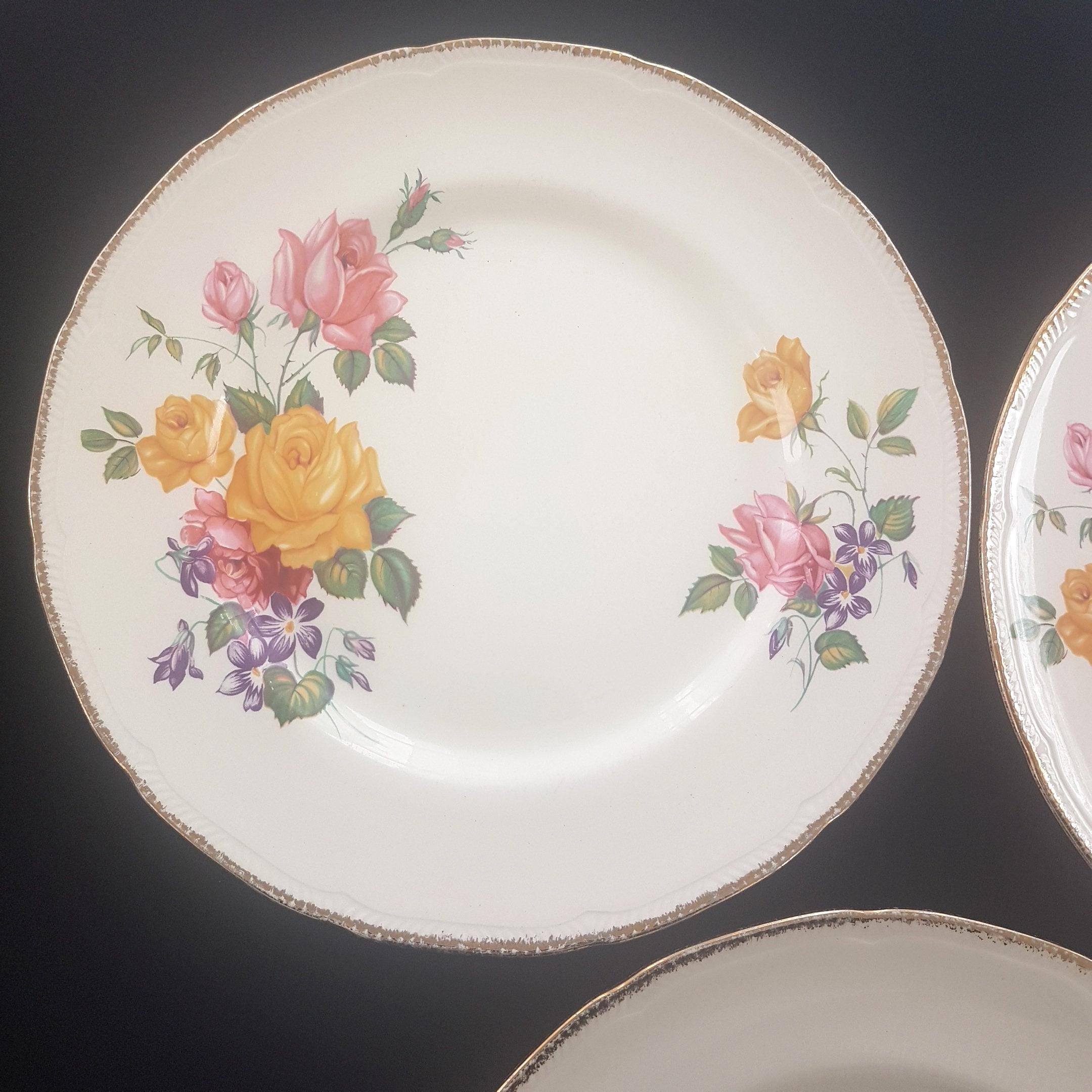 Ironstone dinner plates decorated in Chateau Rose by Ridgway Potteries England. A lovely floral pattern of yellow and pink rose with little purple flowers. 22kt gold decoration on rim. Made in England, circa 1950s