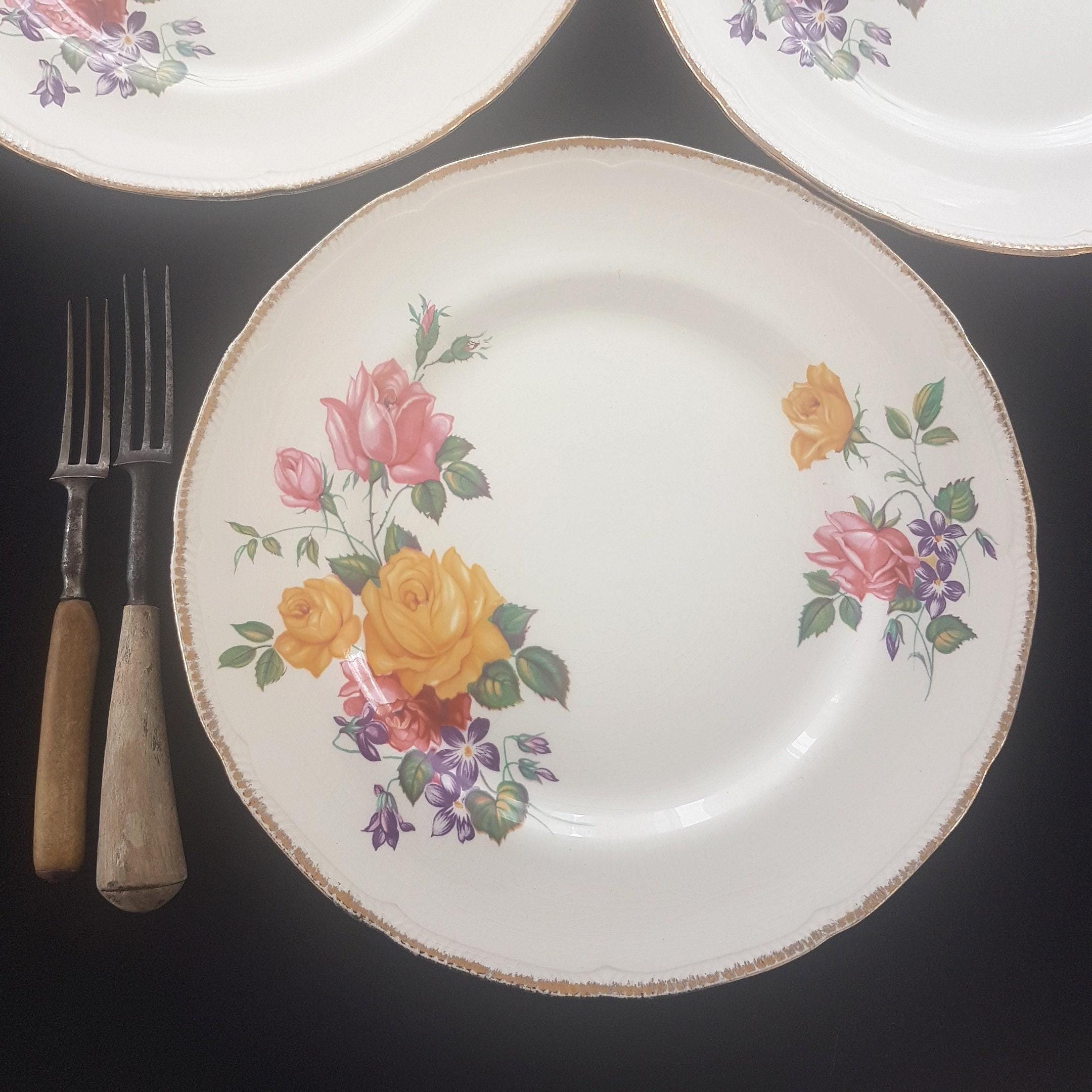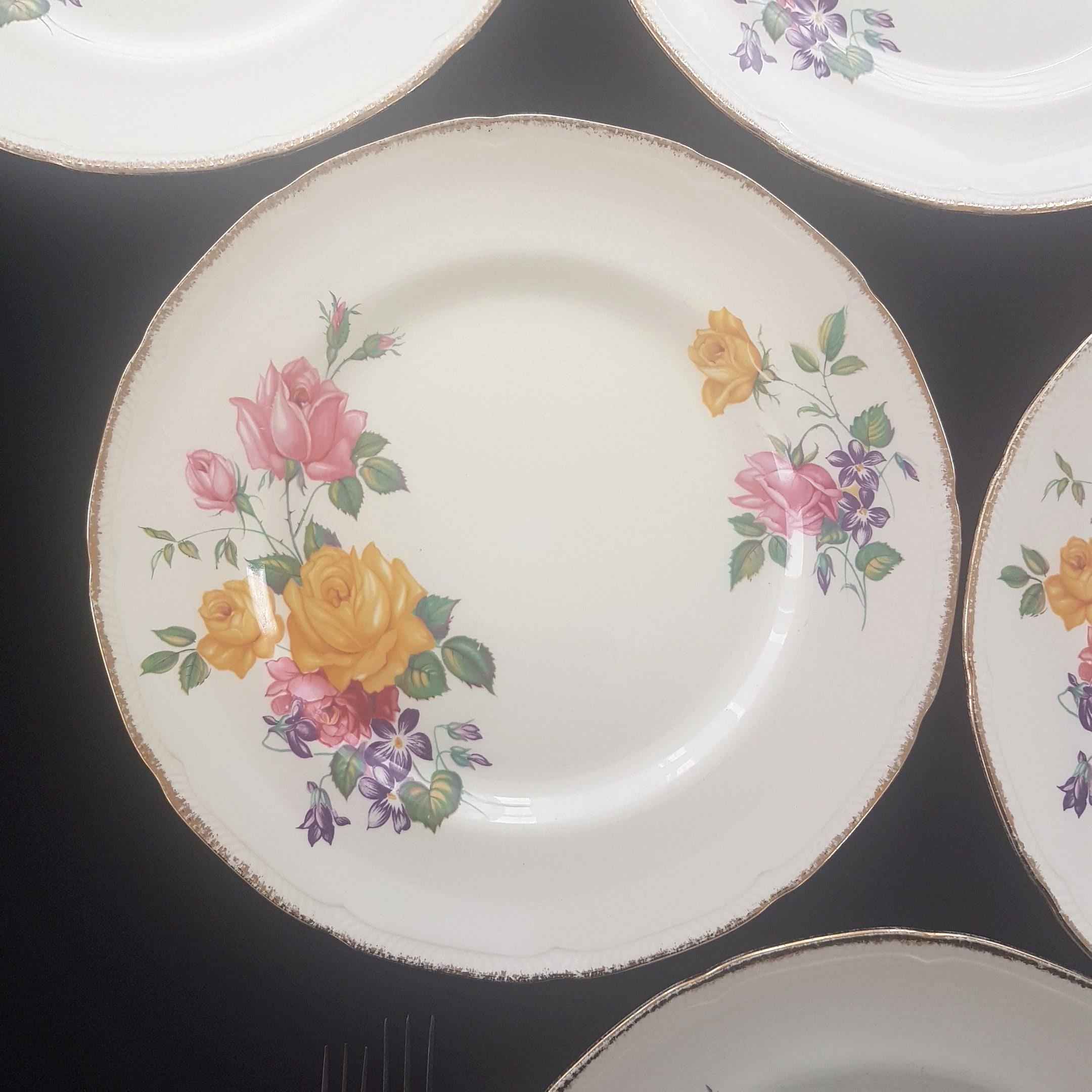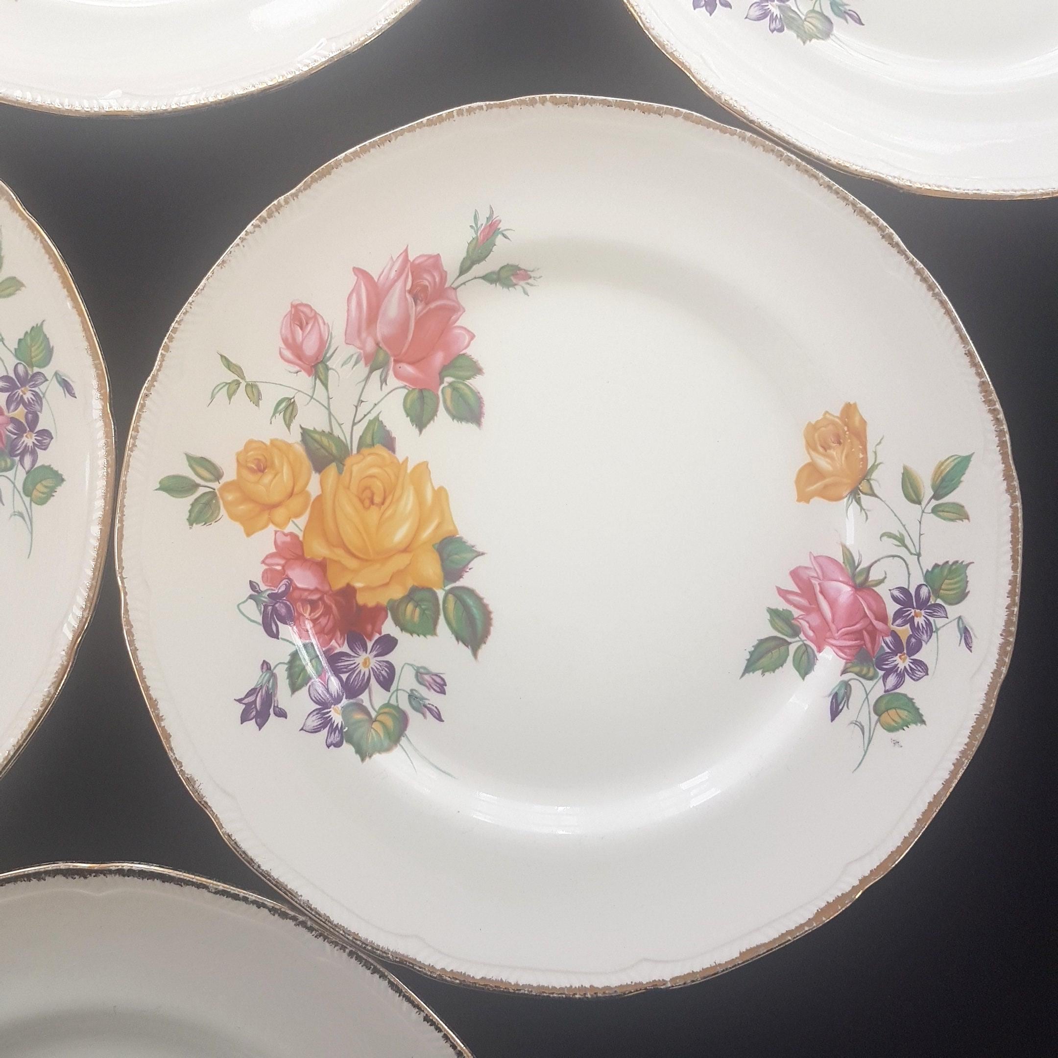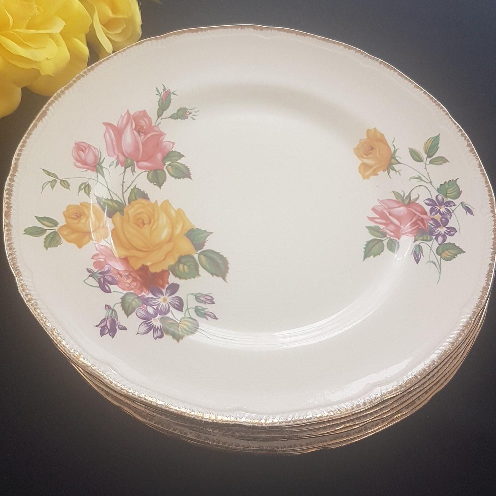 Ironstone dinner plates decorated in Chateau Rose by Ridgway Potteries England. A lovely floral pattern of yellow and pink rose with little purple flowers. 22kt gold decoration on rim. Made in England, circa 1950s
