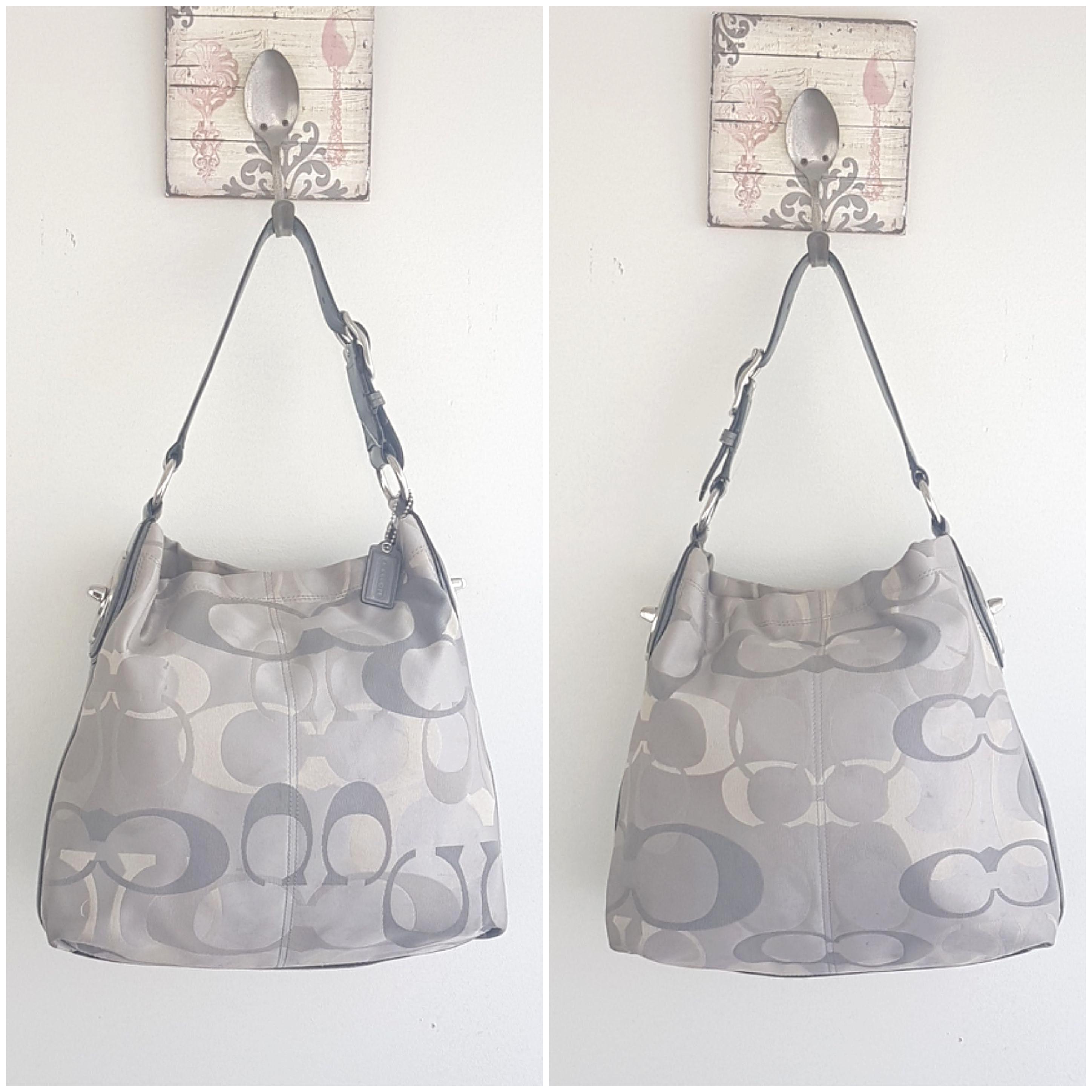 Vintage COACH Penelope Optic silver / grey shoulder bag with C monogram. Single grey leather handle with 5 adjustment holes. One zippered and two slip pockets inside. Magnetic snap top closure. Leather embossed COACH hangtag.