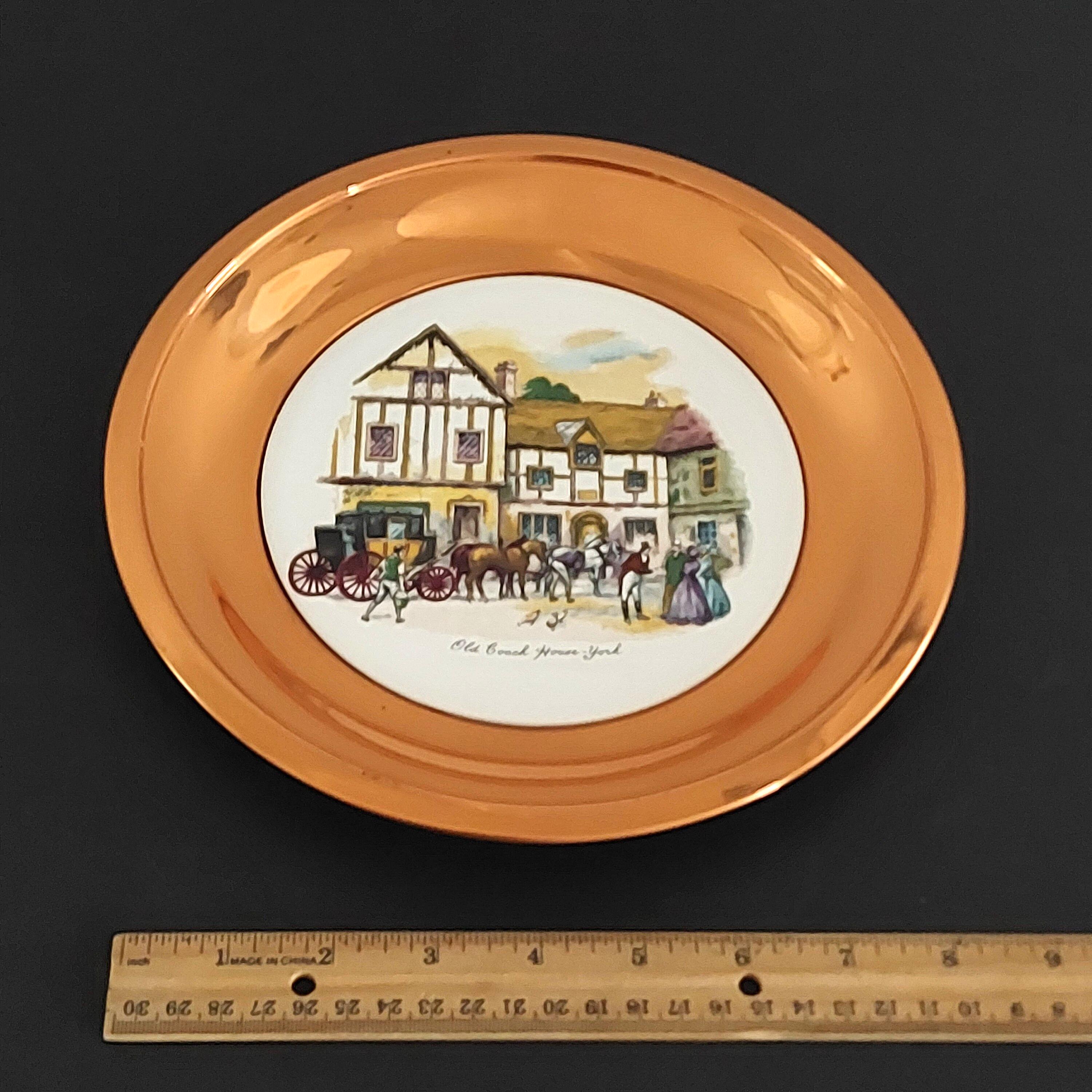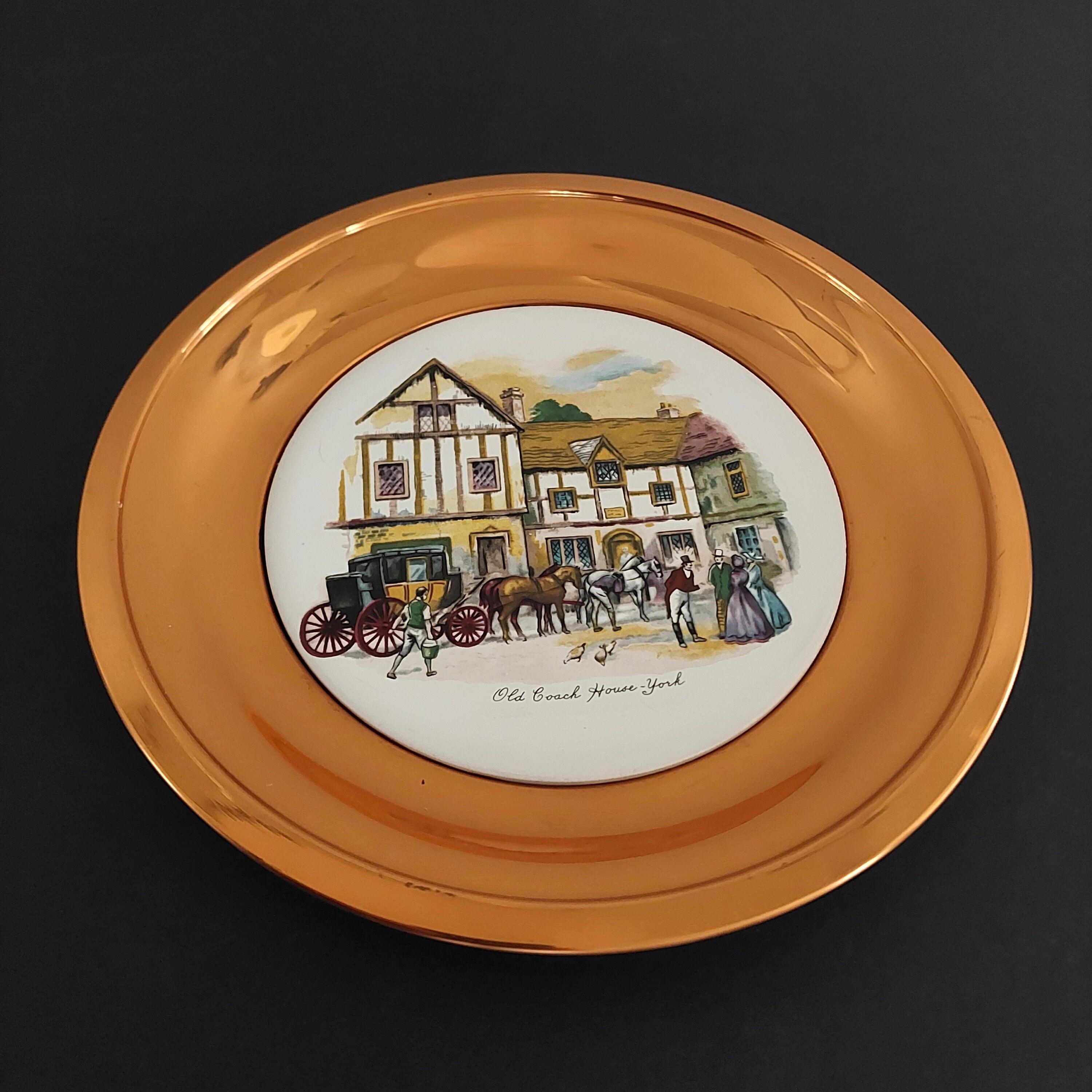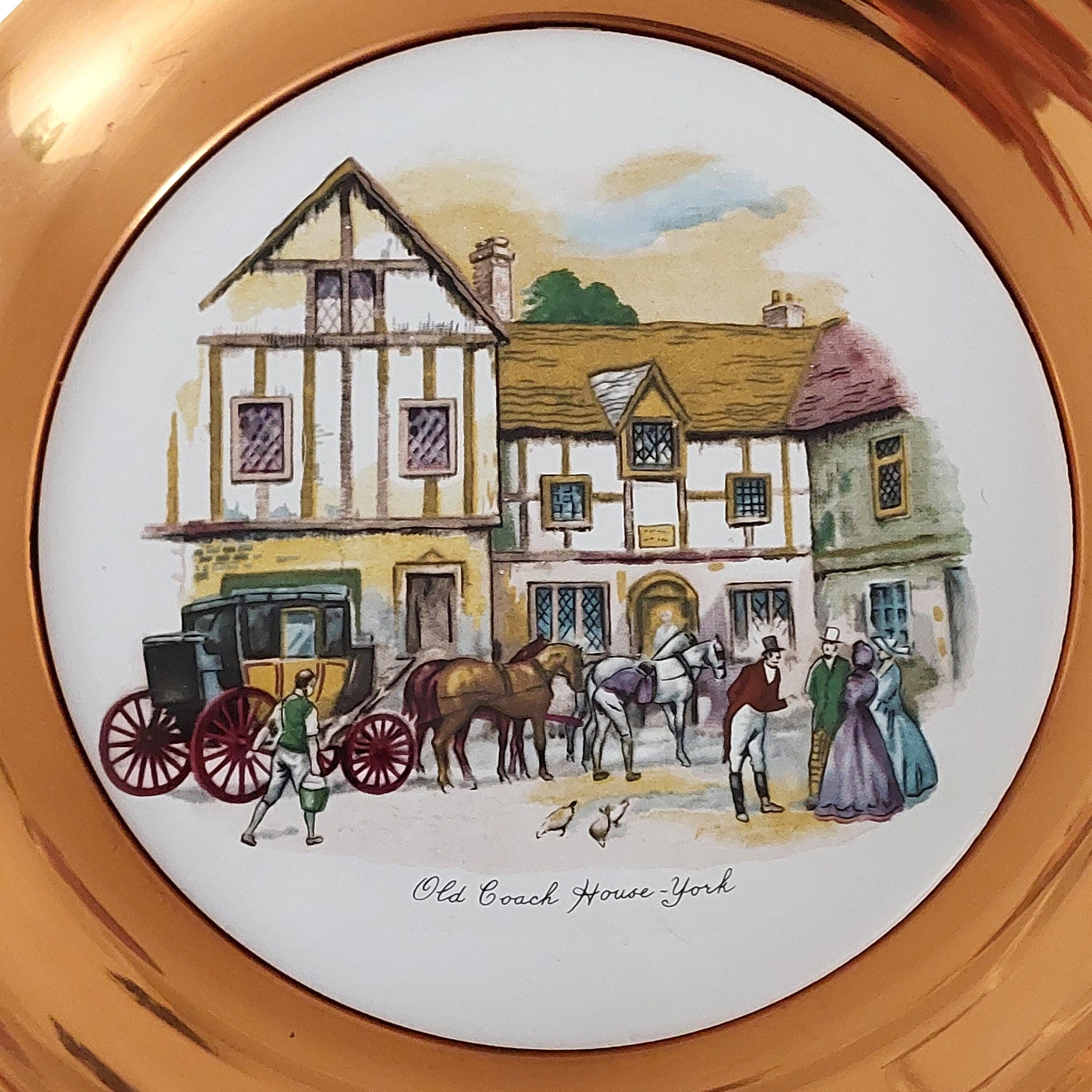 Vintage English round ceramic tile within a copper round frame. Old Coach House York scene of finely dressed ladies and a gentleman, the coachman and stable boy near a horse and carriage with an English cottage coach-house in the background. Back of tile is backed with a felt-like material.