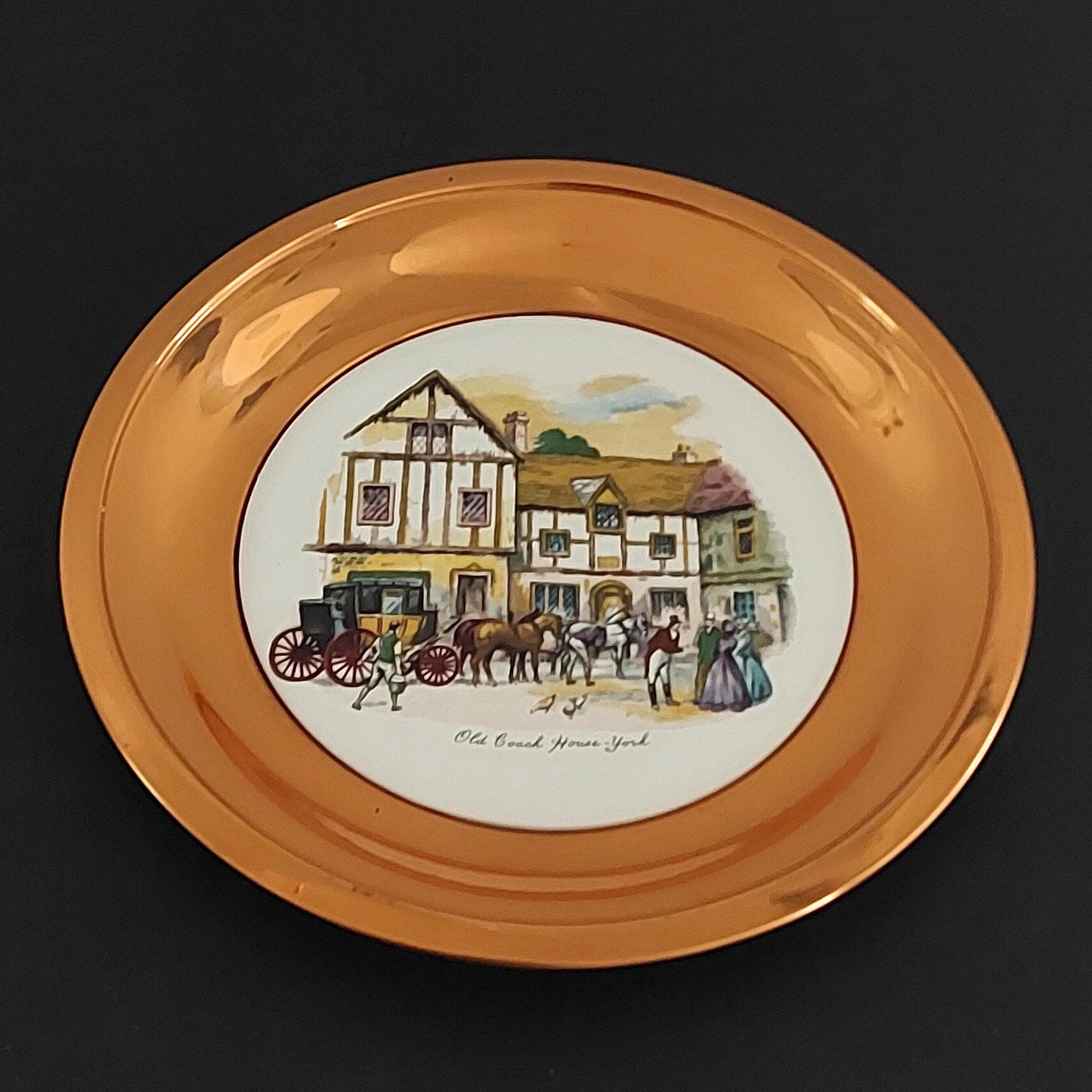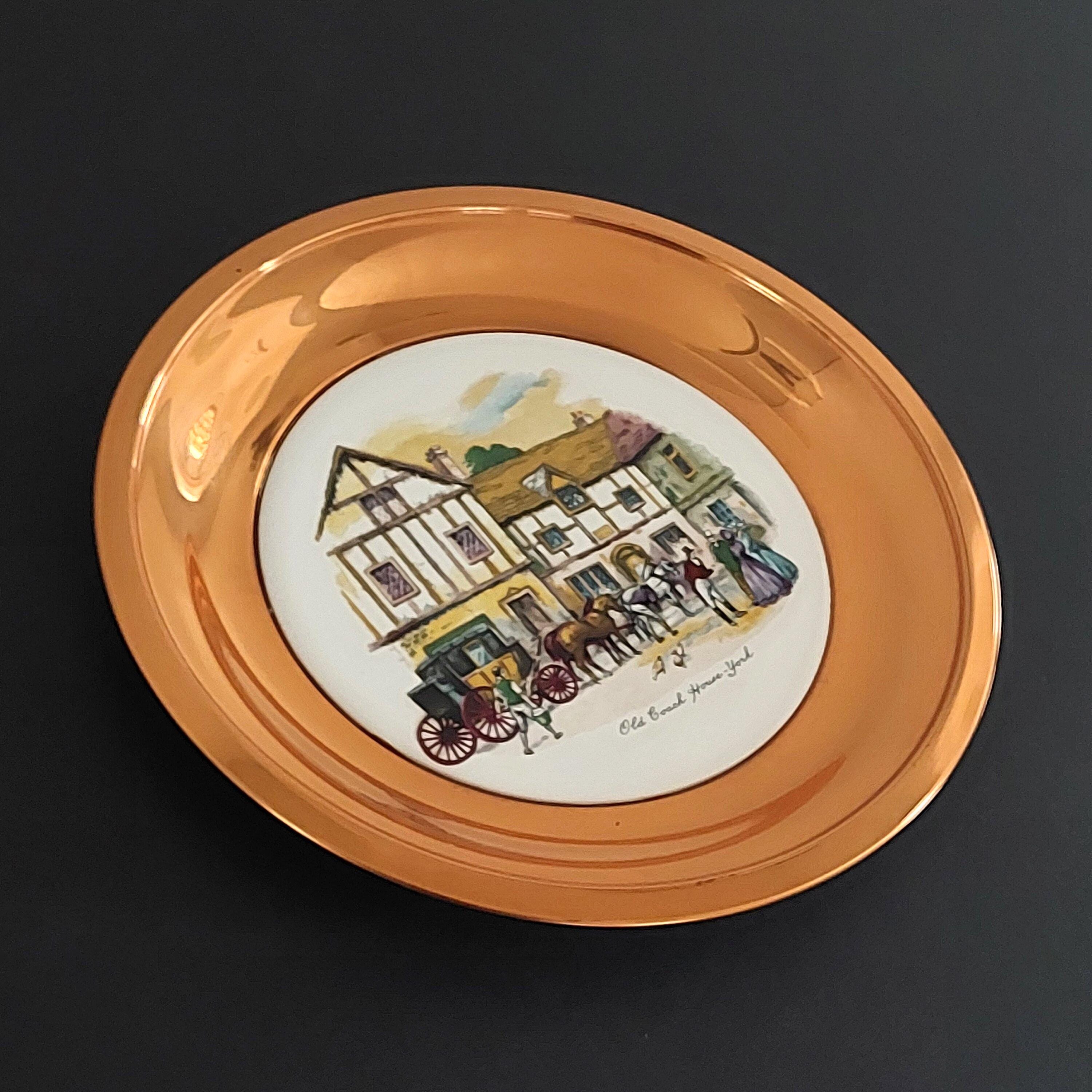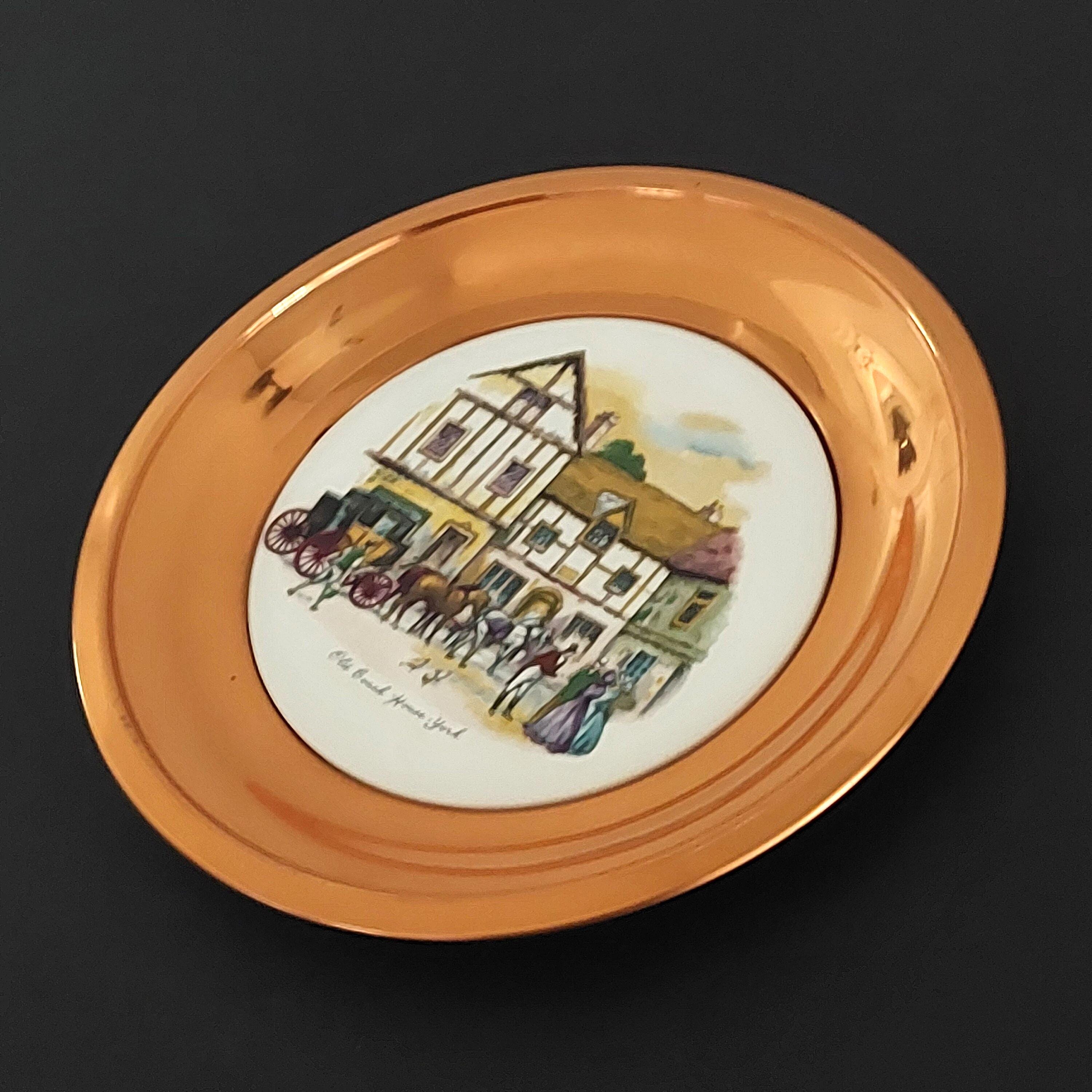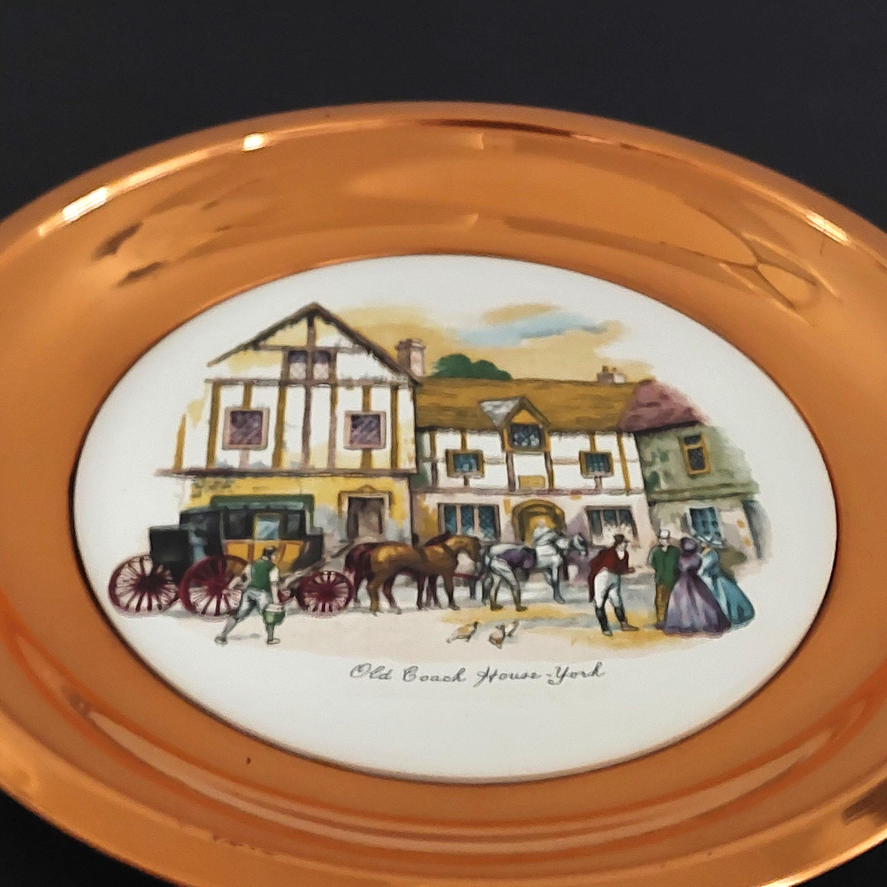 Vintage English round ceramic tile within a copper round frame. Old Coach House York scene of finely dressed ladies and a gentleman, the coachman and stable boy near a horse and carriage with an English cottage coach-house in the background. Back of tile is backed with a felt-like material.
