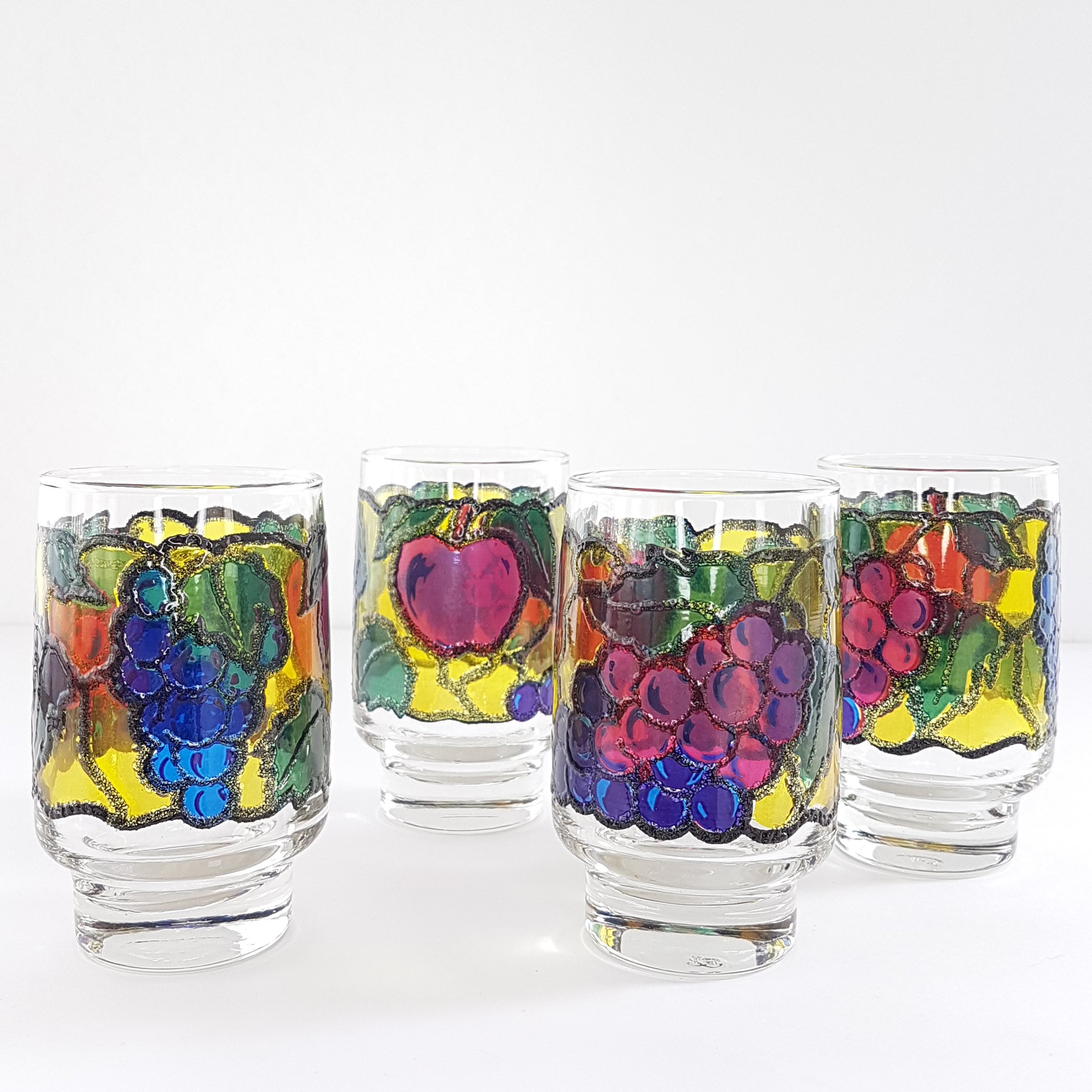 Vintage 12oz Libbey STAINED GLASS FRUIT tumblers. Sold in sets of 4. Applied stained glass fruit pattern of grapes and apples and green leaves on a yellow background.