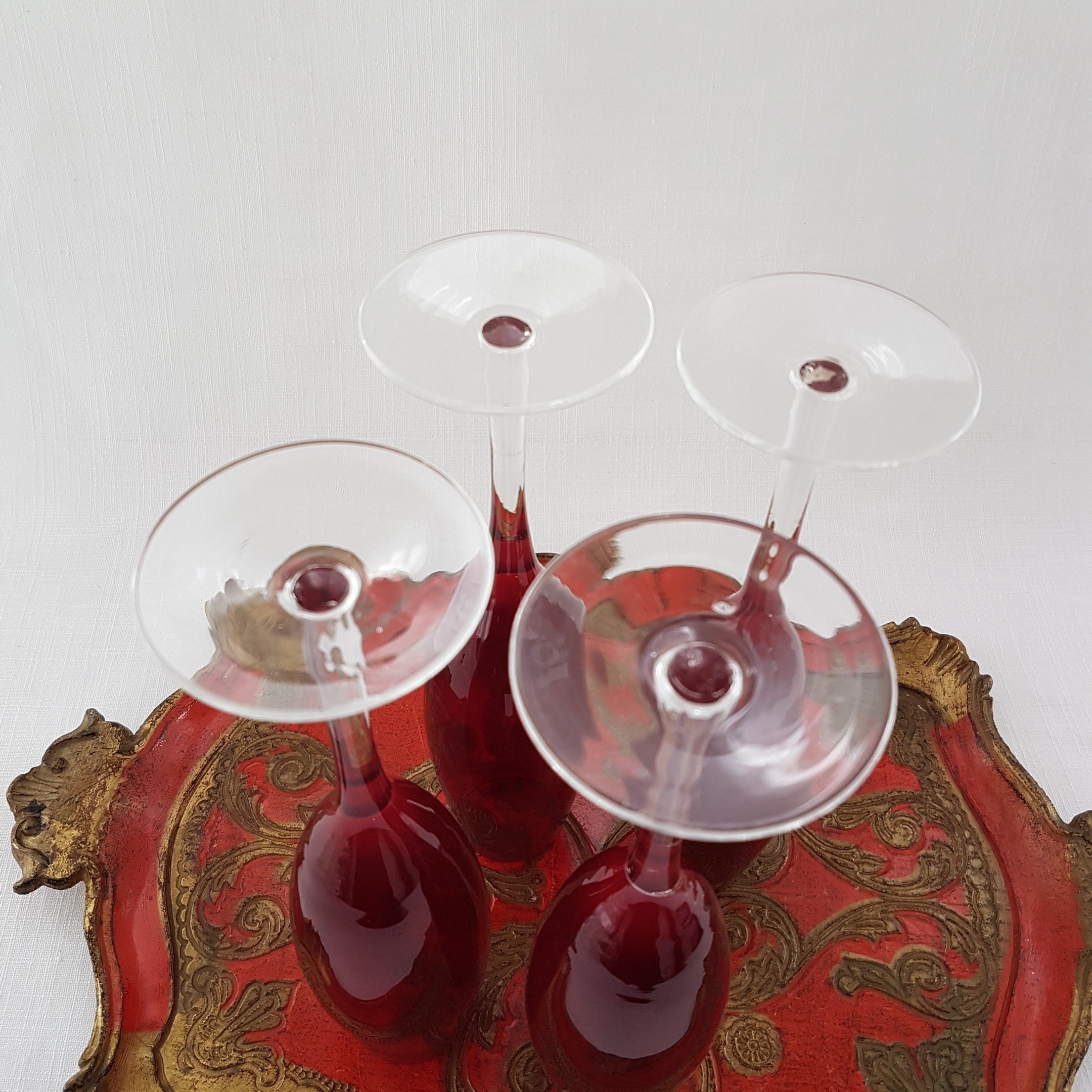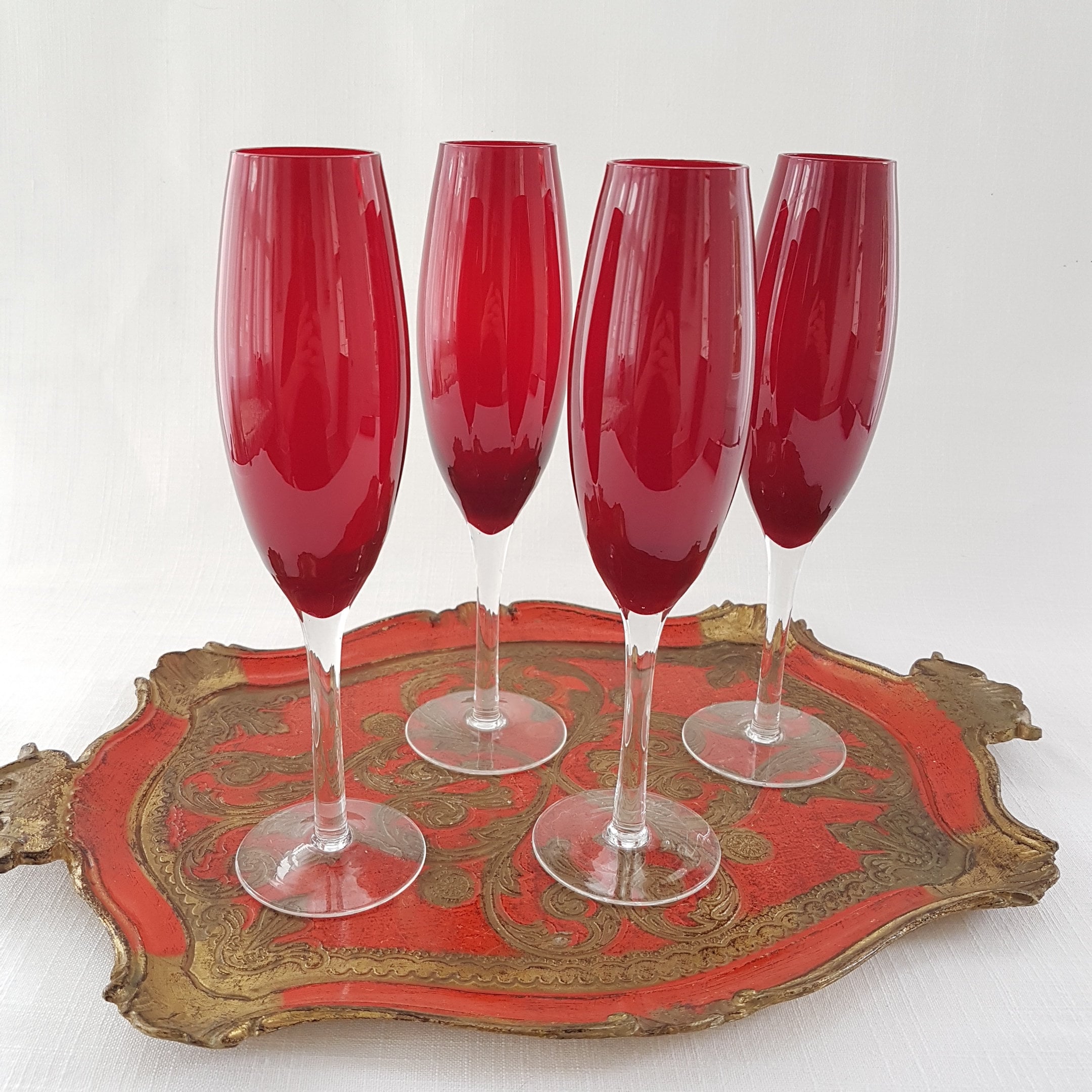 Set of 4 vintage ruby red blown glass champagne flutes with clear stem.