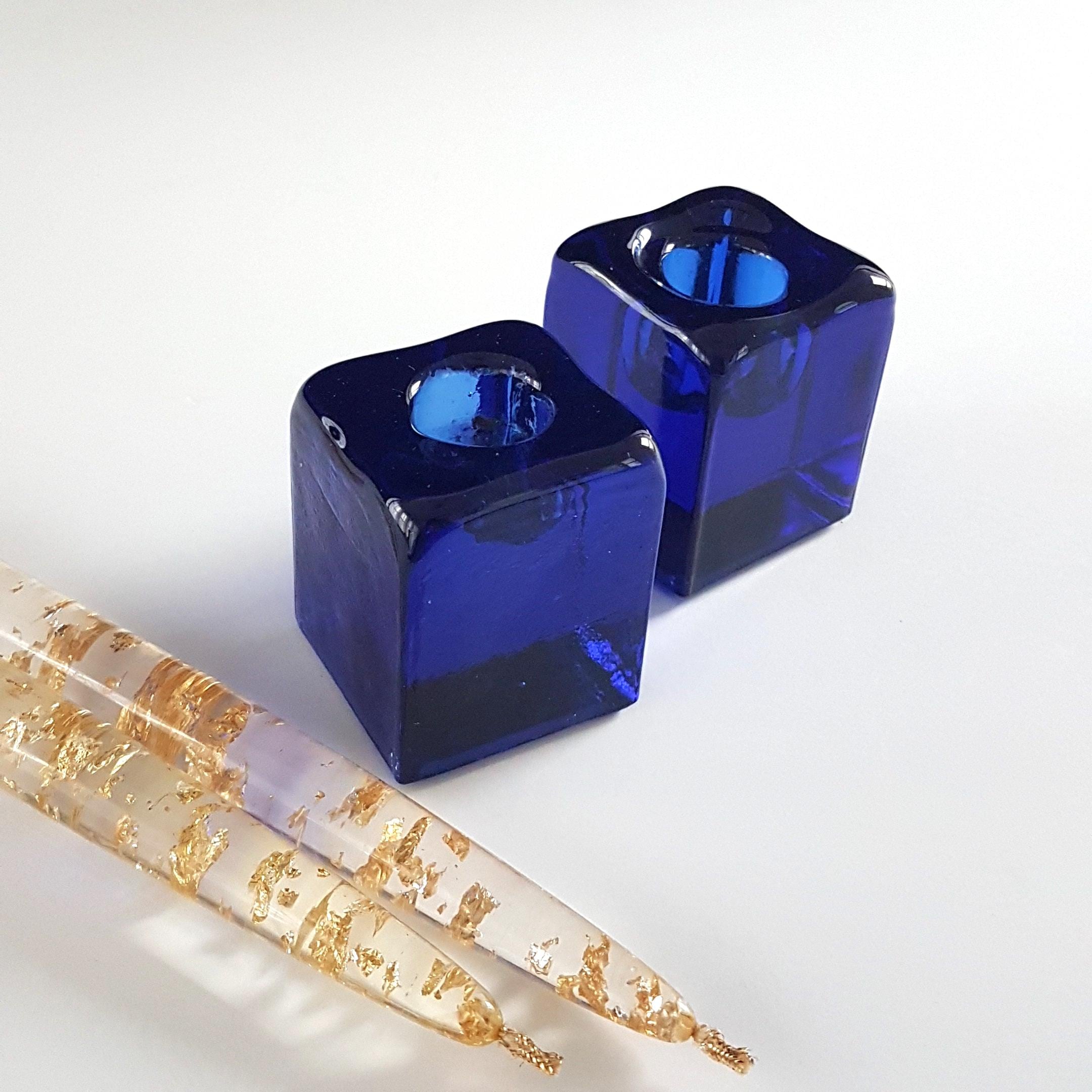 Vintage Blenko cobalt blue solid cube shaped glass taper candlestick holders.