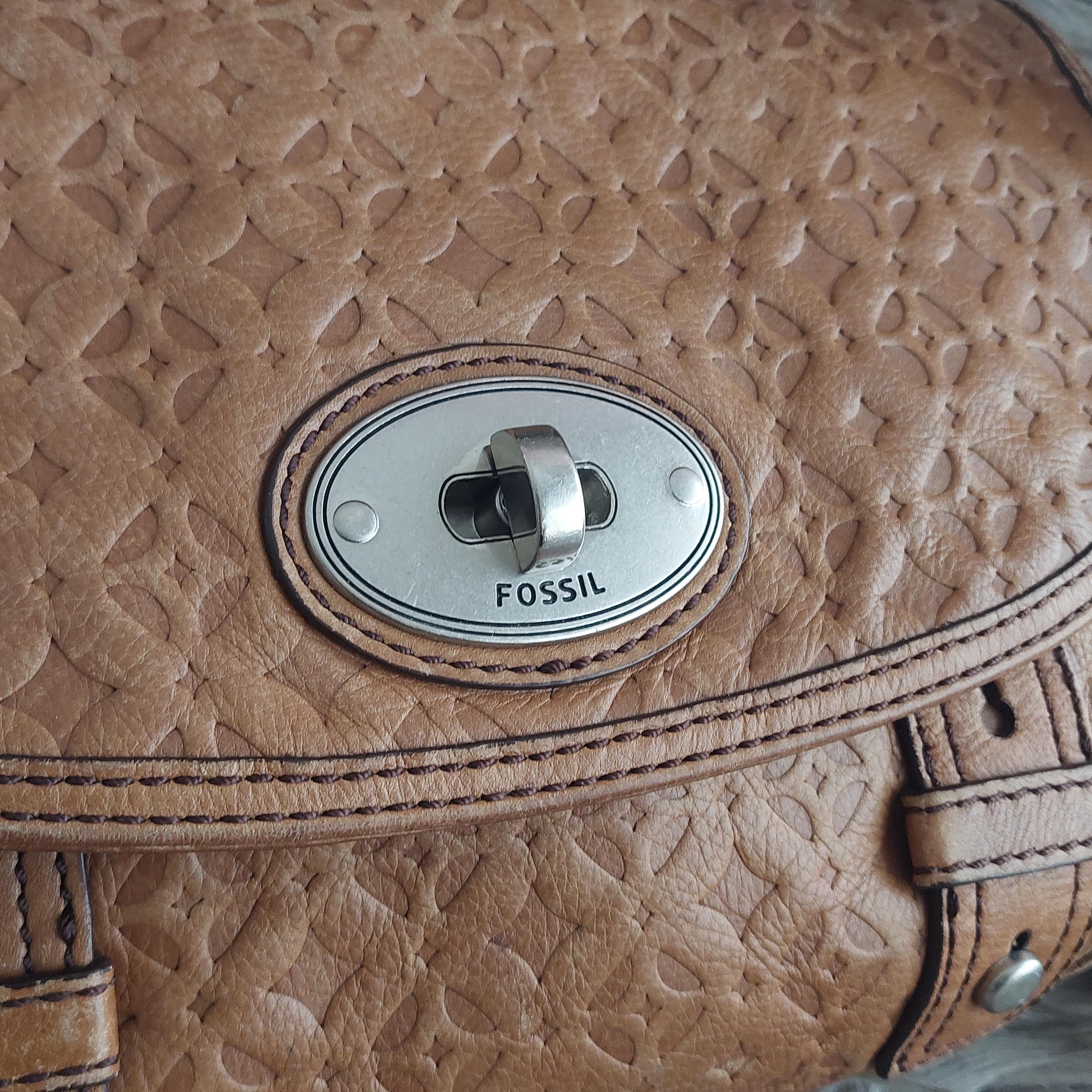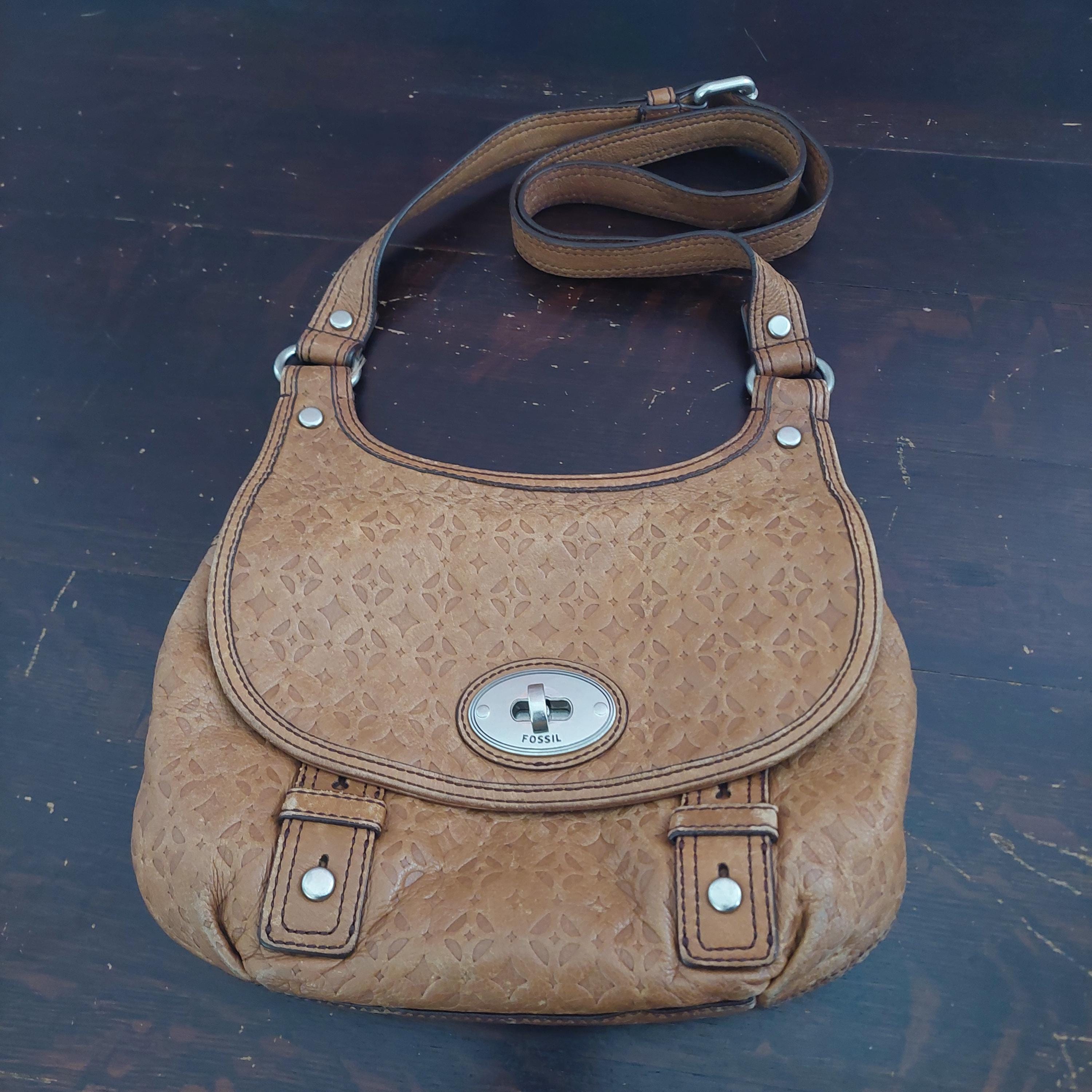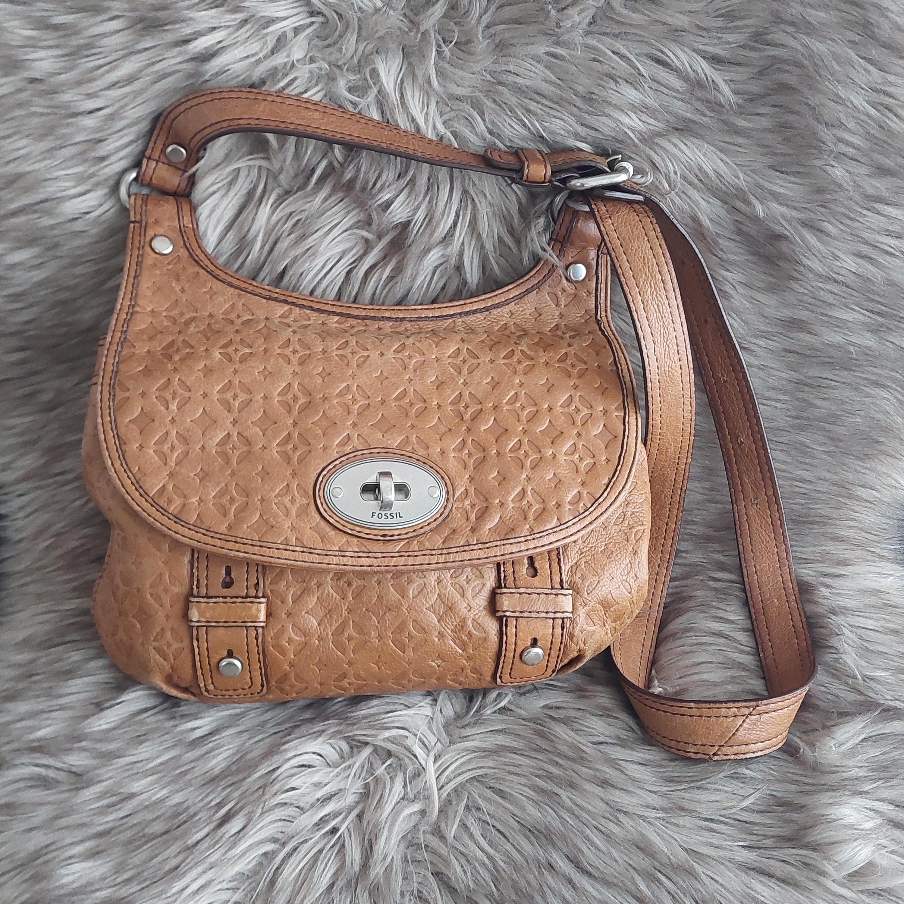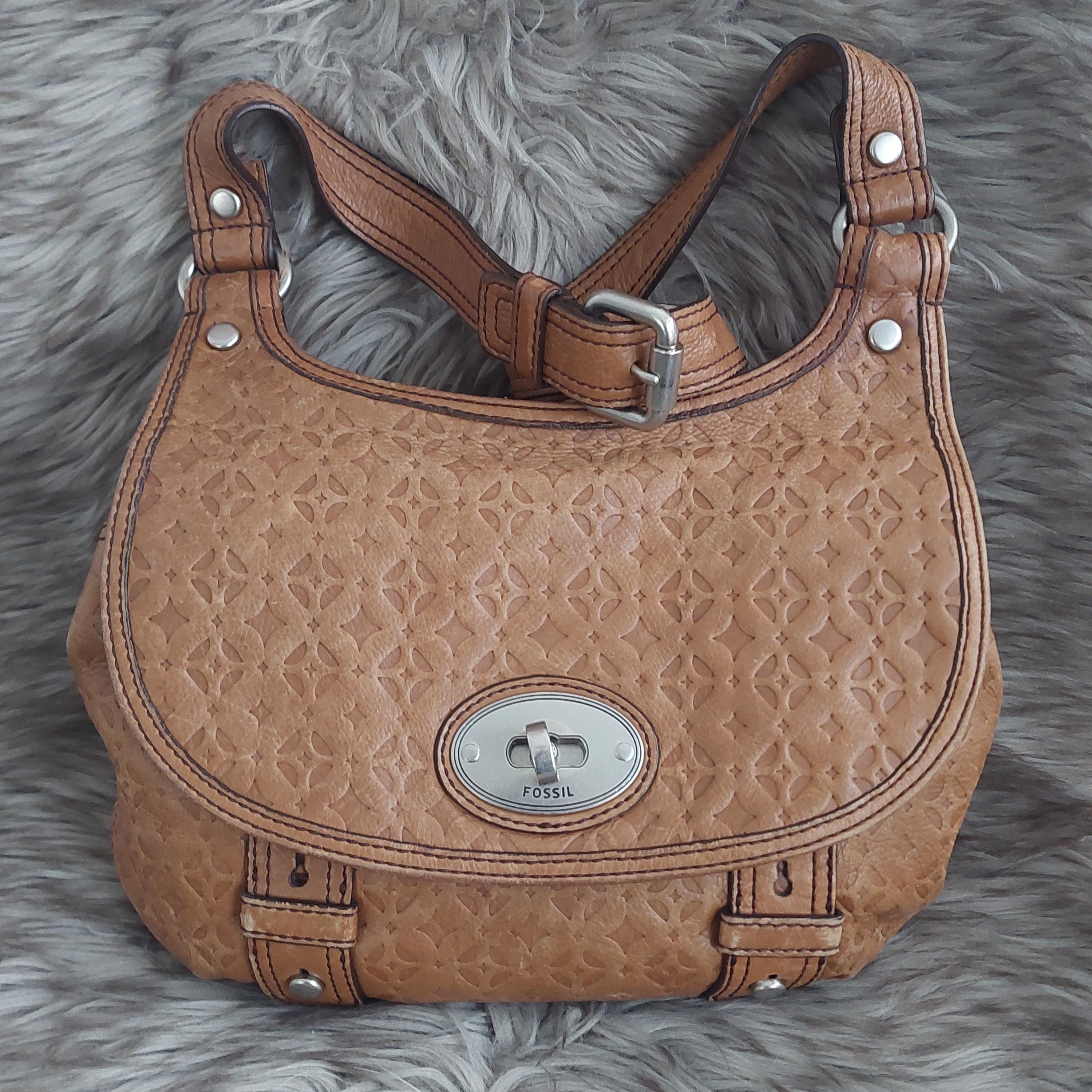 Vintage Fossil brown leather shoulder bag. Adjustable shoulder or crossbody bag. Stamped leather. Turn-lock front closure. Shoulder strap with buckle. Inside zipper has leather tab. Brown interior lining is a jacquard diamond print.
