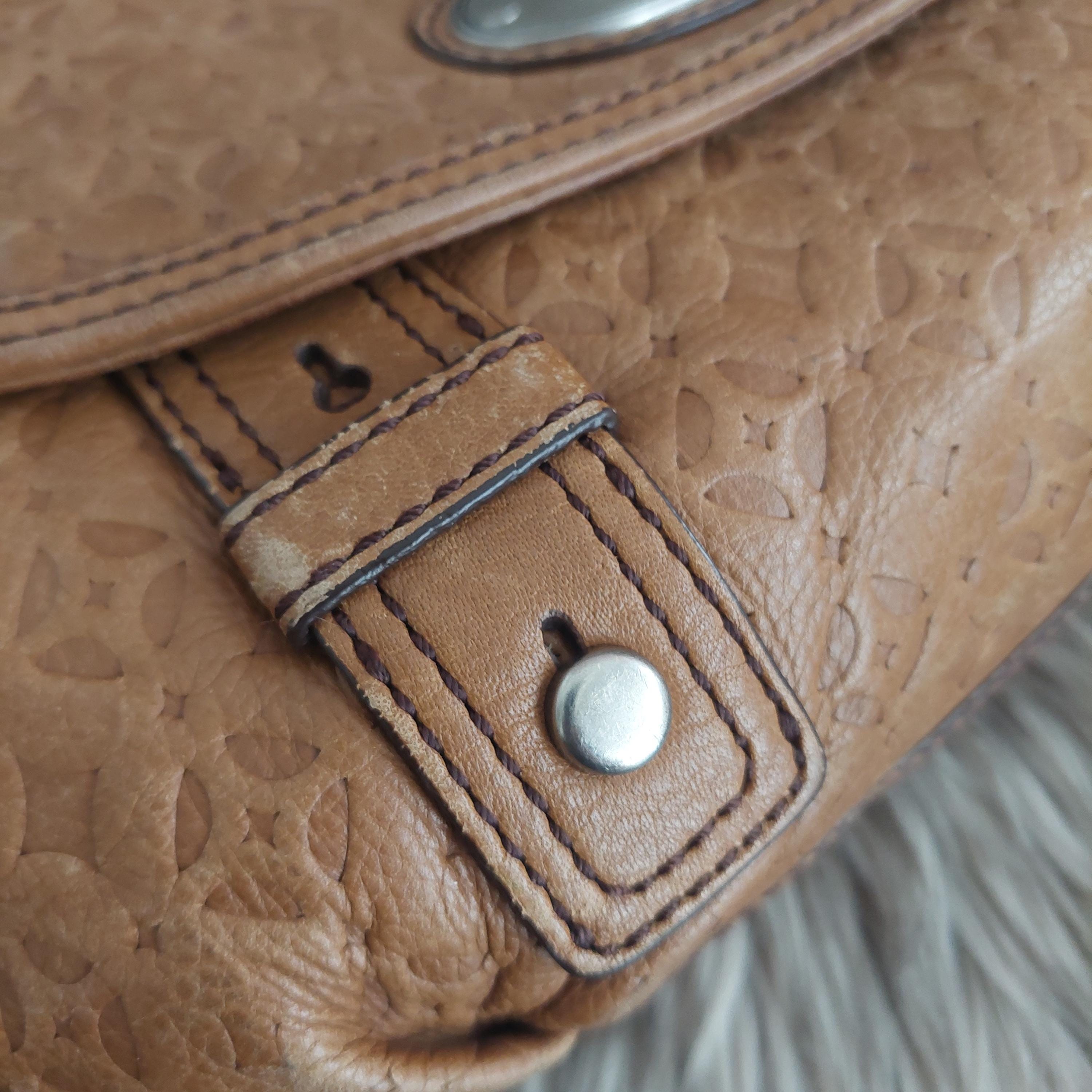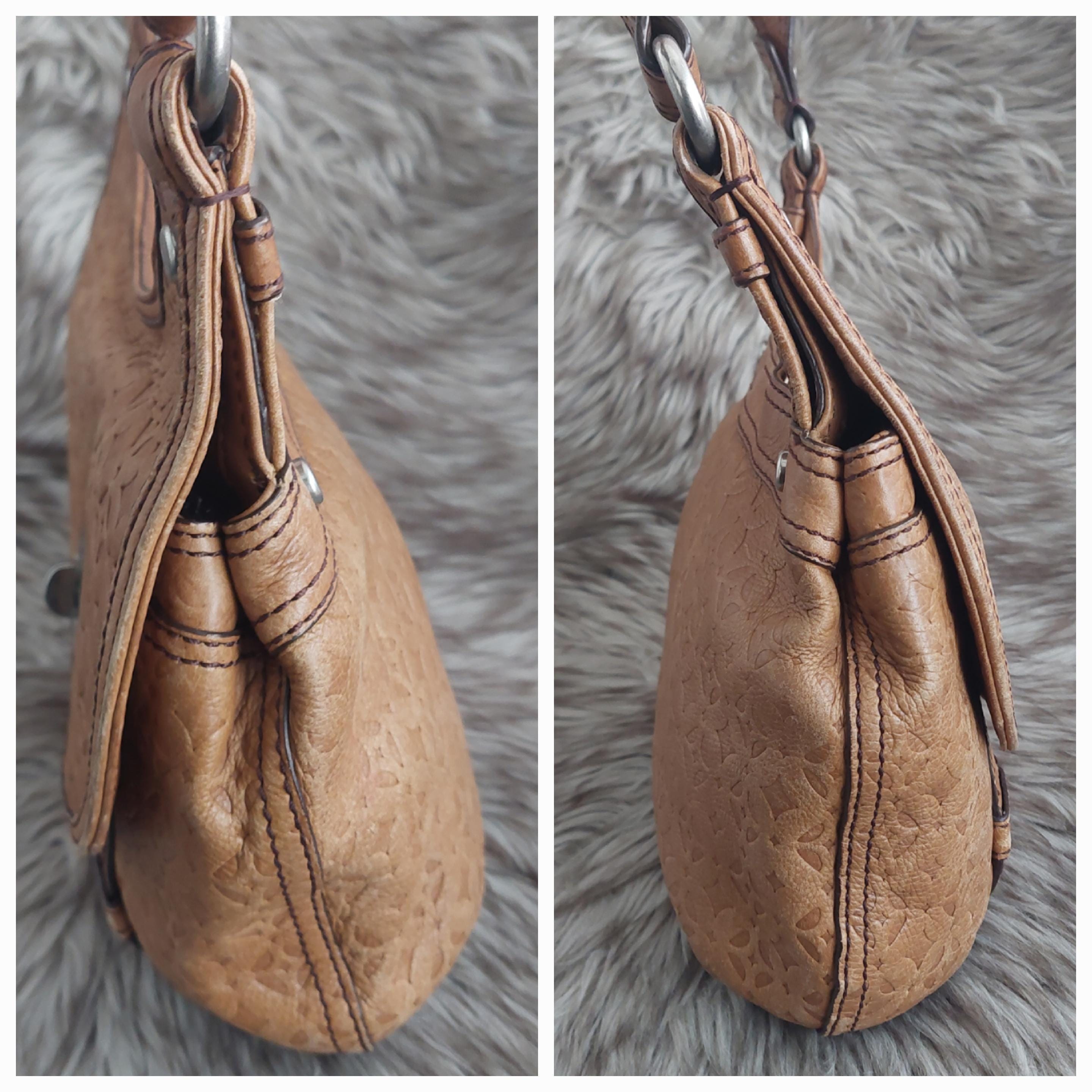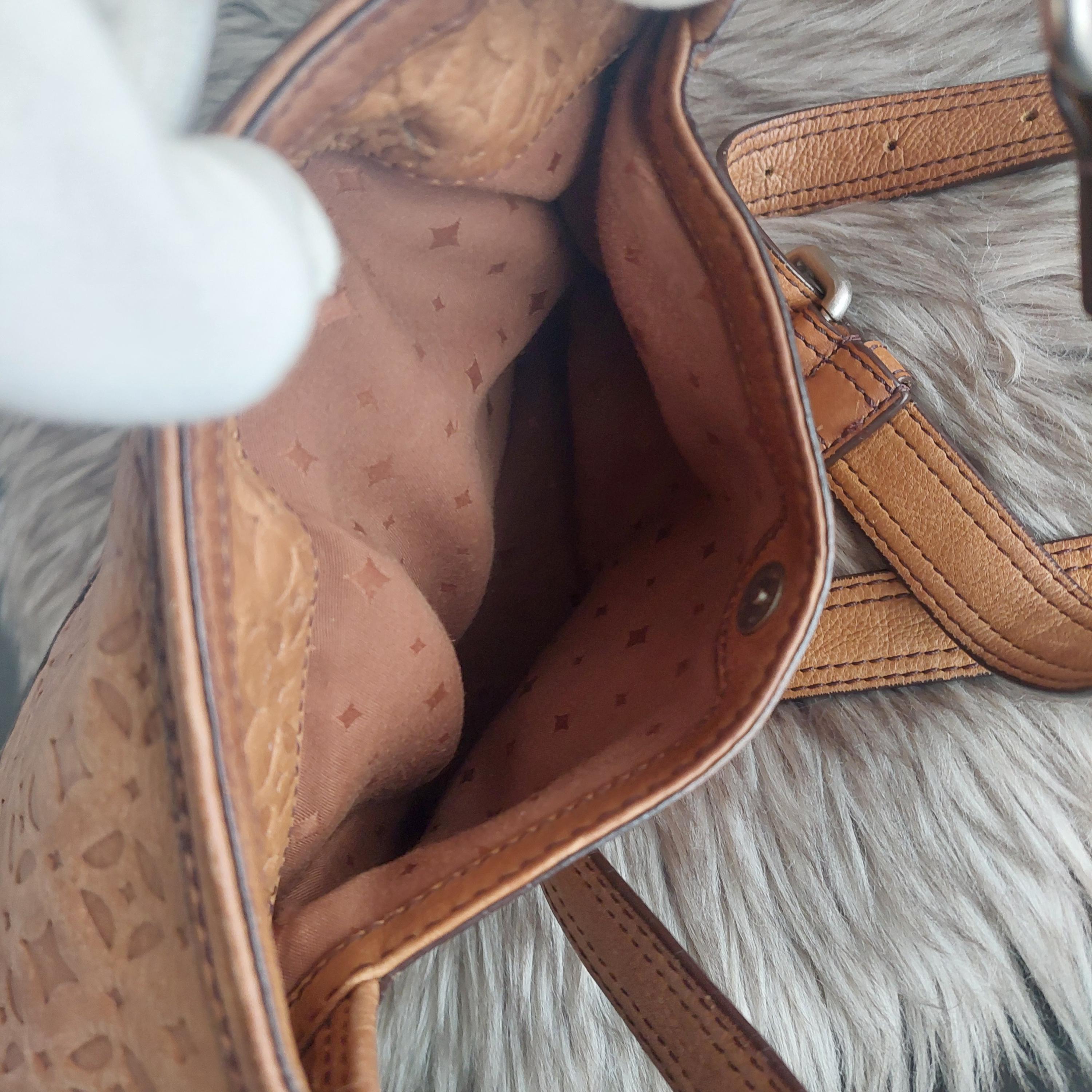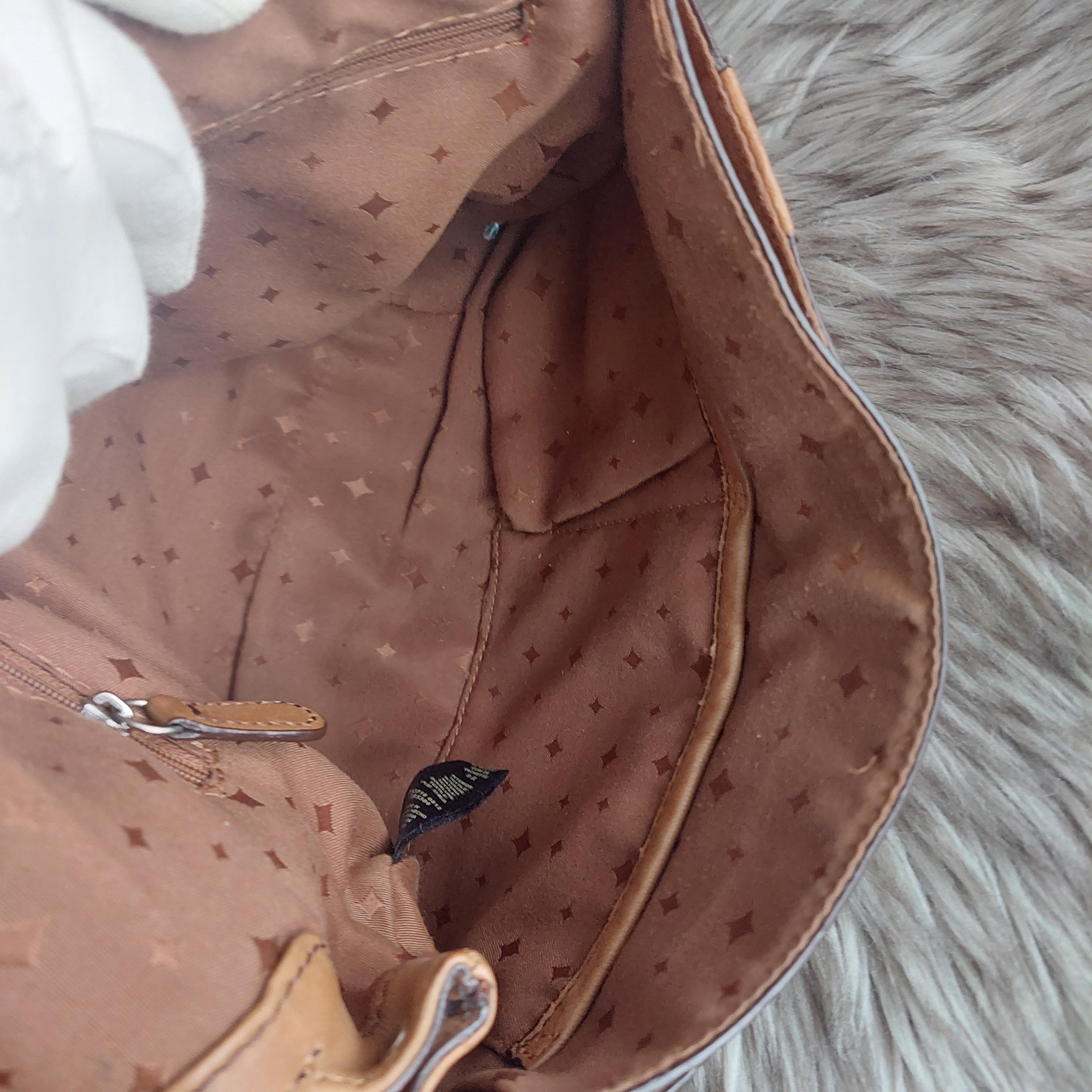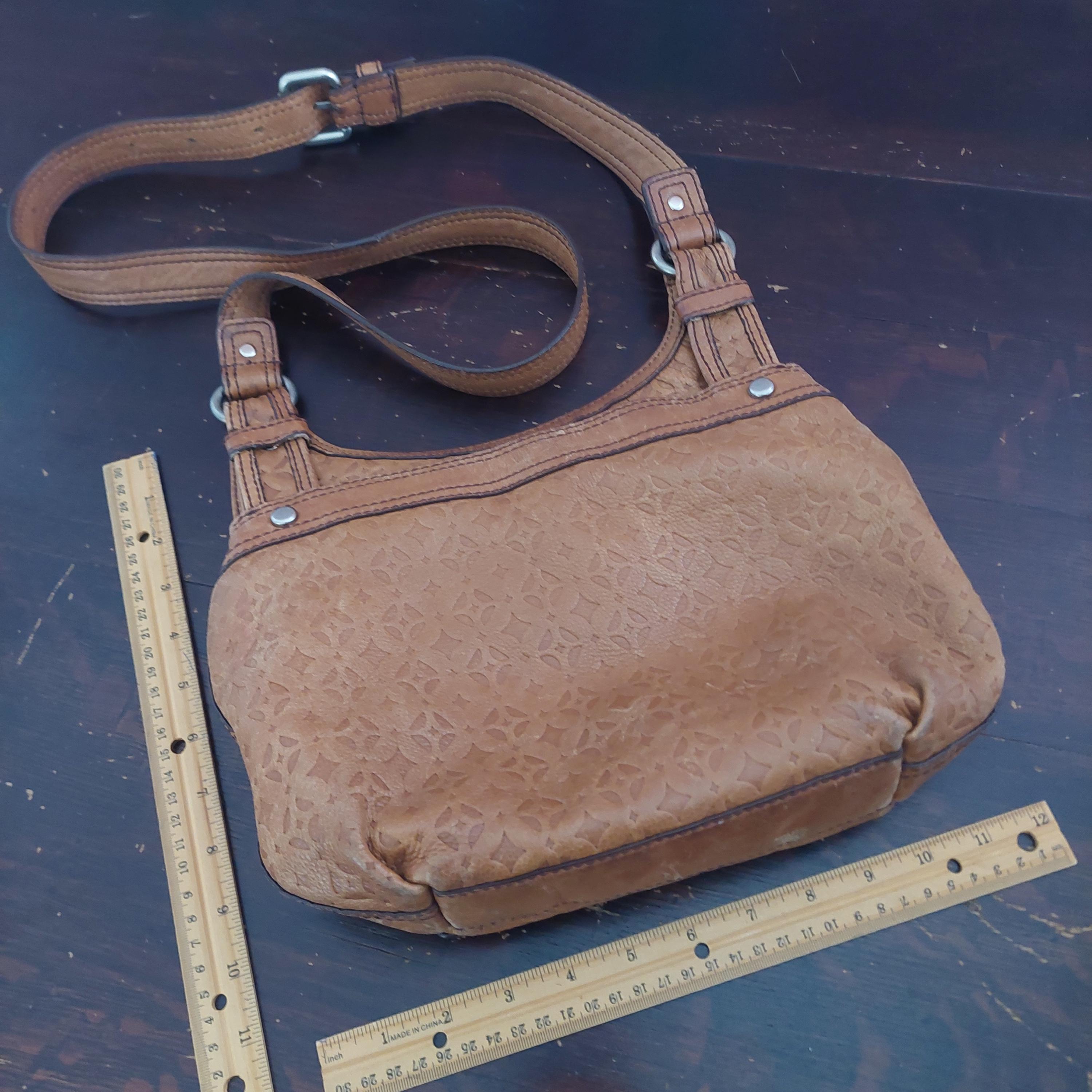 Vintage Fossil brown leather shoulder bag. Adjustable shoulder or crossbody bag. Stamped leather. Turn-lock front closure. Shoulder strap with buckle. Inside zipper has leather tab. Brown interior lining is a jacquard diamond print.