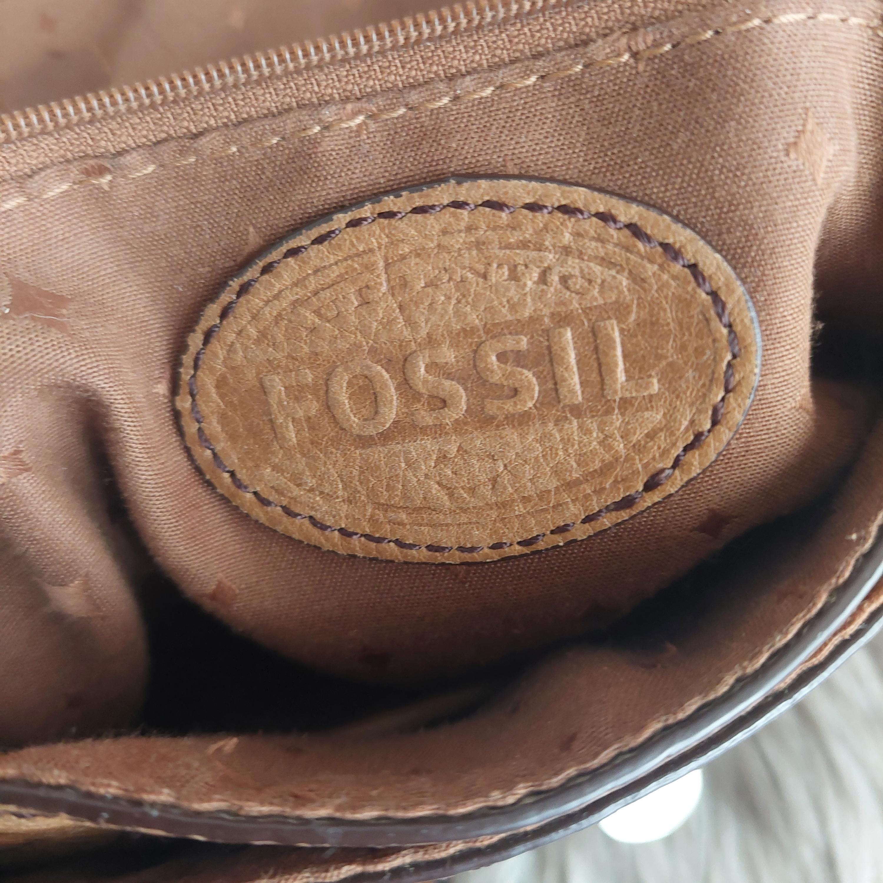 Leather sewn in FOSSIL patch on inside zippered pocket