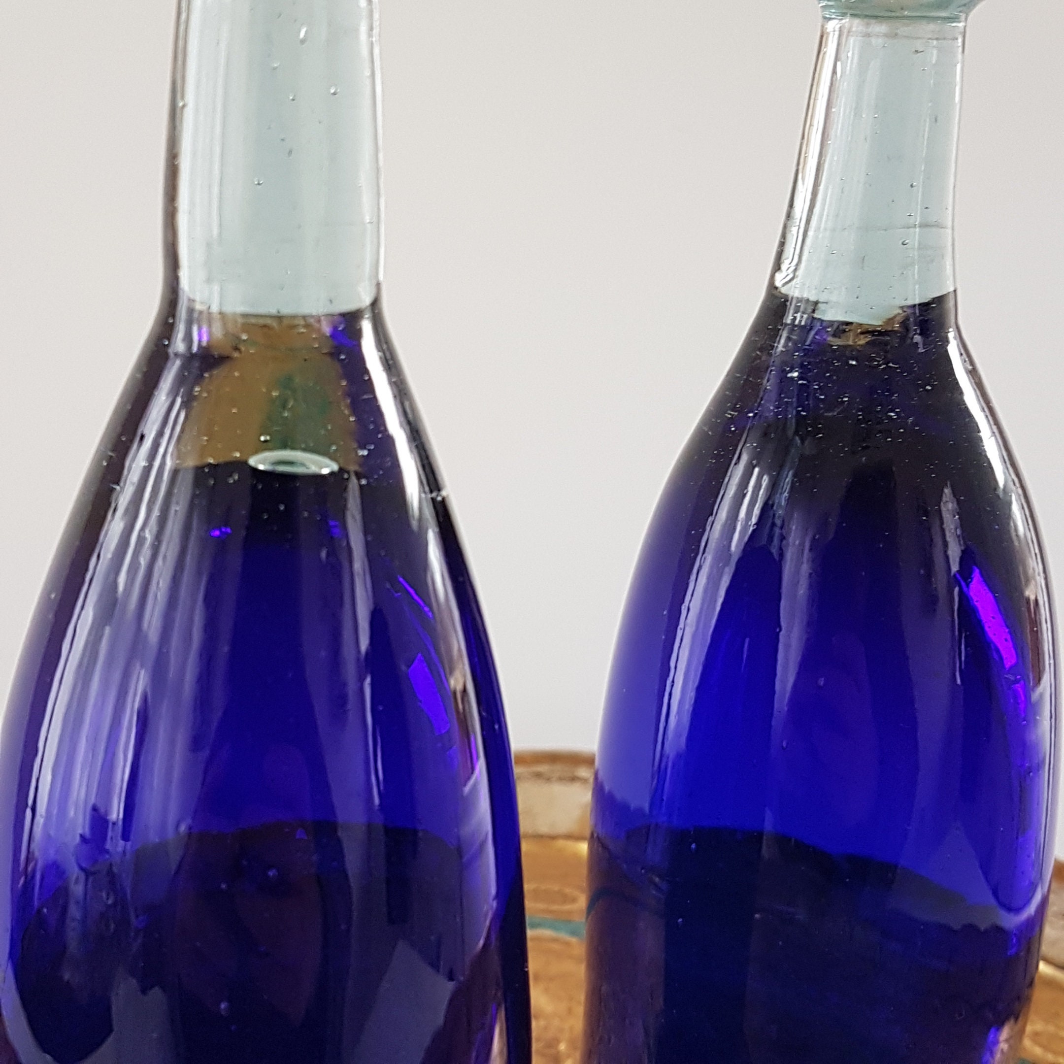 Vintage Mexican blown glass cobalt blue champagne flutes with flattened rim and clear stem. Lovely blown glass with air bubbles both large and small.