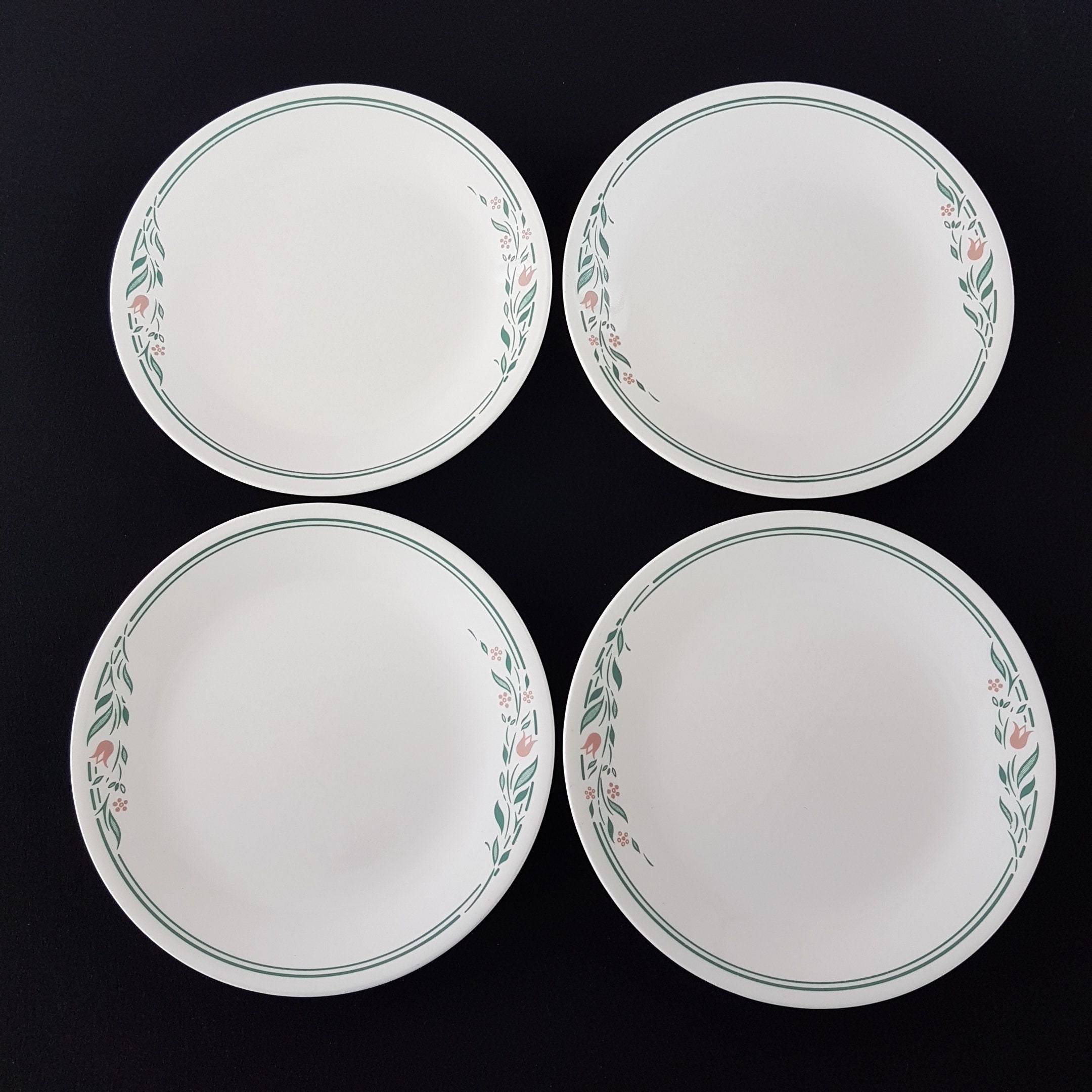 Vintage Corelle ROSEMARIE luncheon plates. Dusty rose flowers and green leaves on white. Made in USA