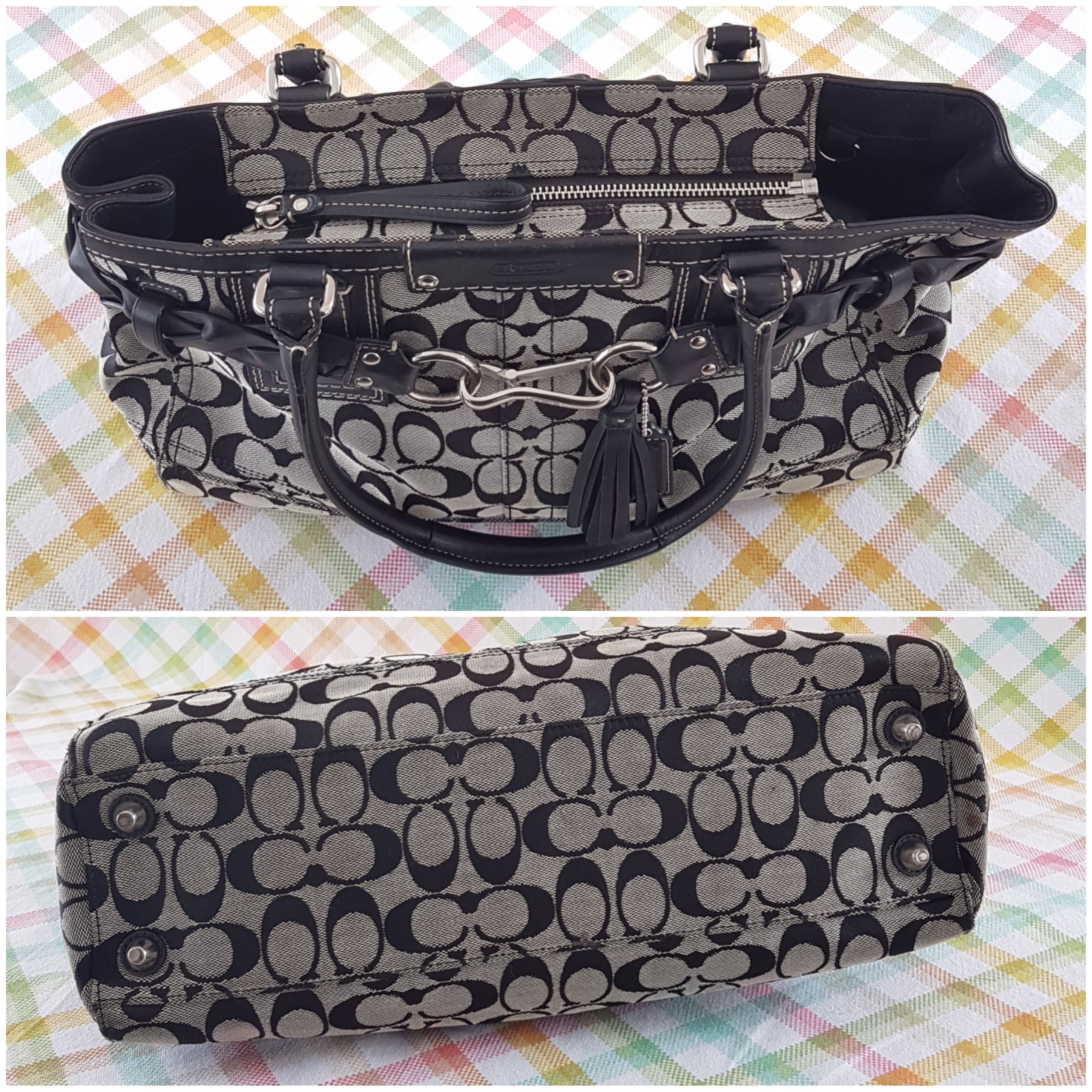 Vintage COACH signature shoulder bag in brown-black. Braided leather belt around bag. Silver COACH hardware. Leather tassel. COACH leather hangtag. Handy top zipper feature! It zippers like a coat, so the bag can completely open. Two slip pockets and one zippered.