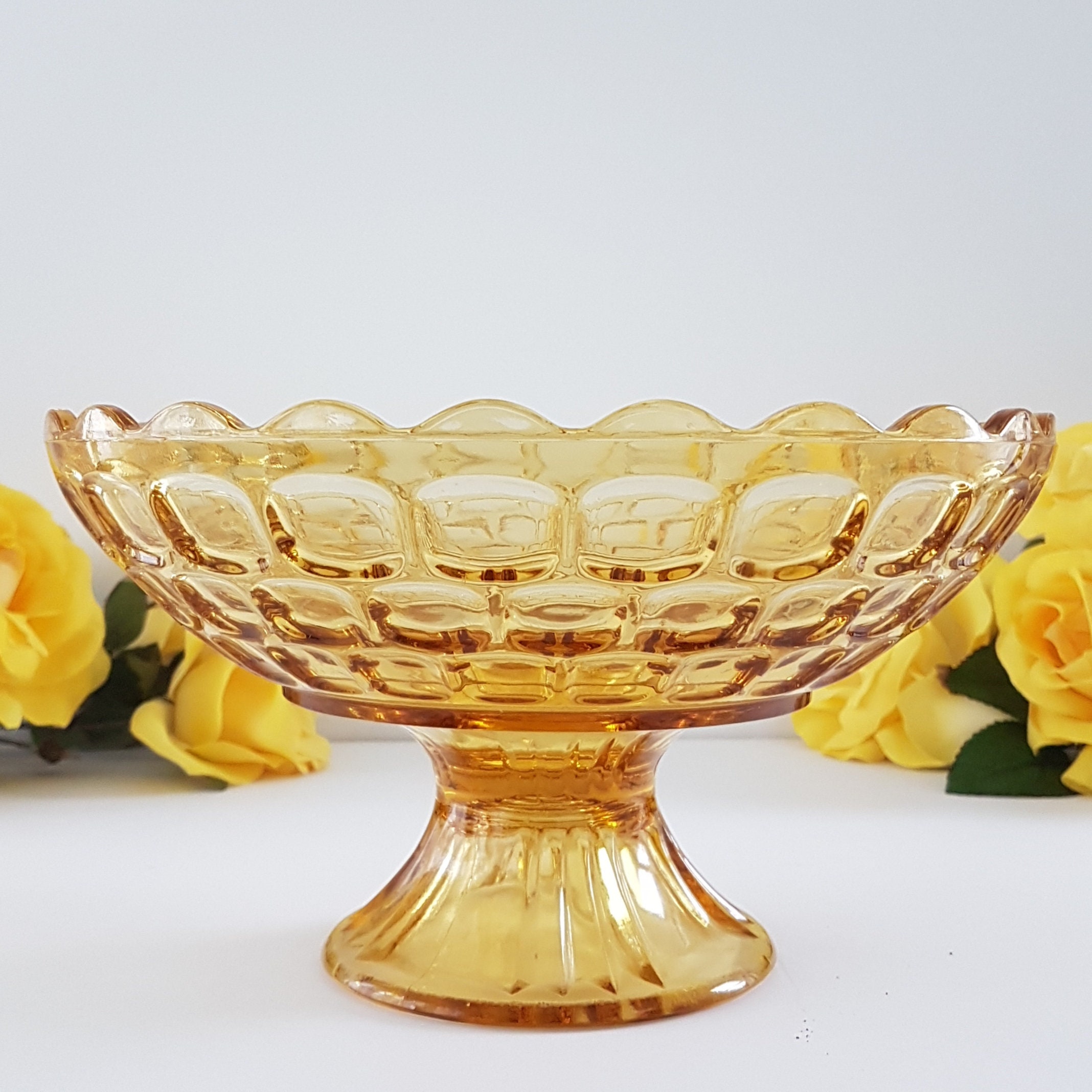 Vintage Federal Glass Thumbprint or Yorktown pedestal fruit bowl in yellow-gold